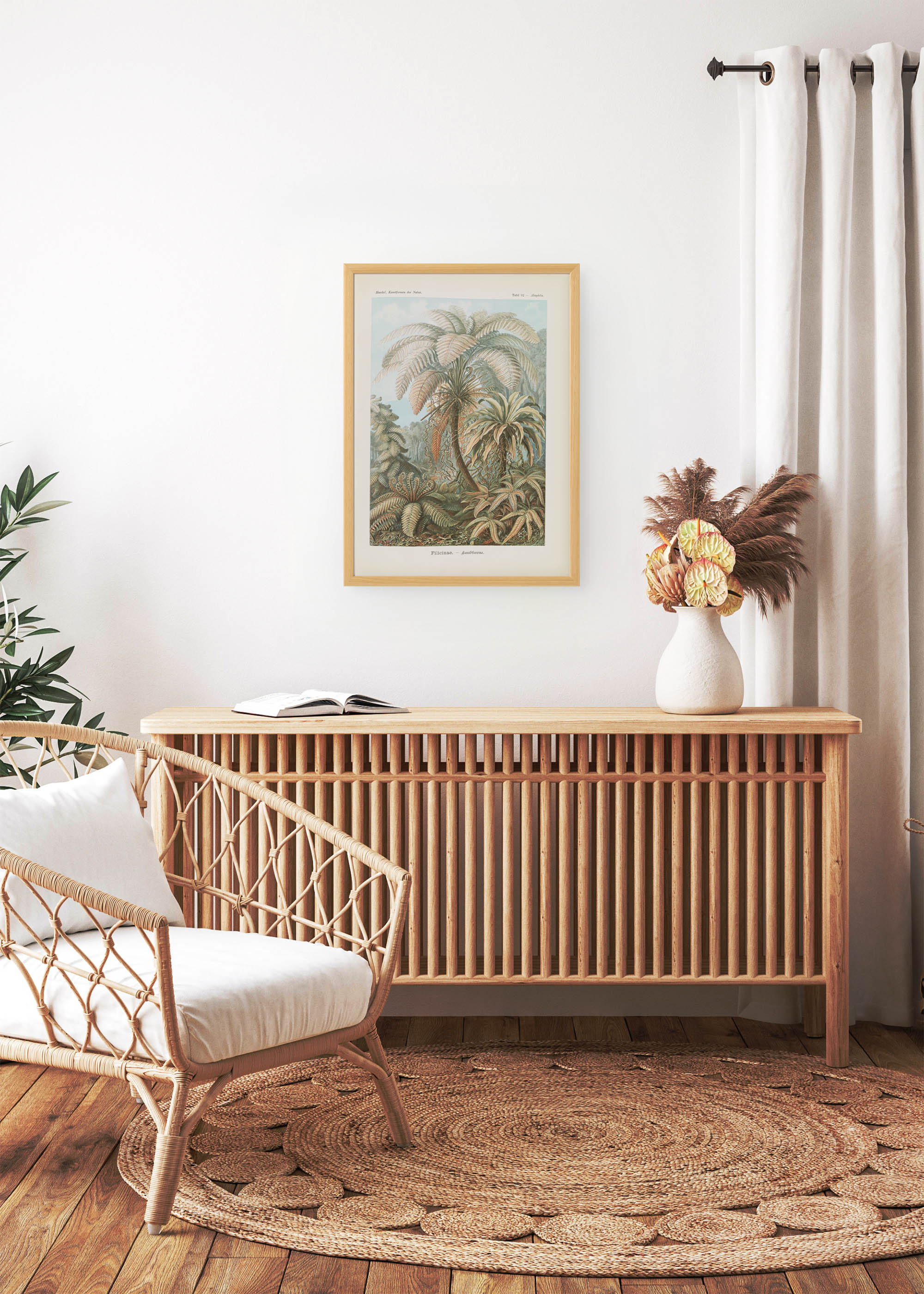 Kolorystyka tego plakatu to subtelna symfonia barw ziemi – od ciepłych, piaskowych beży poprzez oliwkową zieleń po delikatne tony sjenowe. Tło utrzymane jest w bladym błękicie, który przywodzi na myśl tropikalne niebo o poranku. Miedziane akcenty na liściach paproci dodają kompozycji głębi i życia, podczas gdy kremowe odcienie nadają całości szlachetnej elegancji.