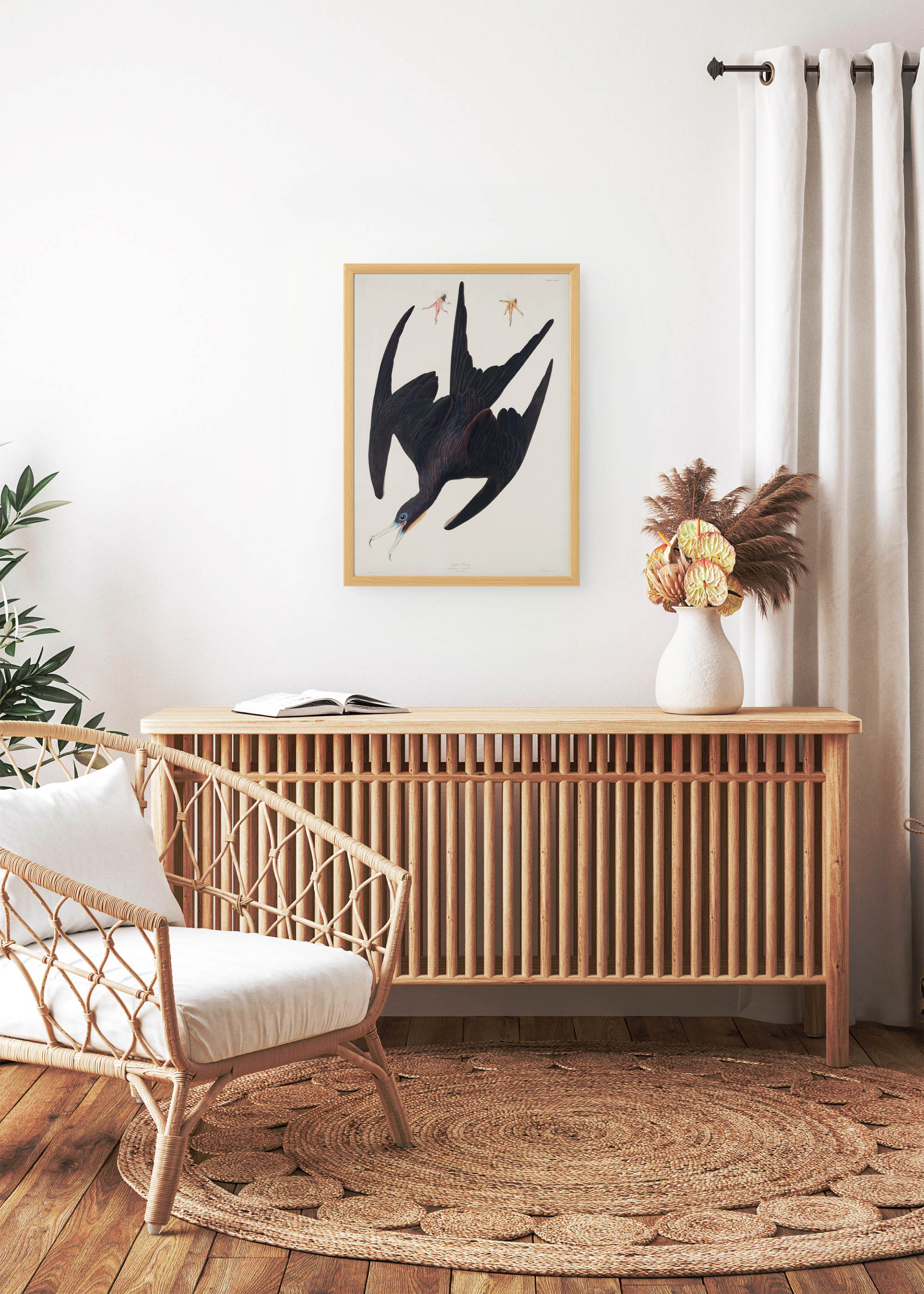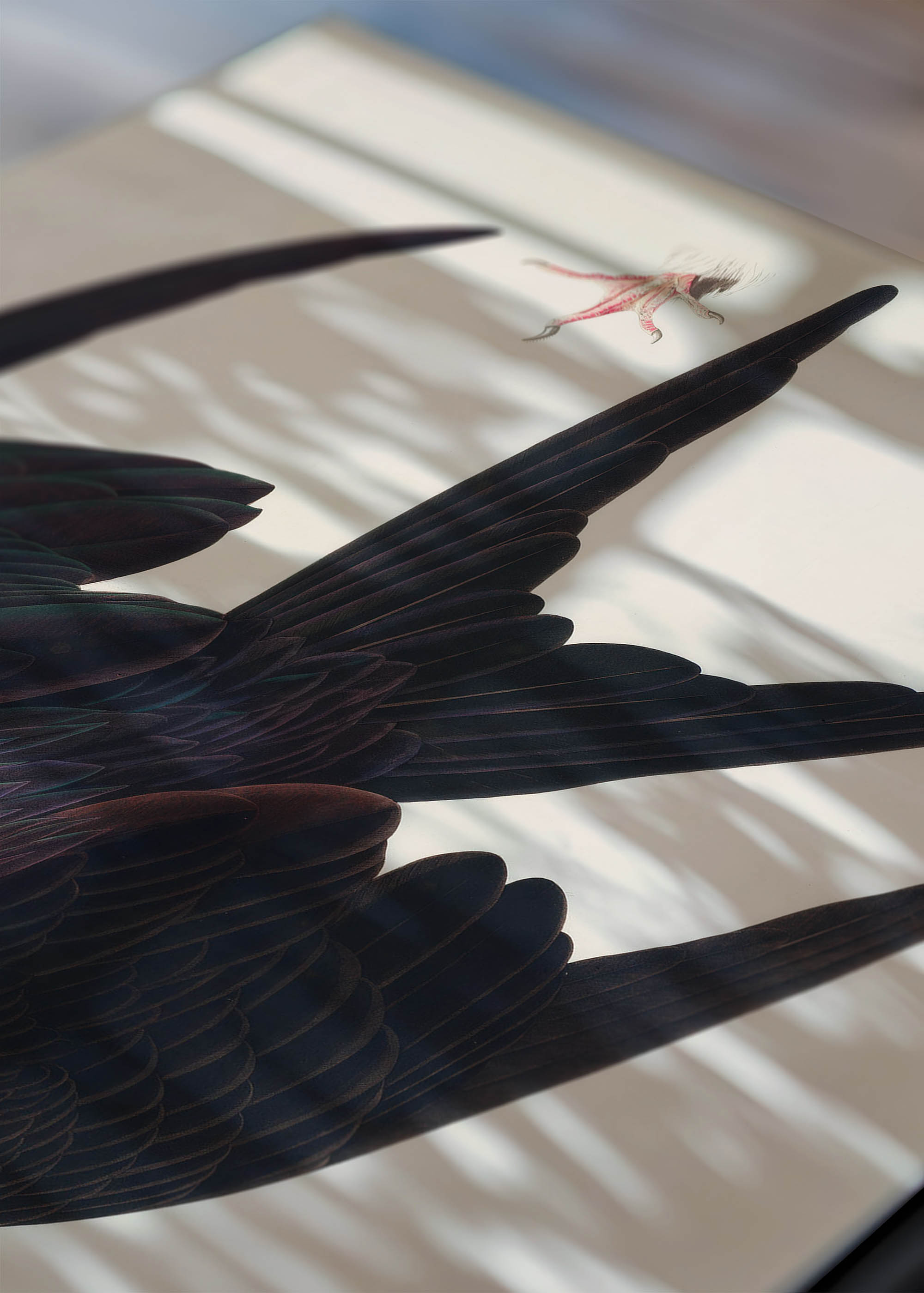 Dominująca na plakacie fregata wspaniała (Fregata magnificens) ukazana została w charakterystycznej pozie pikującej, z rozpostartymi skrzydłami o imponującej rozpiętości. Głębokie, atramentowe tony upierzenia kontrastują z kremowym tłem, tworząc kompozycję pełną dramatyzmu. Czerń skrzydeł przechodzi subtelnie w odcienie grafitu i antracytu, z delikatnymi refleksami w tonach bakłażanowych i butelkowej zieleni. Akcent stanowi turkusowe obramowanie oka oraz pomarańczowy worek garłowy – cechy charakterystyczne samca tego gatunku.