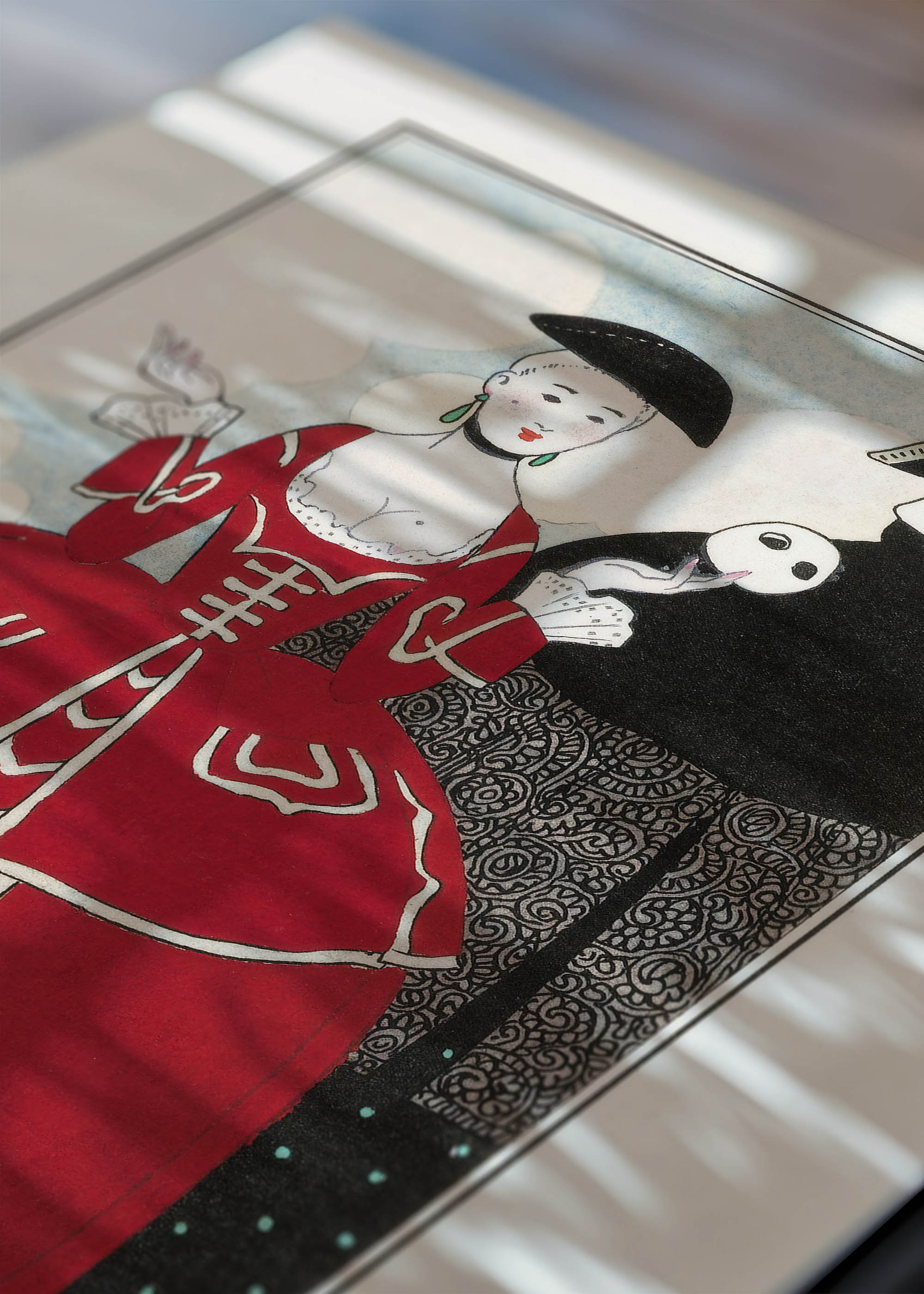 Ten wyjątkowy wzór od Plakatello idealnie sprawdzi się w klasycznych wnętrzach urządzonych w stylu francuskim lub angielskim. Będzie doskonałym dopełnieniem salonu z ciemnymi meblami i złotymi dodatkami, gabinetu z biblioteką czy eleganckiej sypialni w odcieniach burgunda i granatu. Plakat ten wprowadzi do pomieszczenia atmosferę paryskich salonów i arystokratycznego wyrafinowania, stanowiąc prawdziwą ozdobę dla miłośników sztuki secesyjnej i ilustracji modowej początku XX wieku.