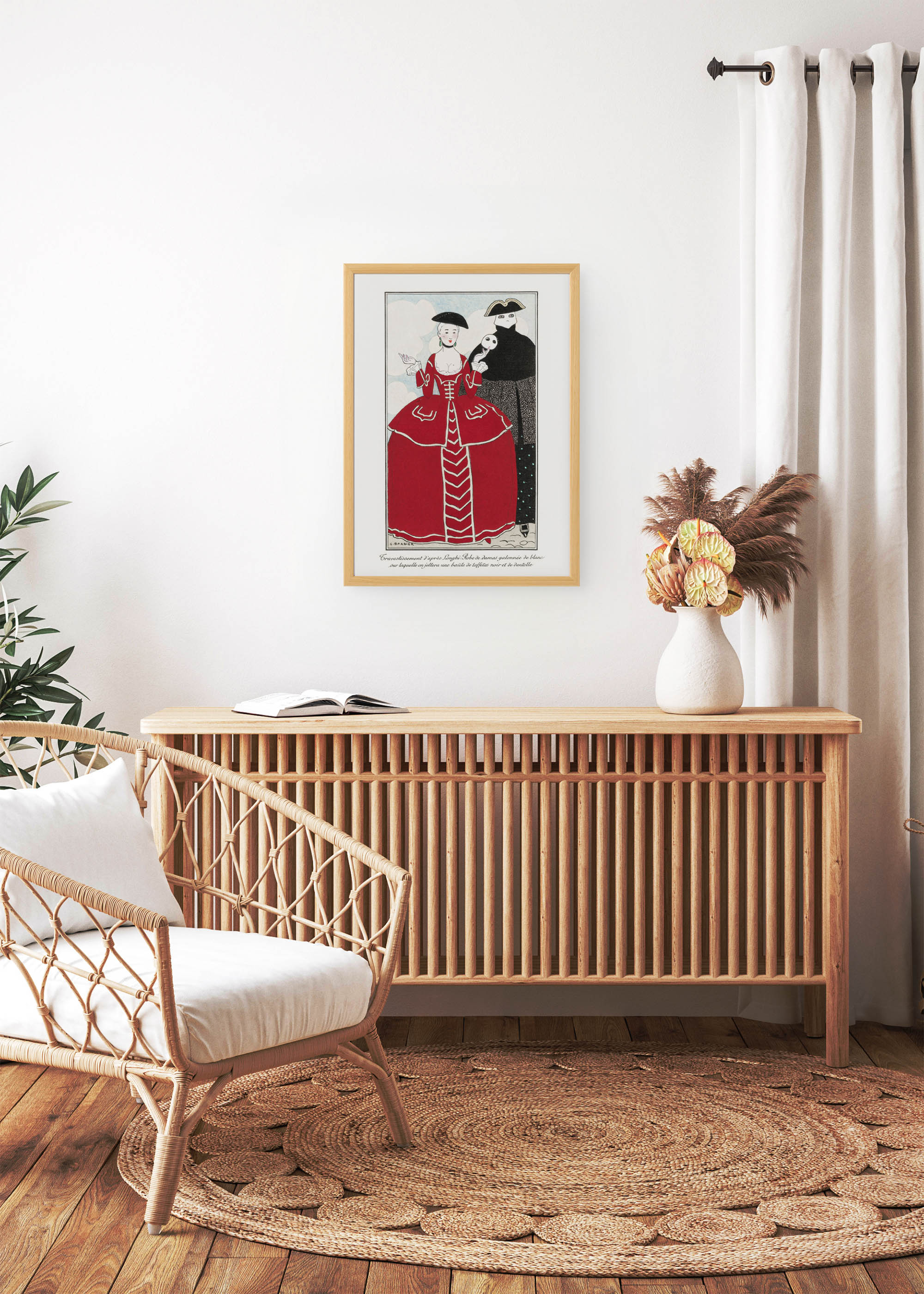 Na plakacie widzimy parę w kostiumach z epoki rokoko – damę w okazałej karmazynowej sukni z białymi lamówkami oraz tajemniczego kawalera w czarnym stroju z bogato zdobionym tricorne. Kolorystyka opiera się na kontrastach: głęboka, niemal rubinowa czerwień sukni zestawiona została z atramentową czernią męskiego kostiumu. Delikatne akcenty bieli i kremowe tony skóry tworzą harmonijny balans, podczas gdy błękitne niebo w tle nadaje całości lekkości.
