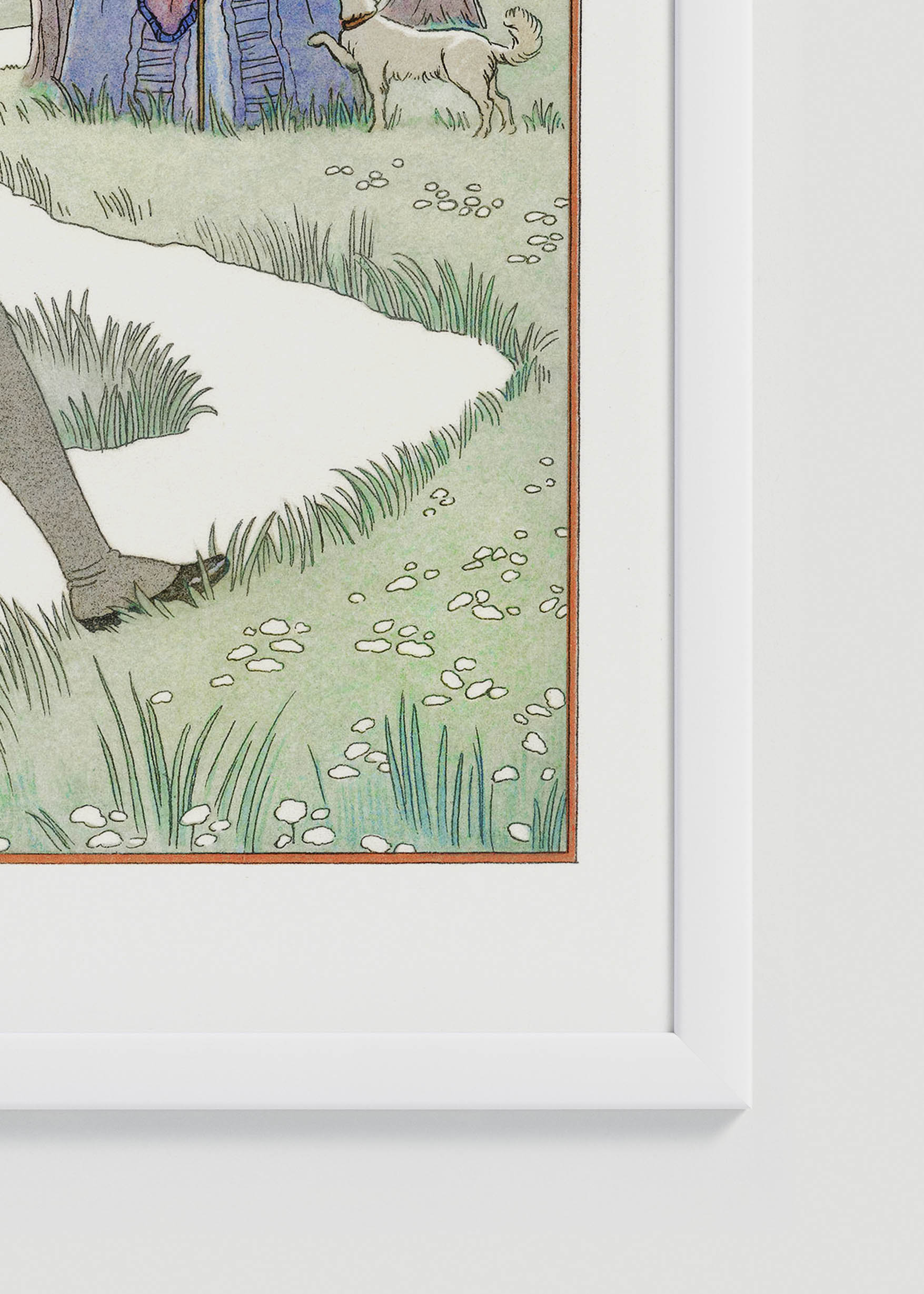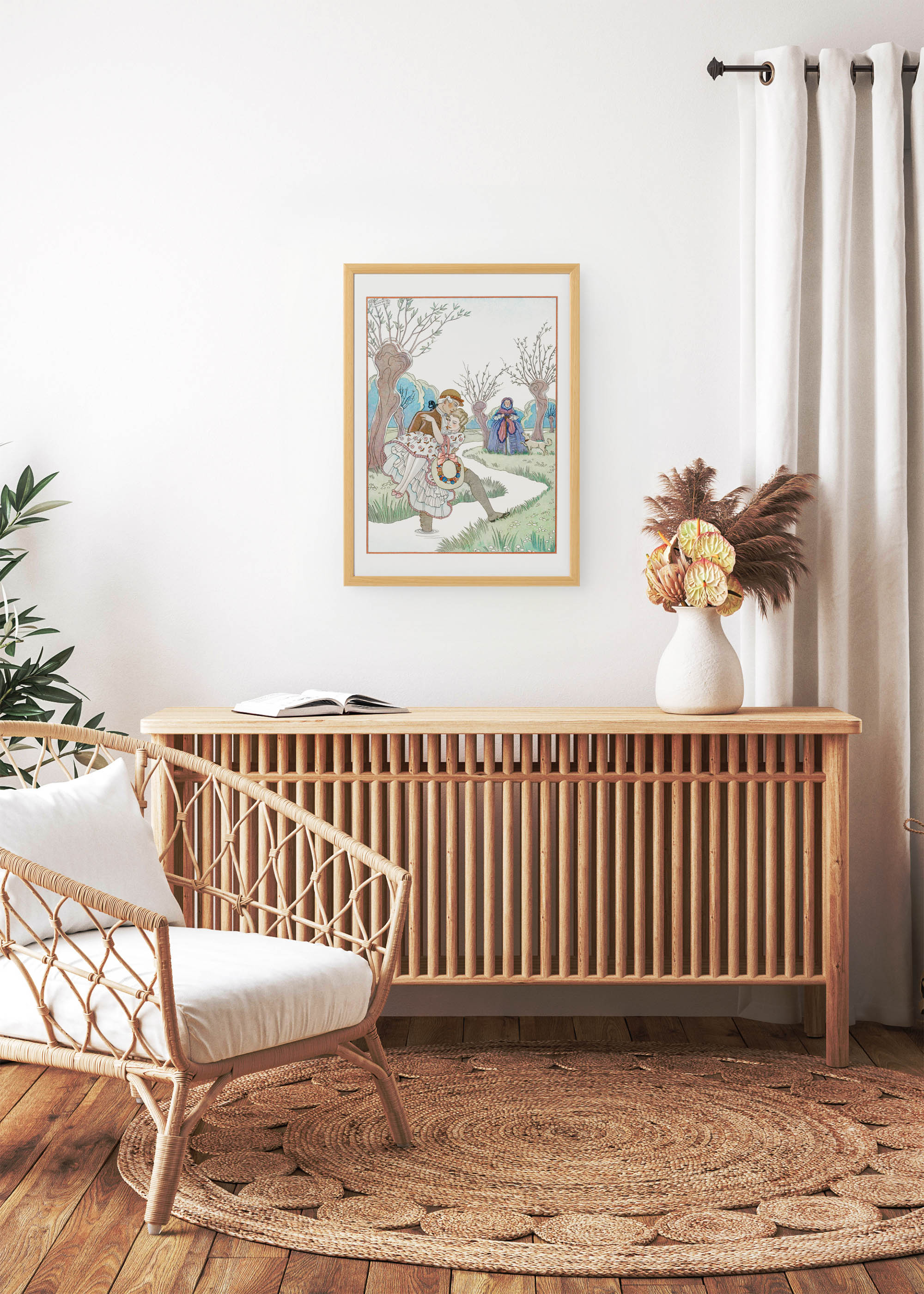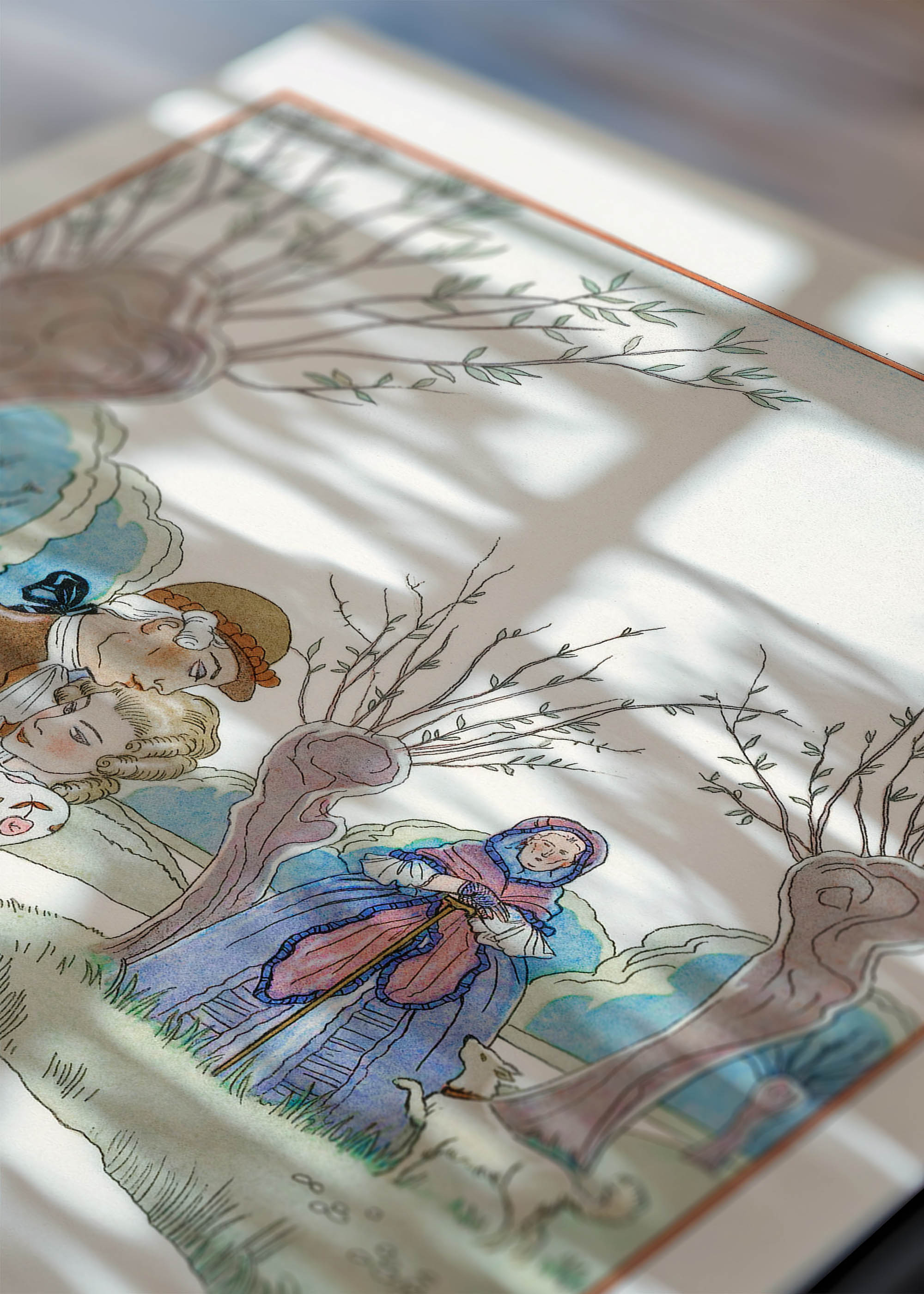 Urocze ujęcie młodości – ta ilustracja George’a Barbiera przenosi nas wprost do krajobrazu wczesnej zimy, gdzie para młodych zakochanych oddaje się radości wspólnej chwili. Młodzieniec przenosi wybrankę przez strumień. W tle dostrzegamy tajemniczą postać w błękitnej pelerynie, która przygląda się scenie niczym dobra wróżka czuwająca nad szczęściem młodej pary.