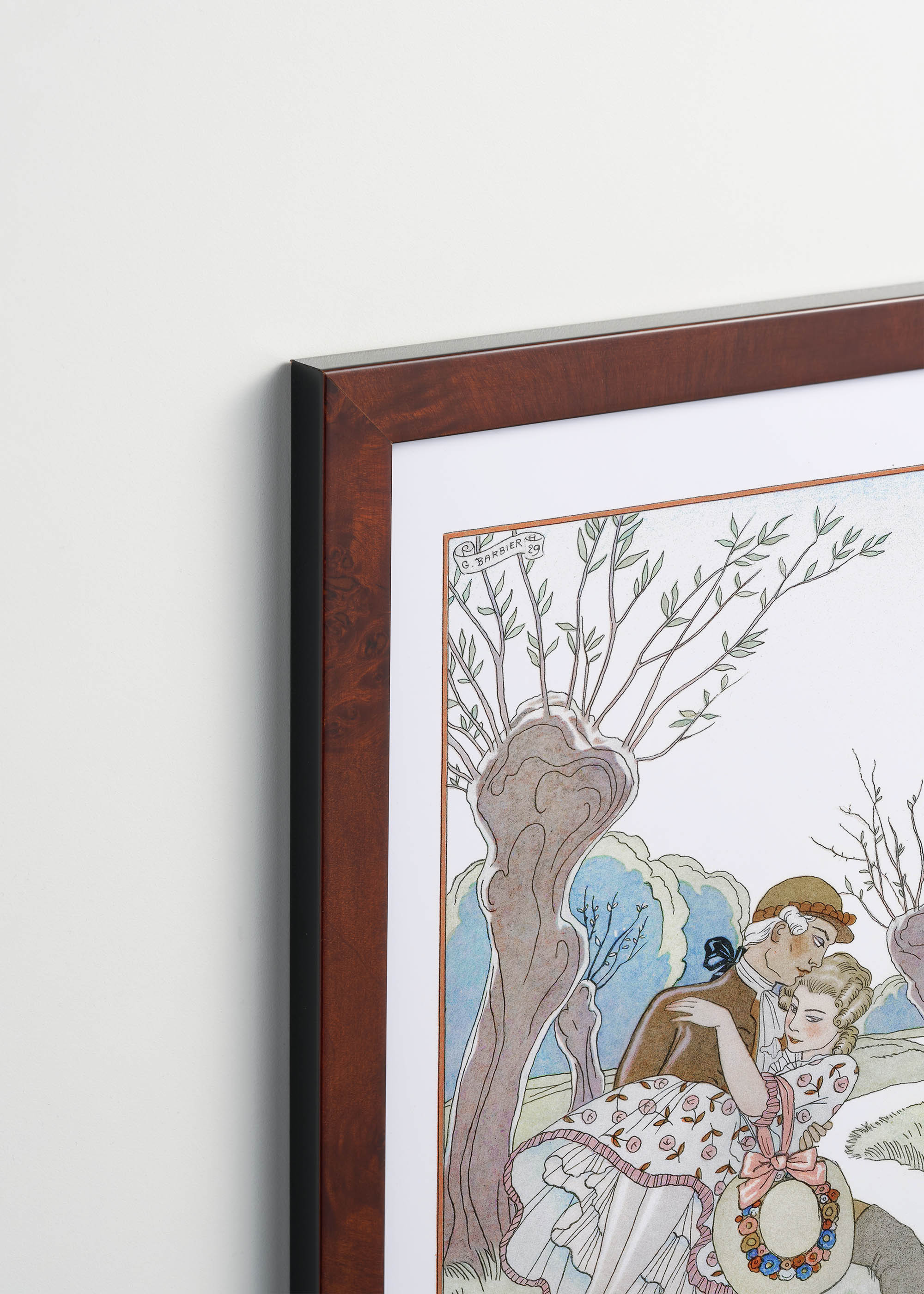 George Barbier, jeden z najwybitniejszych ilustratorów epoki Art Deco, stworzył to dzieło w latach 20. XX wieku, gdy Europa odżywała po traumie I wojny światowej. Artysta, nazywany często „nowym Beaubrinem”, zasłynął z eleganckich ilustracji mody i kostiumów teatralnych. Ciekawostką jest, że Barbier był zapalonym kolekcjonerem antyków i często czerpał inspirację z XVIII-wiecznych rycin, co widać w delikatnej, pastelowej kolorystyce tego plakatu.