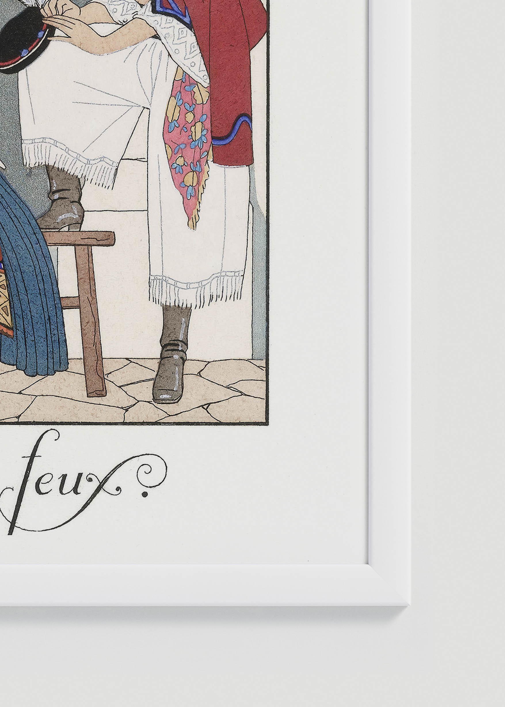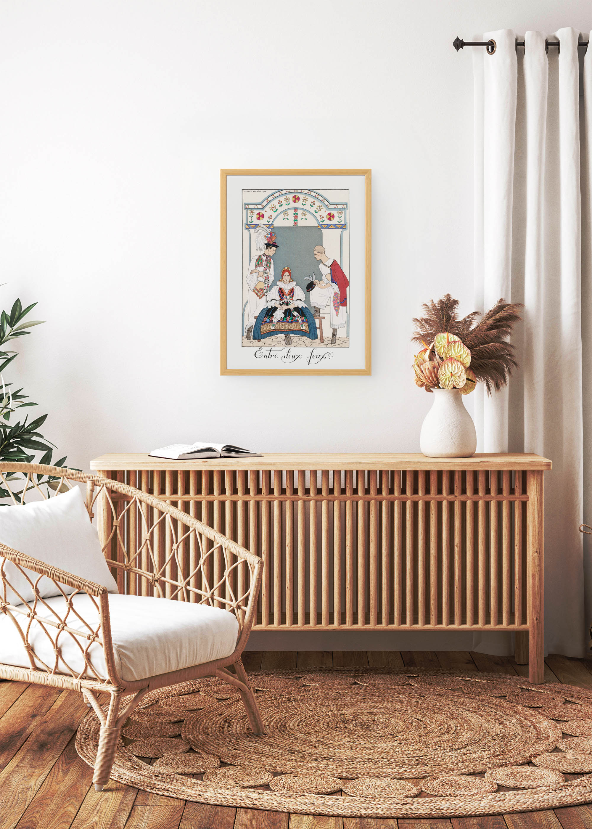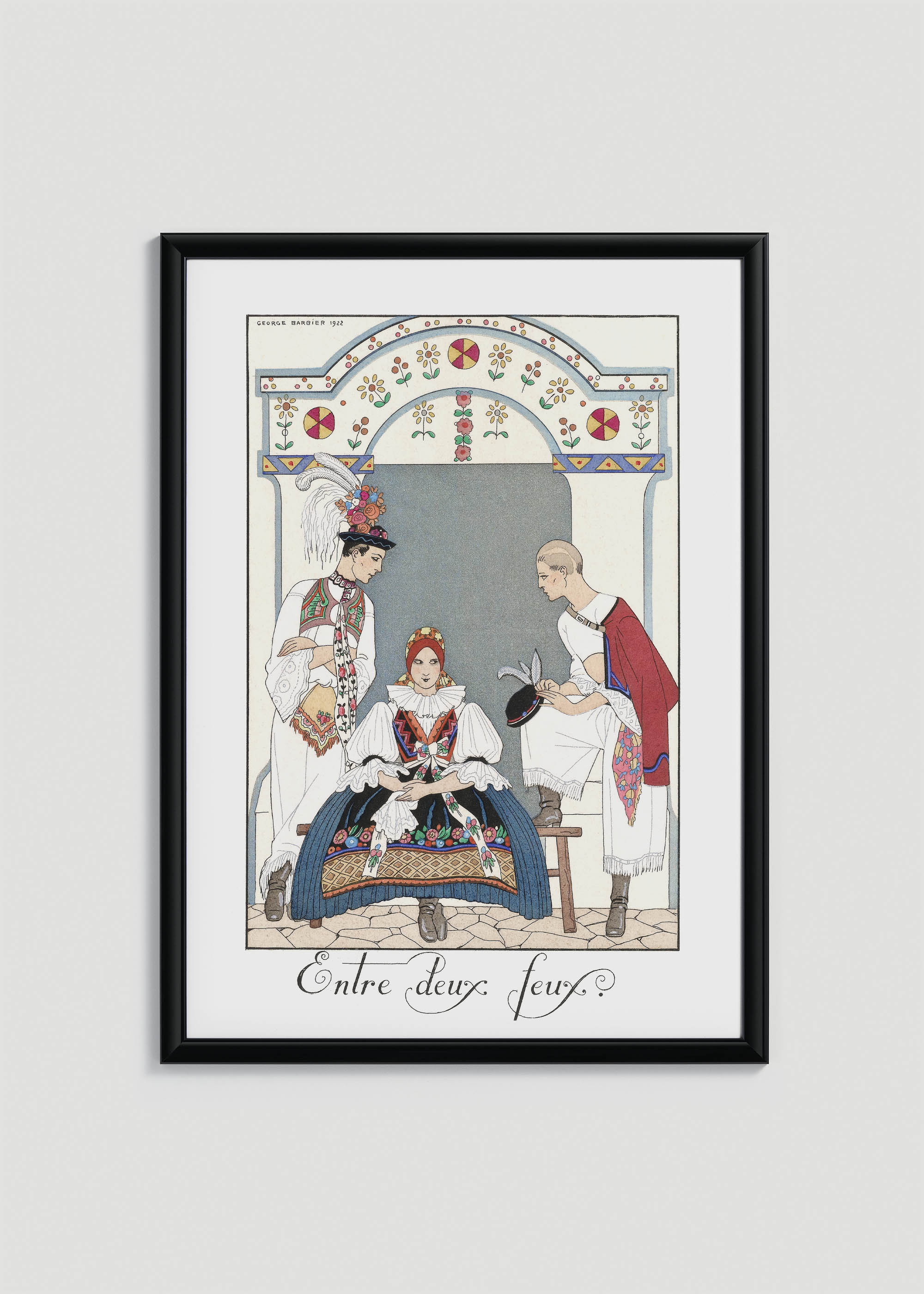 George Barbier, francuski mistrz ilustracji z okresu Art Deco, stworzył dzieło przedstawione na tym plakacie w 1922 roku. „Entre deux feux” – czyli „Między dwoma ogniami” – to prawdziwa perła jego twórczości, przedstawiająca scenę rodem z baśniowego świata. Barbier, nazywany „nieporównanym kolorystą mody”, zasłynął jako ilustrator magazynów haute couture, a jego prace do dziś zachwycają precyzją detalu i wyjątkowym wyczuciem stylu.