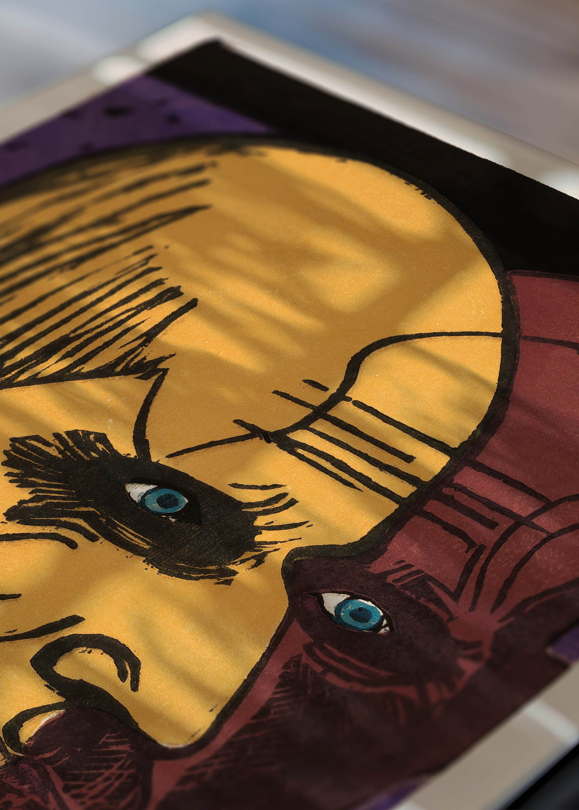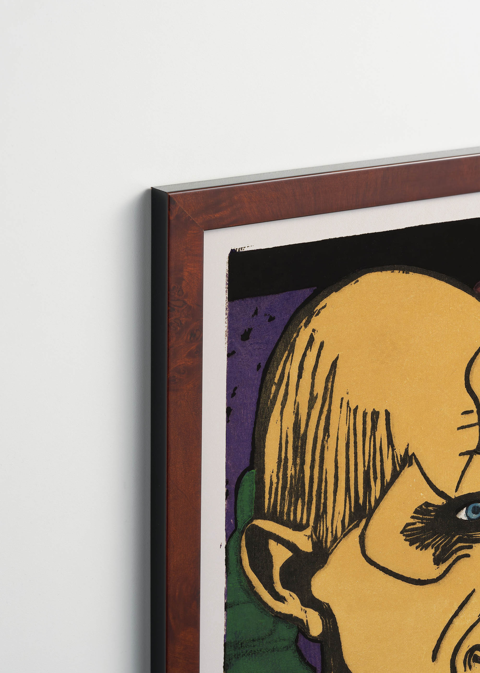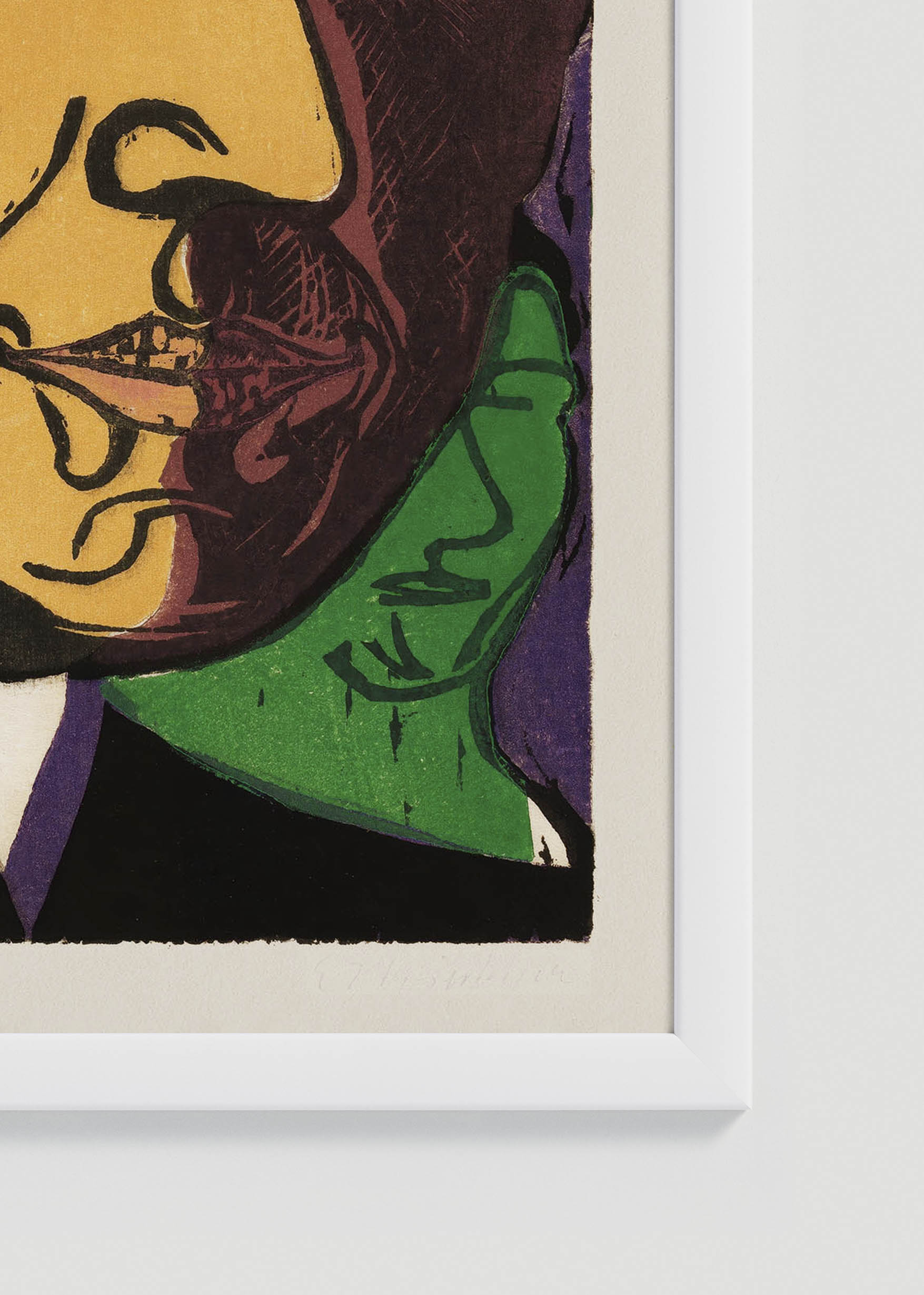 Kolorystyka tej reprodukcji zachwyca intensywnością – dominują tu soczysty żółty kadmowy oraz ciepły karmin, kontrastujące z głębią szmaragdowej zieleni i fioletowymi akcentami. Charakterystyczne czarne kontury, będące znakiem rozpoznawczym Kirchnera, nadają kompozycji dramaturgiczną siłę. Te wyraziste barwy ziemi i ognia tworzą niepowtarzalną harmonię, typową dla ekspresjonistycznej palety.