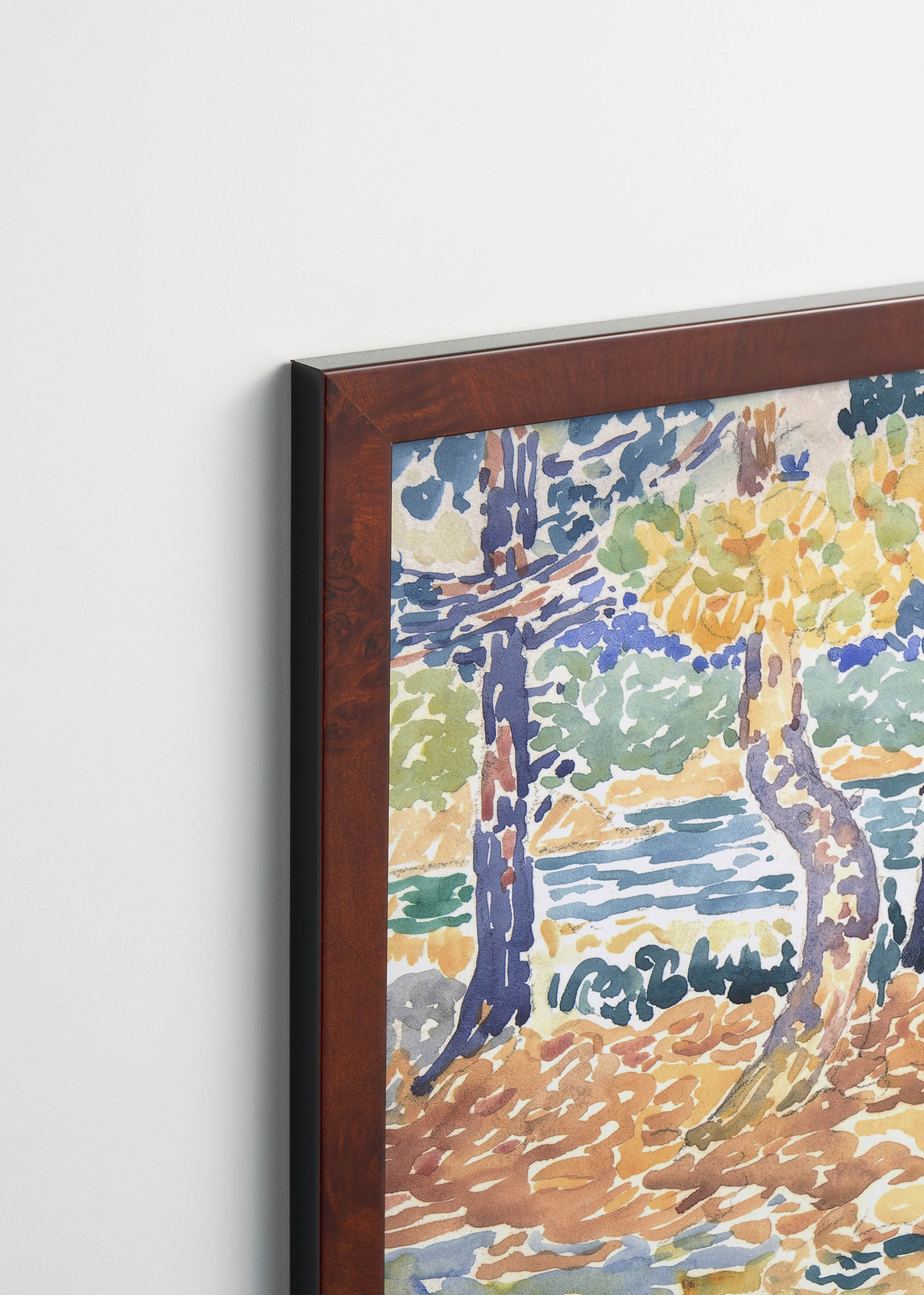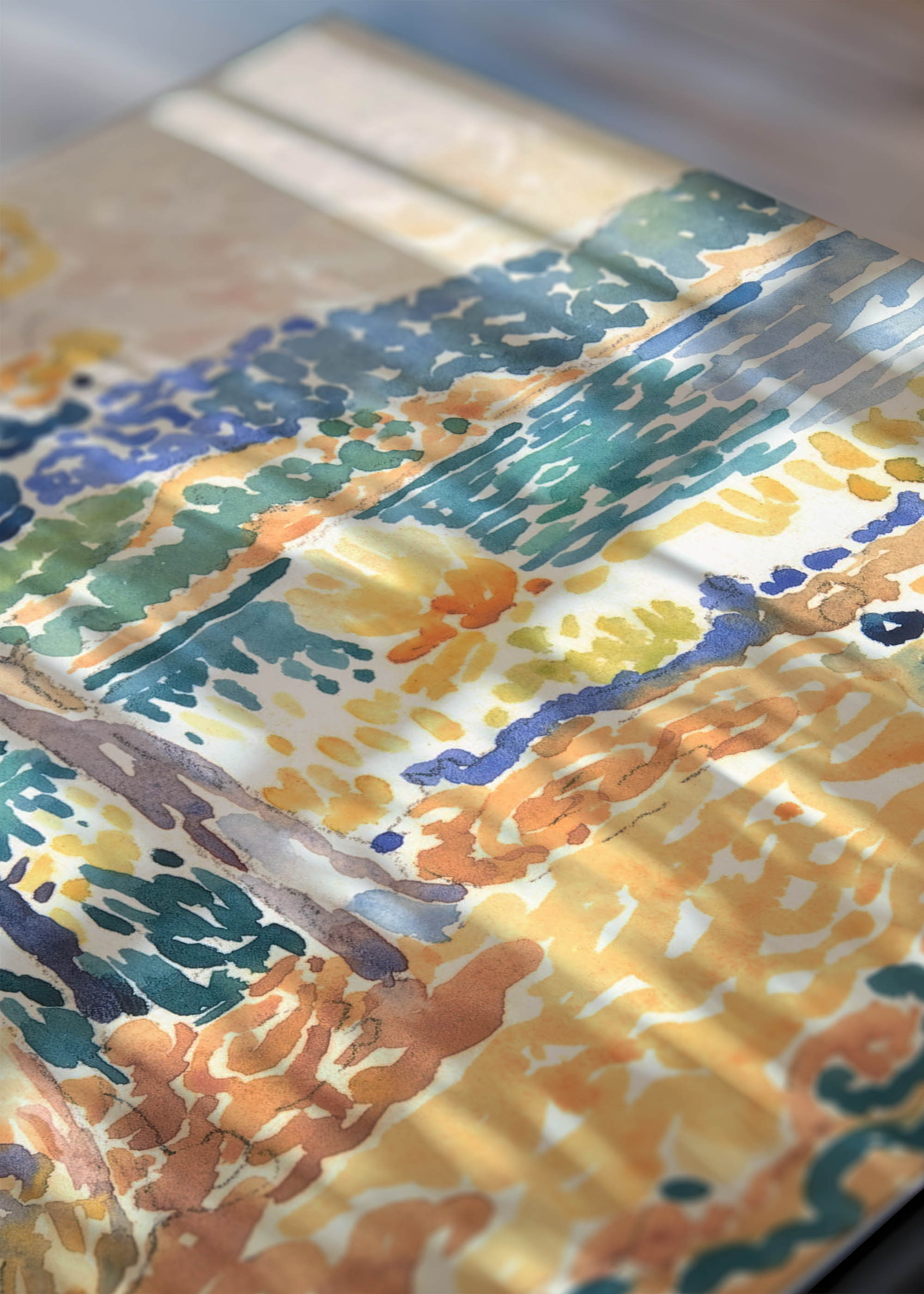Kolorystyka tego dzieła to prawdziwa symfonia śródziemnomorskich barw – dominują tu ciepłe ochry ziemi, cynober przechodzący w kadmową pomarańcz, oraz żywe ultramaryny i kobalty wody morskiej. Żółcienie drzew przypominają aurum jesiennych liści, podczas gdy zieleń roślinności oscyluje między szmaragdowym a oliwkowym. Ta harmonijne zestawienie sprawia, że reprodukcja doskonale komponuje się z wnętrzami urządzonymi w stylu prowansalskim, śródziemnomorskim czy skandynawskim.