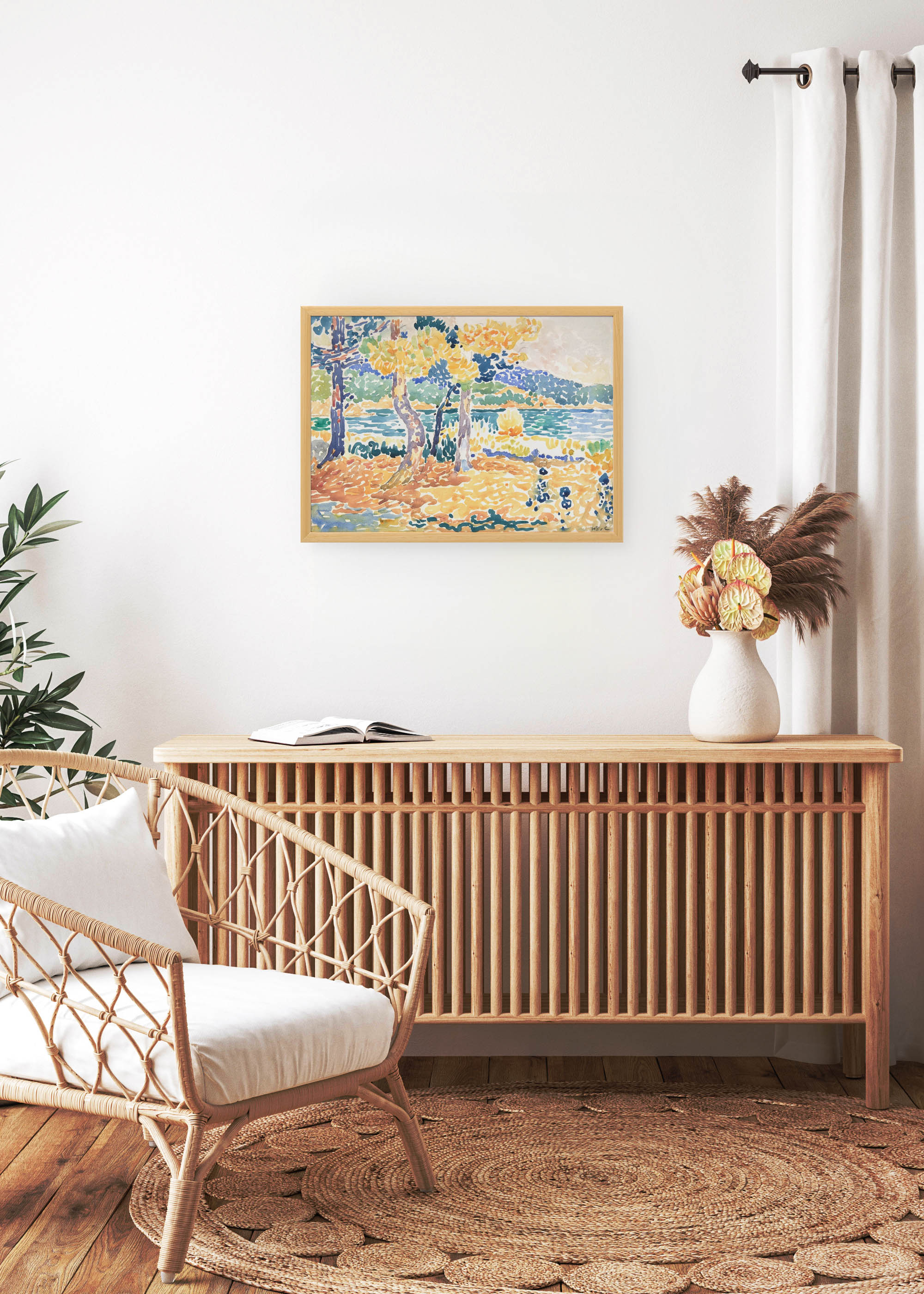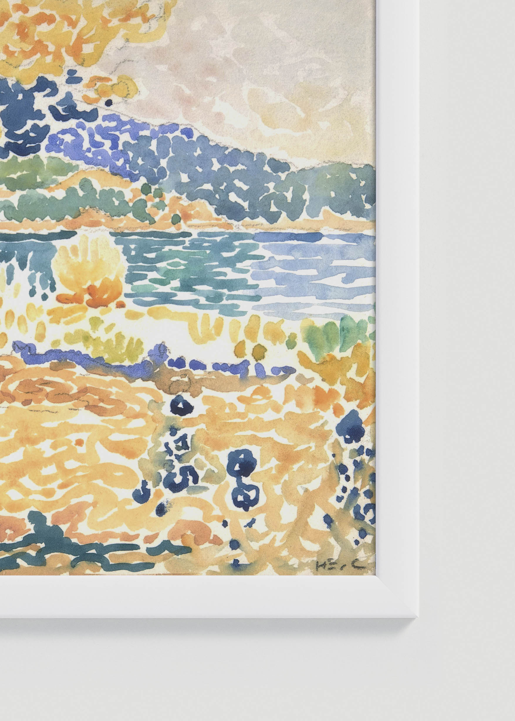 Plakat przedstawiający dzieło Henri-Edmonda Crossa przenosi nas wprost do słonecznego zakątka nad brzegiem morza, gdzie mistrzowsko zastosowana technika pointylizmu rozkwita w całej okazałości. Cross, jeden z najważniejszych przedstawicieli neoimpresjonsizmu, stworzył tę urzekającą kompozycję na przełomie XIX i XX wieku, kiedy wraz z Paulem Signaciem rozwijali rewolucyjną metodę malowania drobnych, kolorowych kropek.