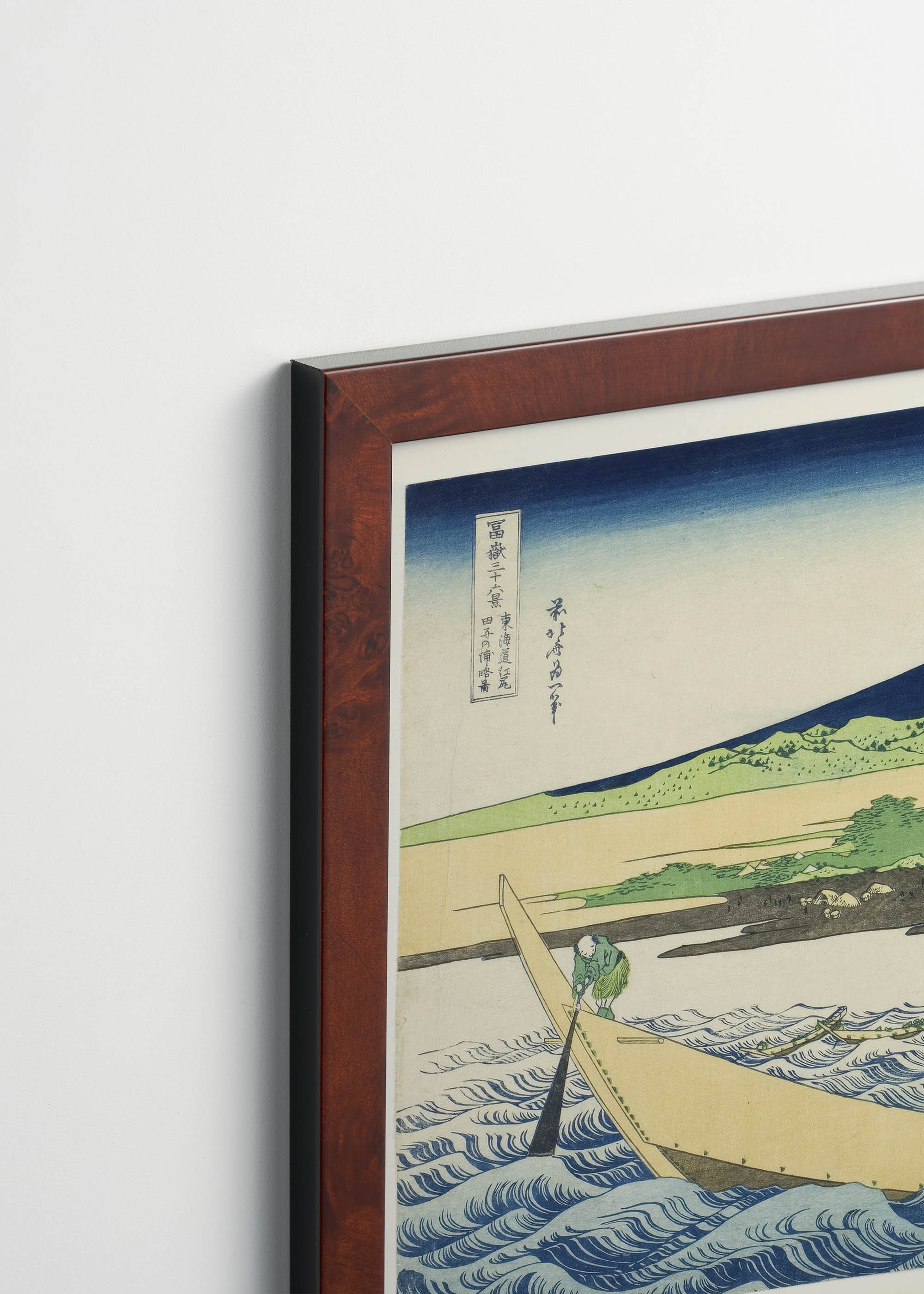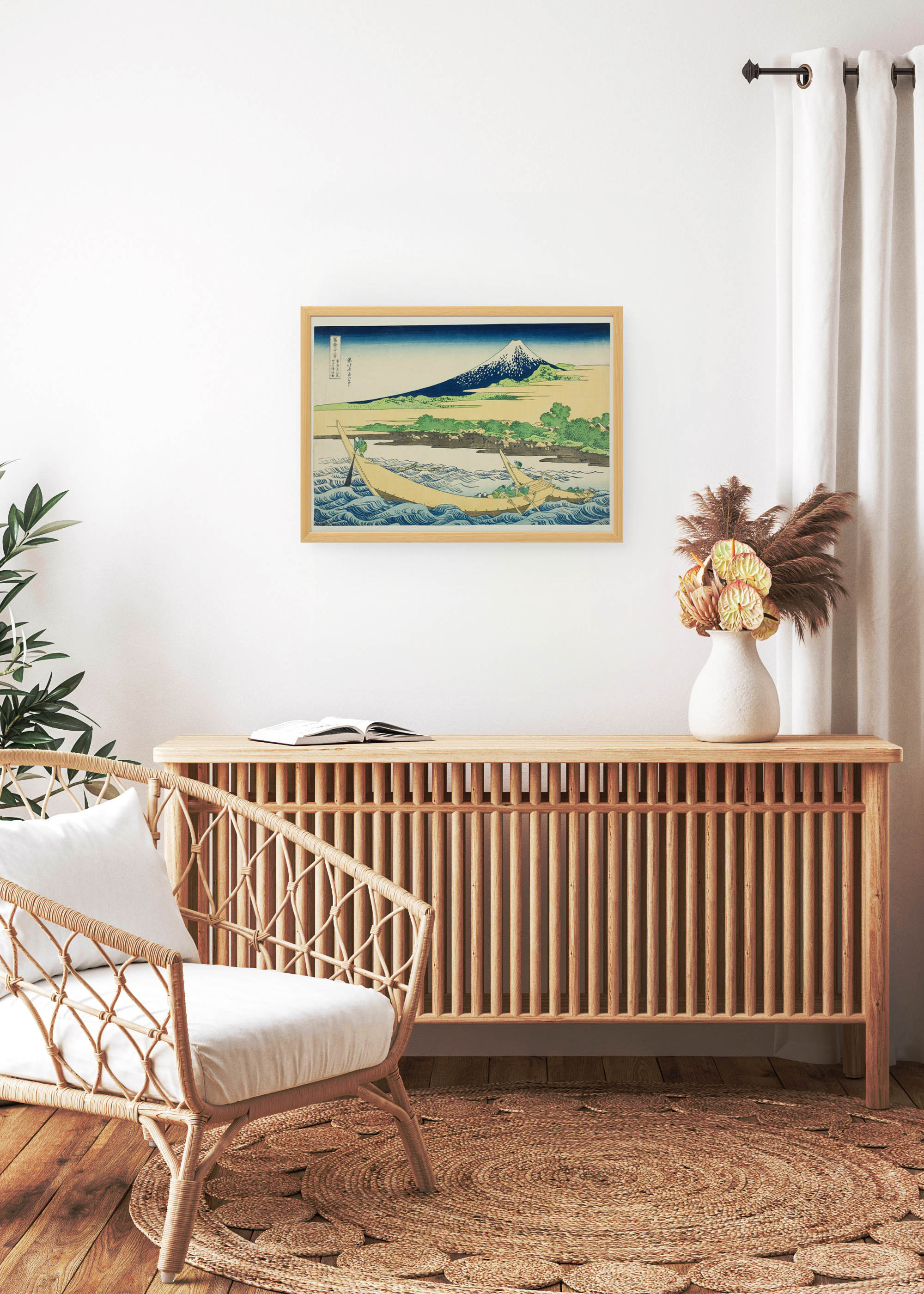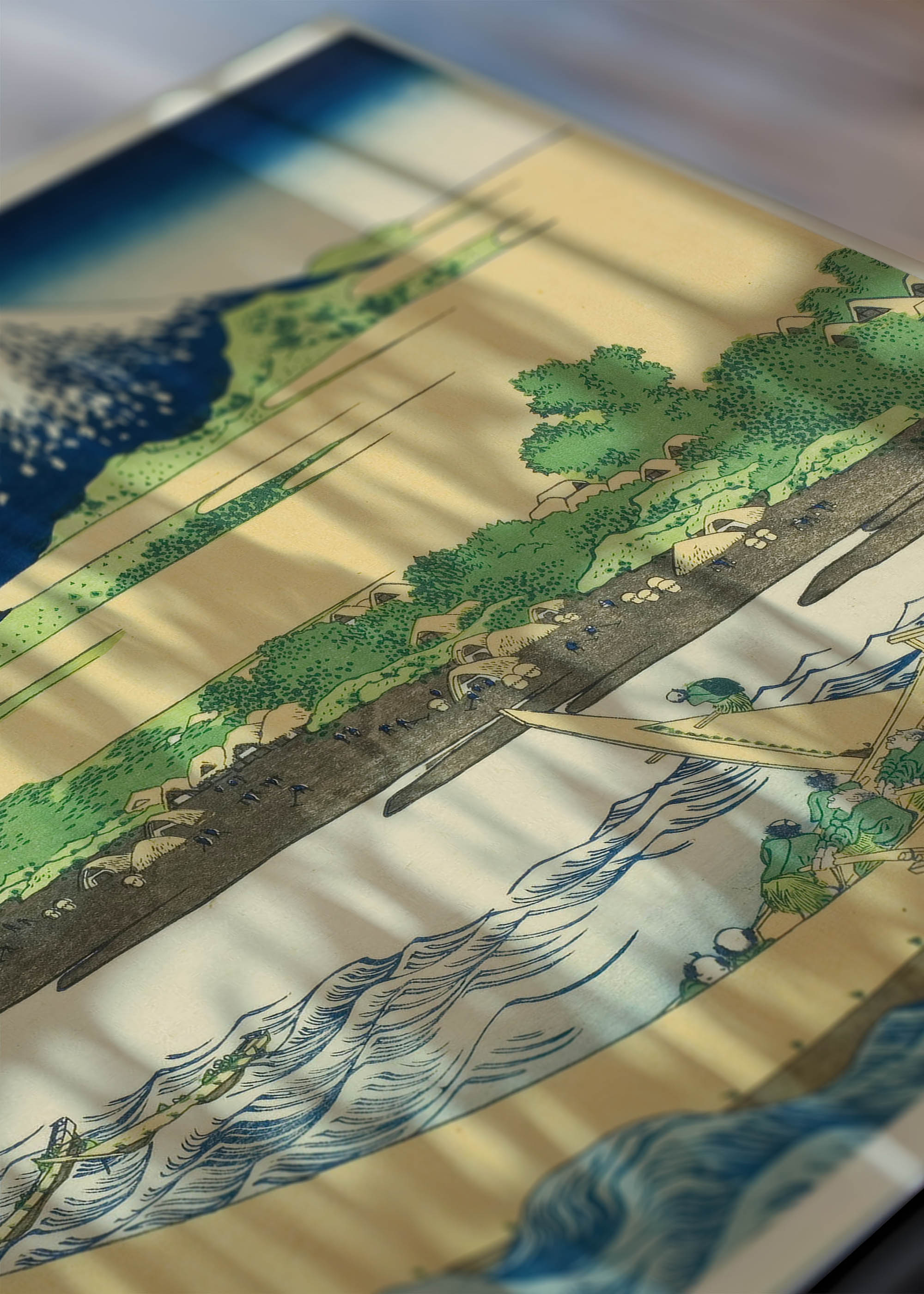 Przed nami plakat przedstawiający jedno z dzieł legendarnego Katsushiki Hokusaia – mistrza japońskiego drzeworytu ukiyo-e. Ten mniej znany, acz równie fascynujący obraz pochodzi z cyklu „Trzydzieści sześć widoków góry Fuji”, powstałego w latach 1830-1832. Hokusai, który żył w latach 1760-1849, był artystą nieustannie poszukującym doskonałości – podobno przeprowadzał się aż 93 razy i zmieniał swoje imię artystyczne ponad 30 razy!