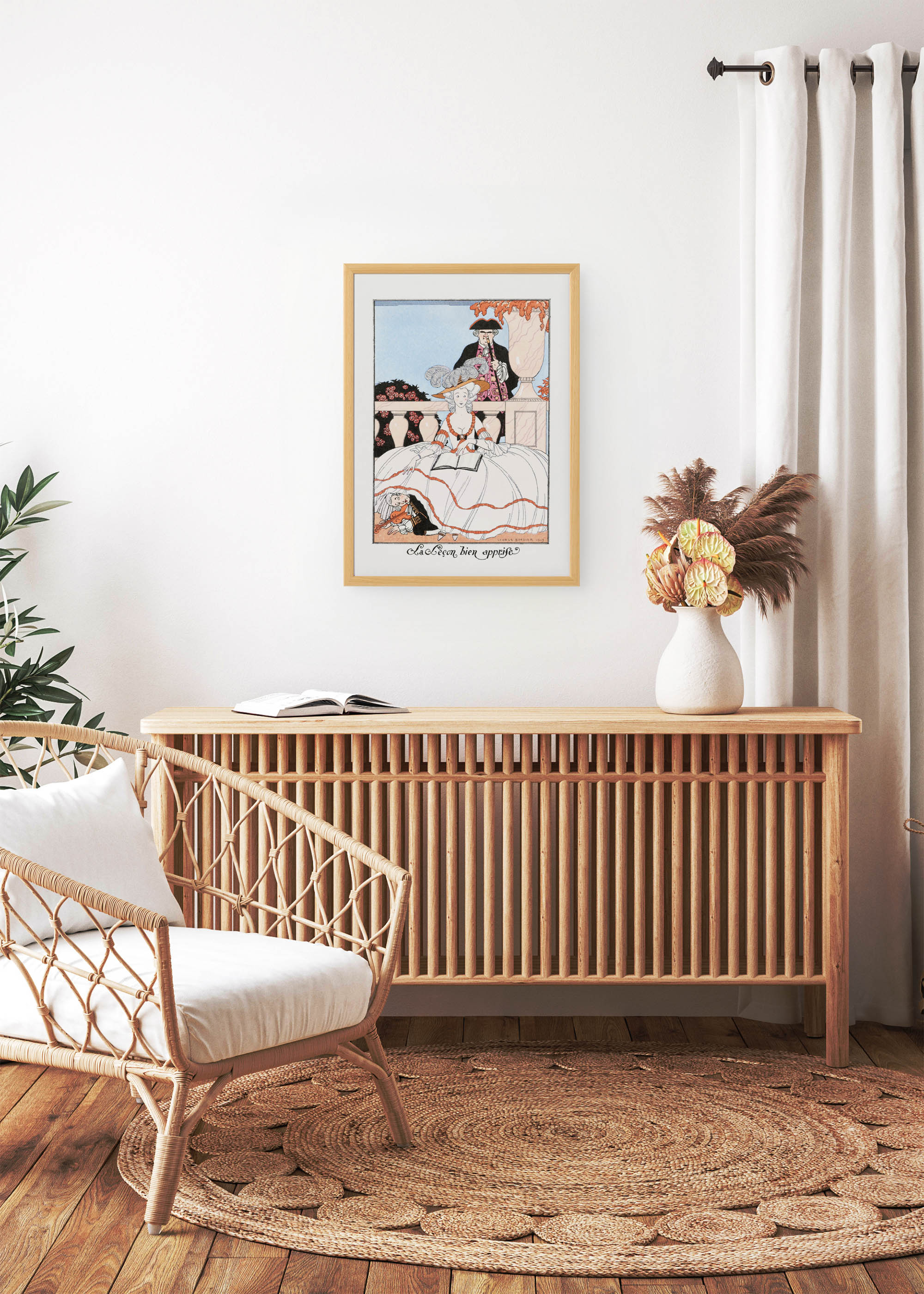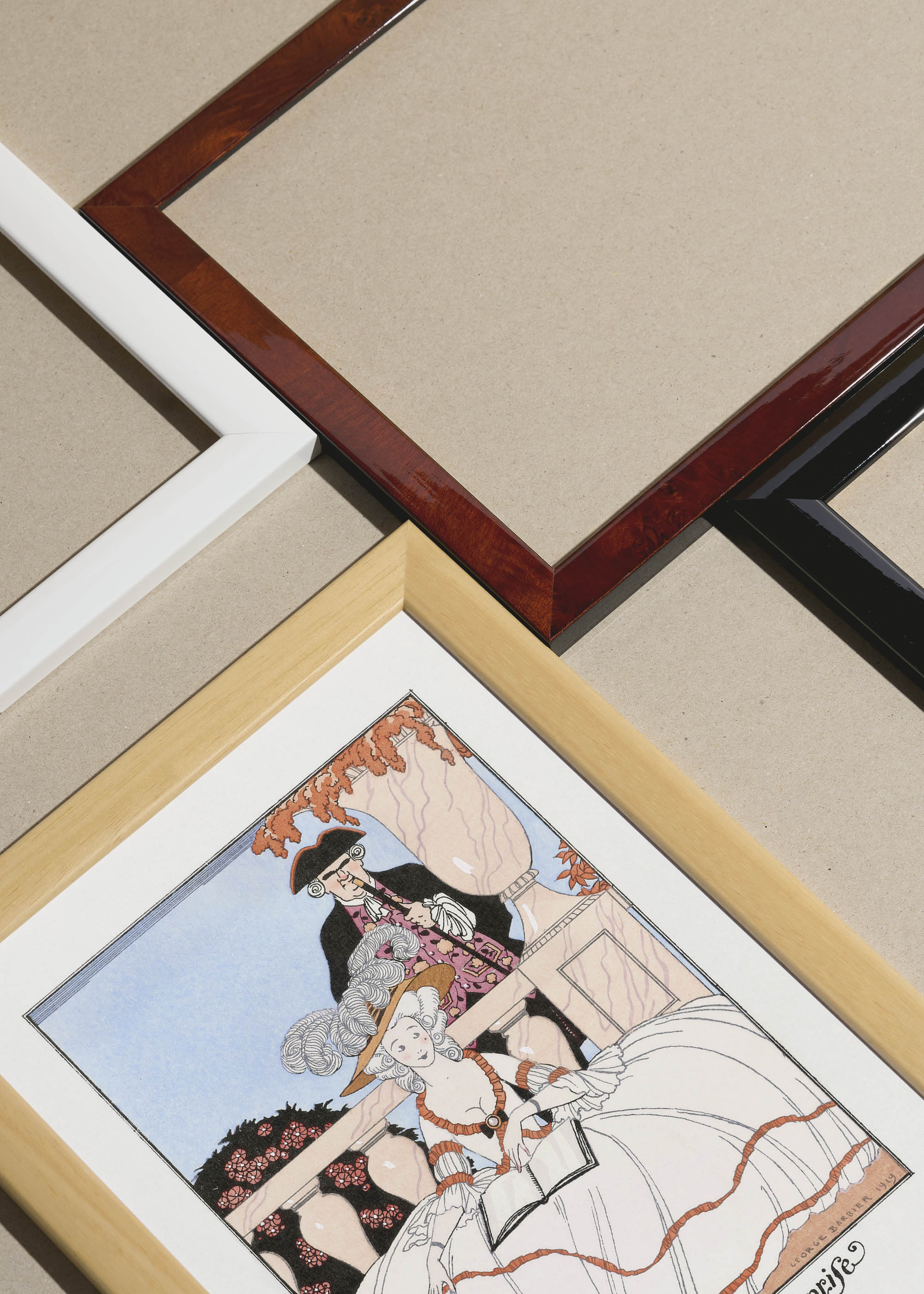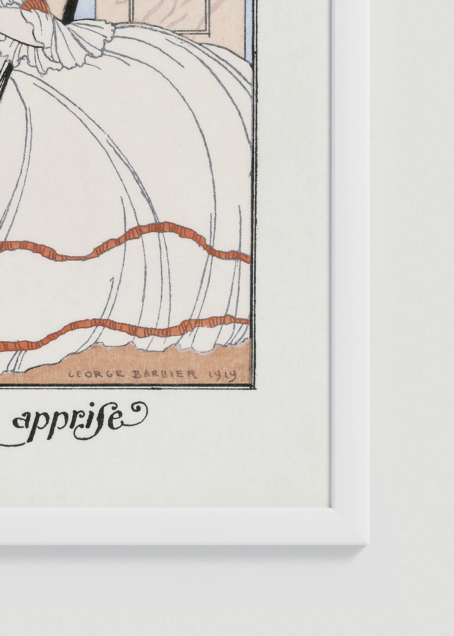 George Barbier, mistrz Art Deco i jeden z najwybitniejszych ilustratorów mody początku XX wieku, stworzył tą piękną, a jednocześnie humorystyczną ilustrację „La Leçon bien apprise” (Dobrze wyuczona lekcja) w 1919 roku. Francuski artysta, nazywany często „nowym Beardsleyem”, zasłynął z eleganckich ilustracji do luksusowych magazynów mody oraz ekskluzywnych wydań literackich. Ta konkretna praca powstała rok po zakończeniu I wojny światowej, która zakończyła okres rozwoju belle époque w Paryżu.