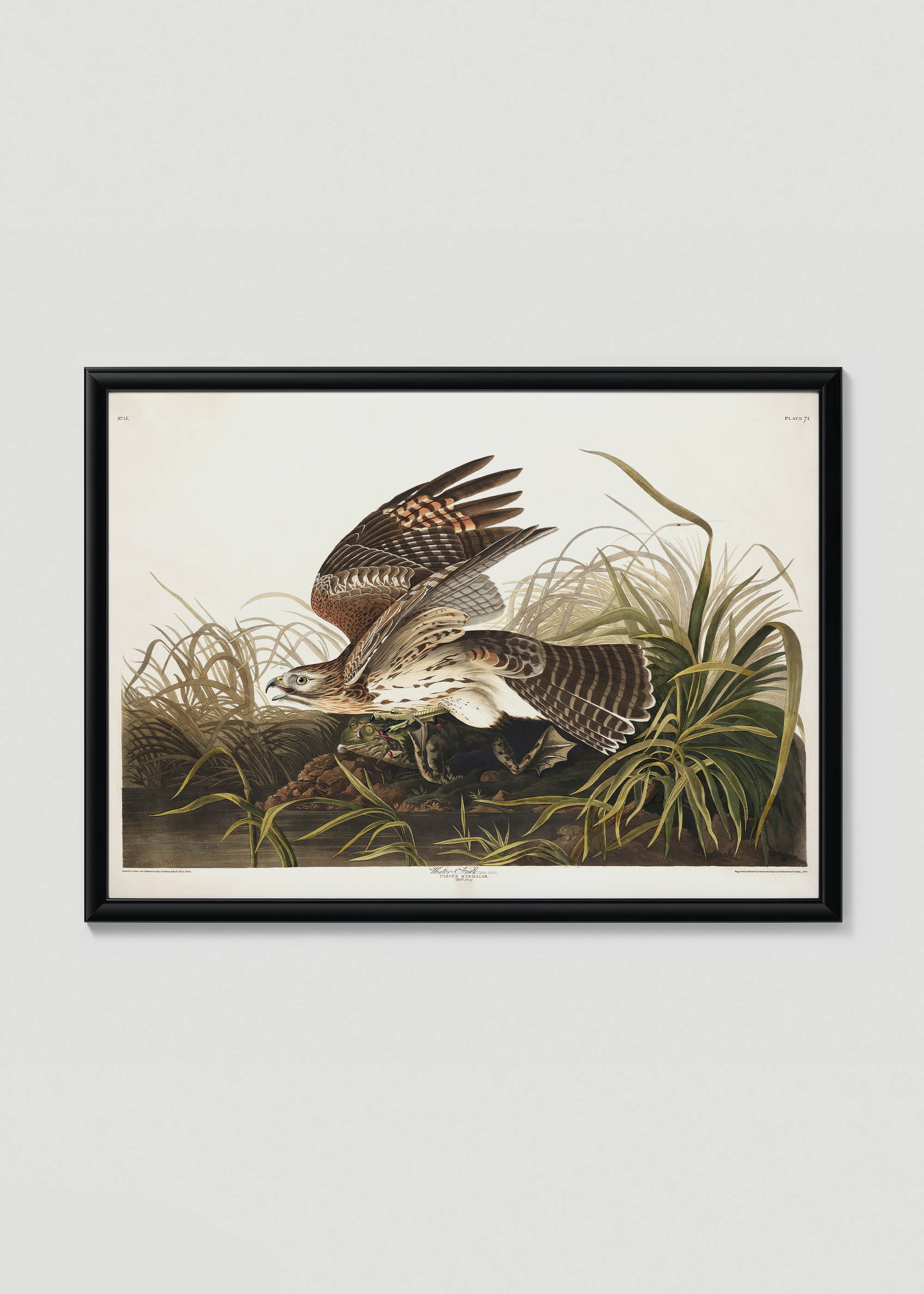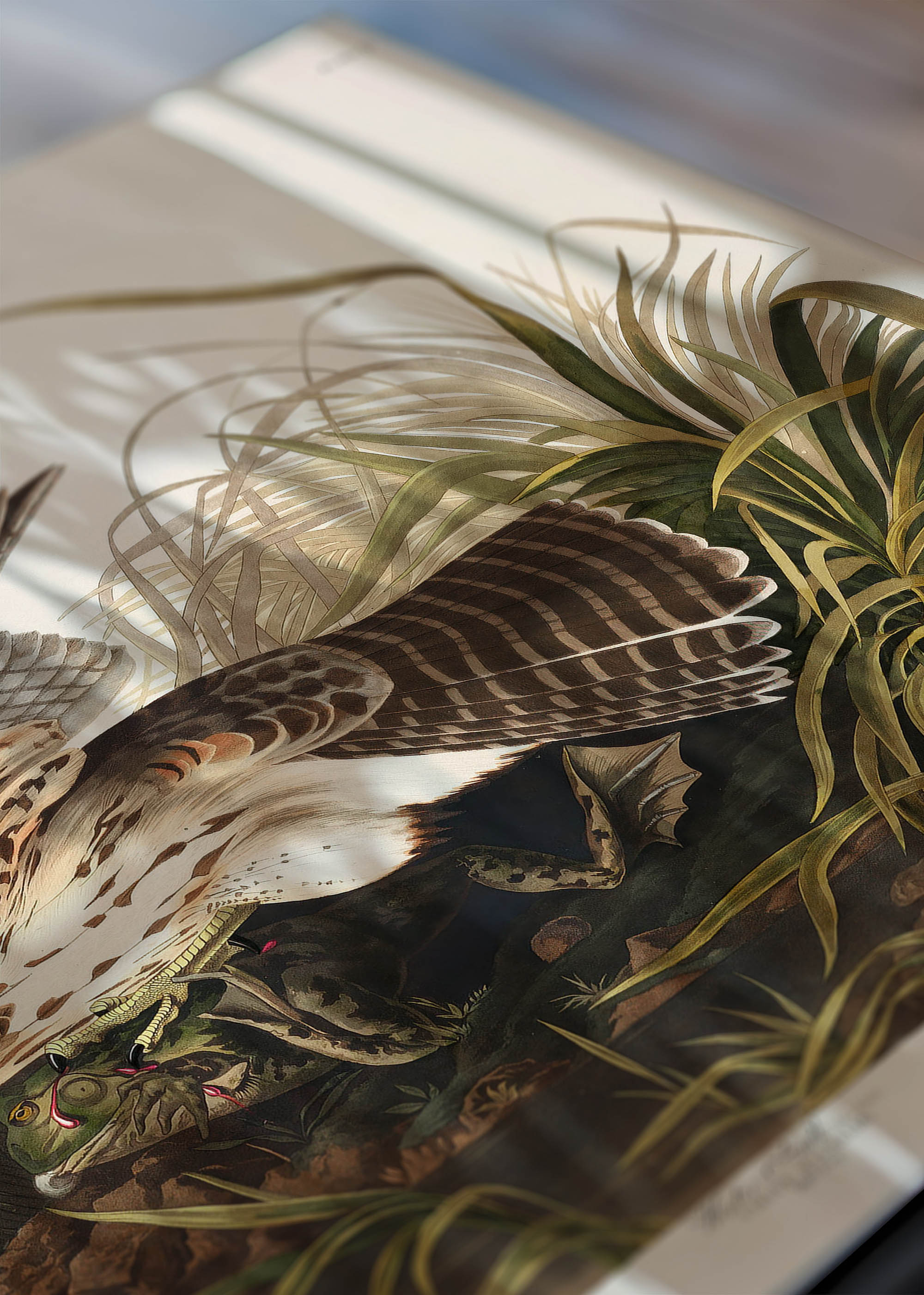 Ten wspaniały plakat przedstawia jedną z najbardziej dynamicznych ilustracji z monumentalnego dzieła Johna Jamesa Audubona „Birds of America”. Amerykański ornitolog i artysta stworzył to arcydzieło między 1827 a 1838 rokiem, dokumentując ptaki Ameryki Północnej w ich naturalnych rozmiarach. Audubon był pionierem w przedstawianiu ptaków w akcji – zamiast statycznych póz, ukazywał je w pełni życia, polujące czy broniące terytorium.