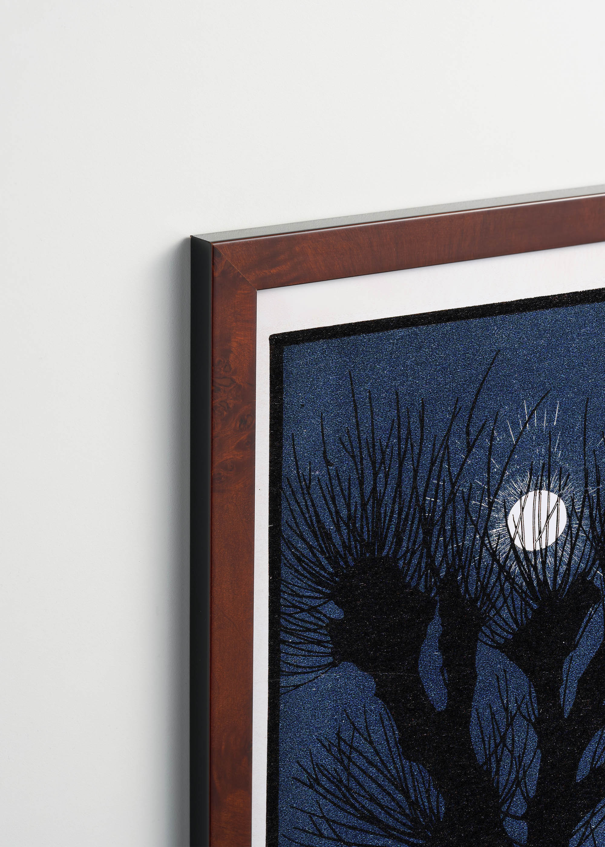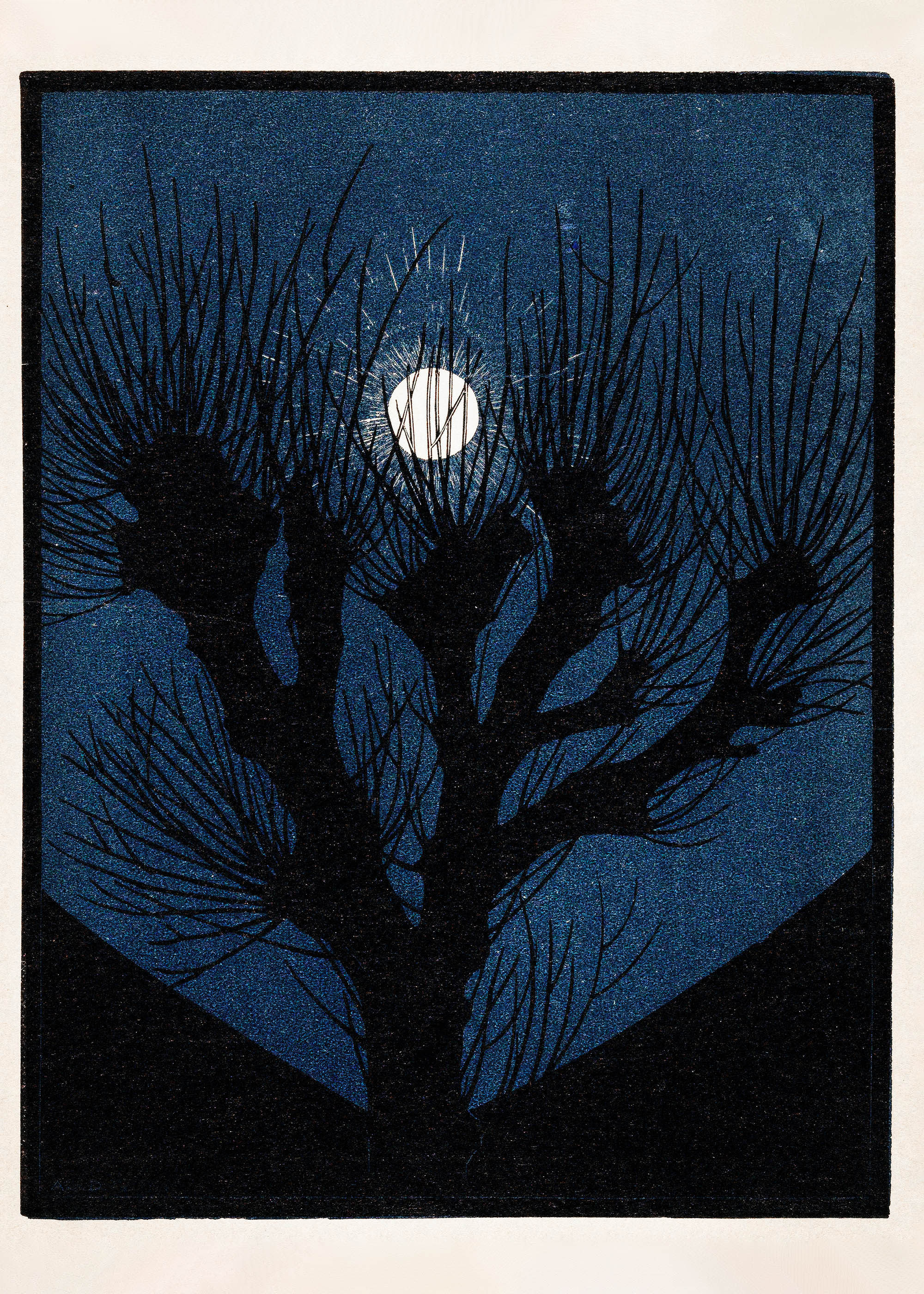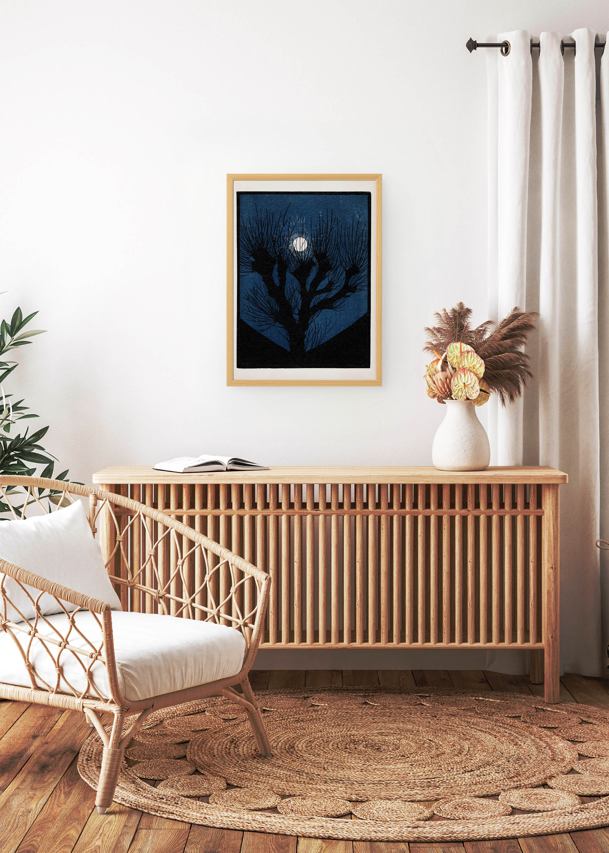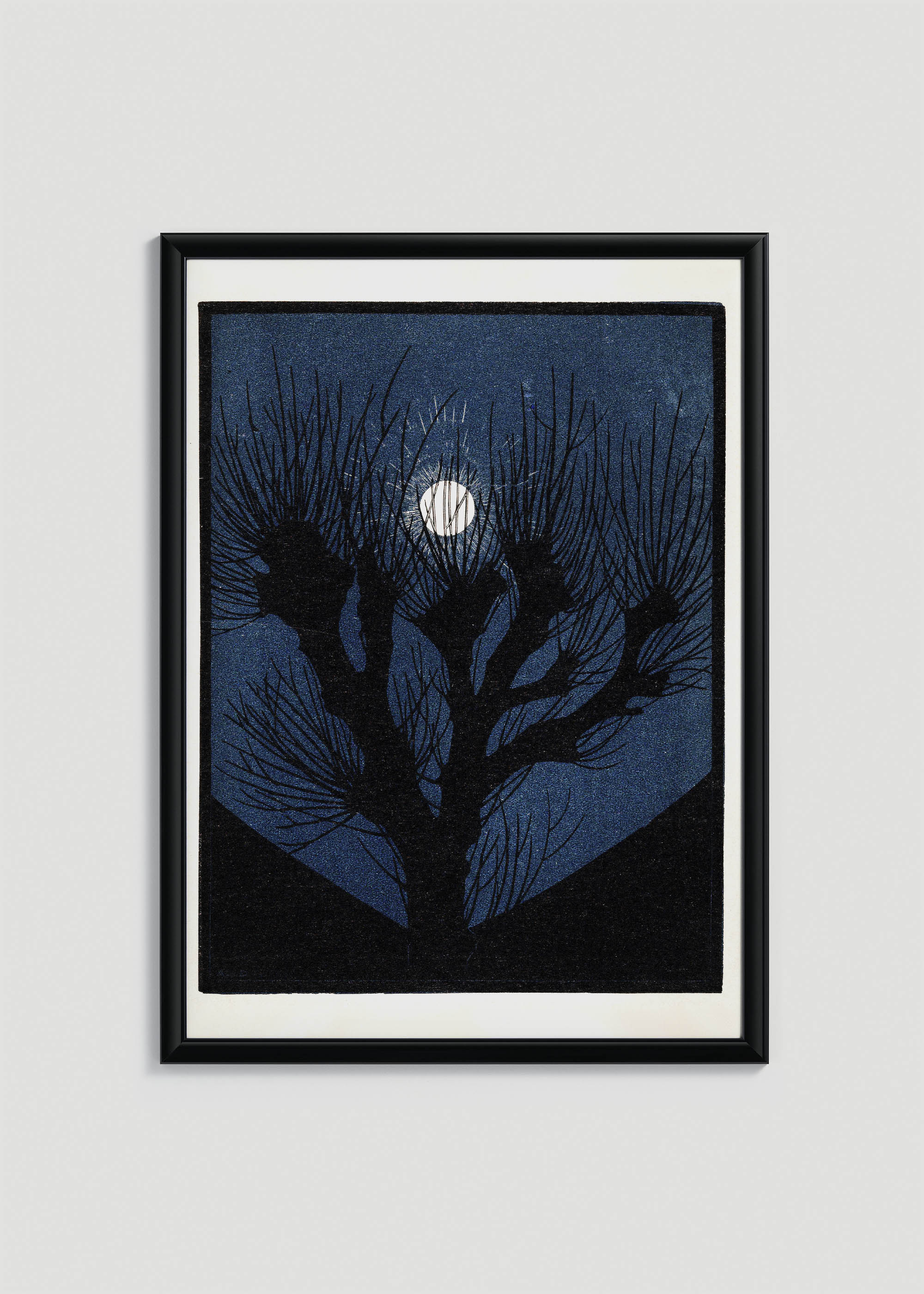 Charakterystyczne dla stylu de Graag jest mistrzowskie operowanie kontrastem – ciemne sylwetki roślinności tworzą dramatyczną ramę dla lunar­nego światła. Ta szczególna technika drzeworytnicza pozwalała artystce osiągać niezwykłe efekty głębi i atmosfery. Plakat będący reprintem tego wyjątkowego wzoru wprowadzi do wnętrza klimat tajemniczości i spokoju.