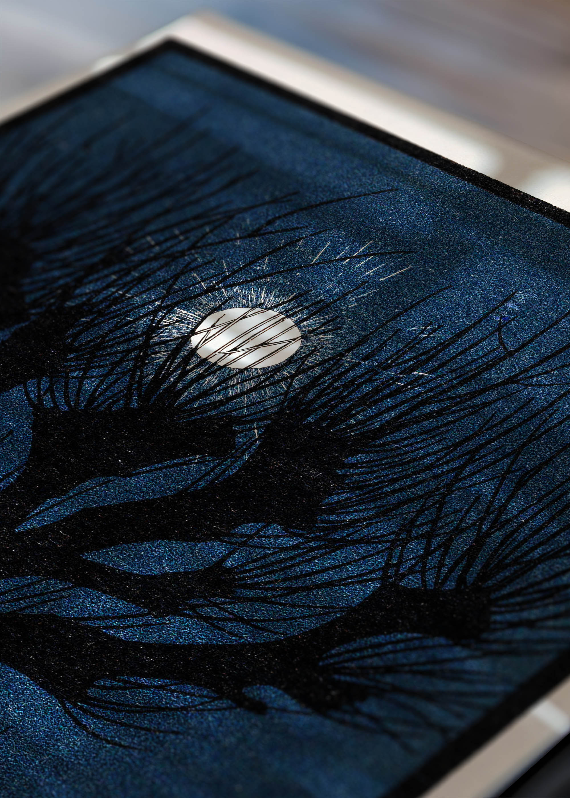 Kompozycja zachwyca głębią kolorystyczną opartą na intensywnych odcieniach pruskiego błękitu oraz kobaltowych tonach, które płynnie przechodzą w niemal sążniste czernie. Biały krążek księżyca, pozornie prosty w formie, staje się centralnym punktem całej narracji wizualnej, przebijając się przez gęstwinę stylizowanych liści i gałęzi.