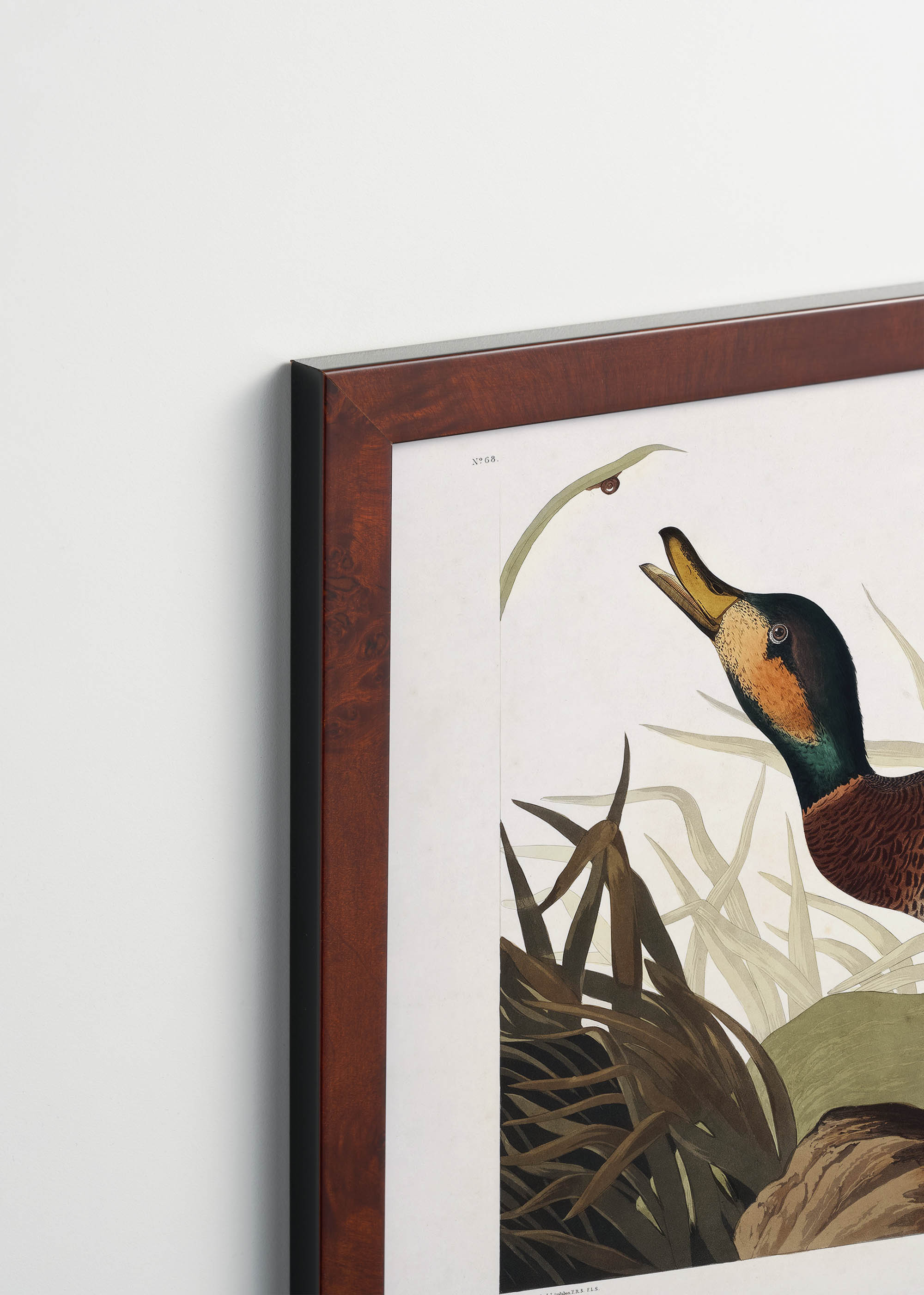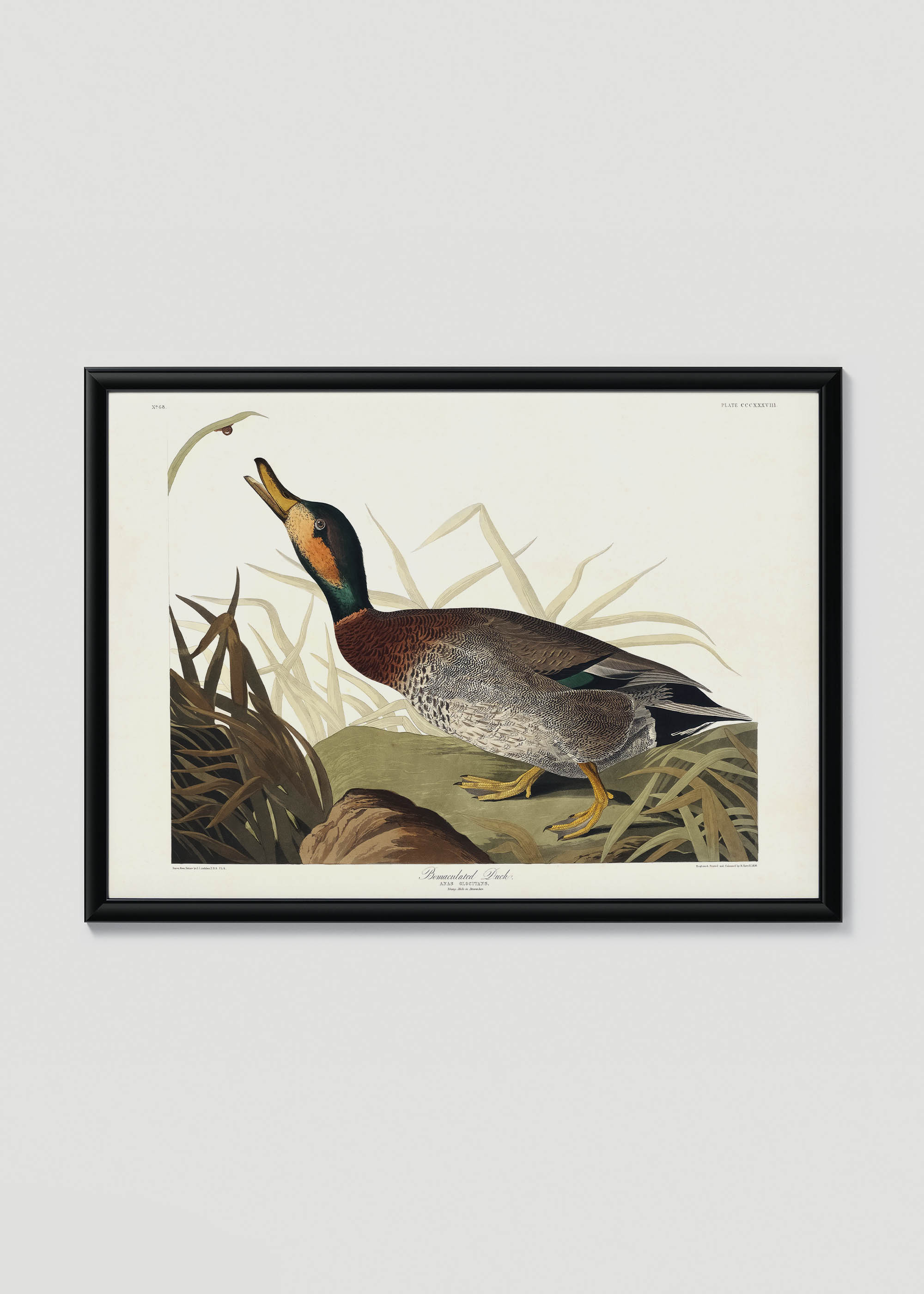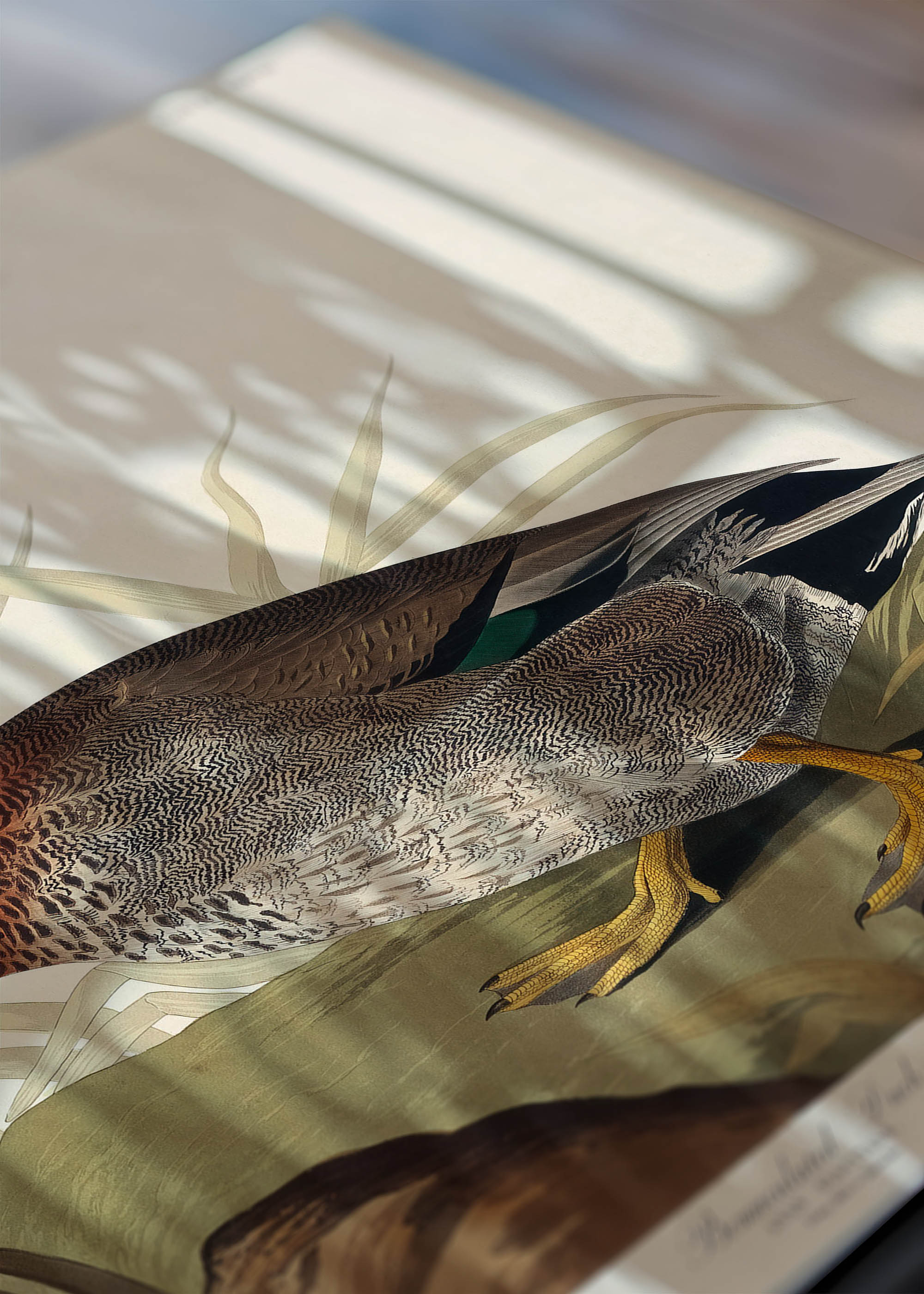 „Kaczka bemakulated” – to niezwykły plakat przedstawiający jedną z najpiękniejszych ilustracji z monumentalnego dzieła Johna Jamesa Audubona „Birds of America”. Ta oryginalna akwarela powstała między 1827 a 1838 rokiem, kiedy to Audubon przemierzał dzikie ostępy Ameryki Północnej, dokumentując ptasie gatunki z niespotykaną dotąd precyzją. Artysta-przyrodnik, który sam siebie nazywał „Amerykańskim Leśnym Człowiekiem”, stworzył 435 tablic przedstawiających ptaki w naturalnej wielkości – przedsięwzięcie tak kosztowne, że musiał sprzedać swoje dzieło w prenumeracie najbogatszym kolekcjonerom świata.