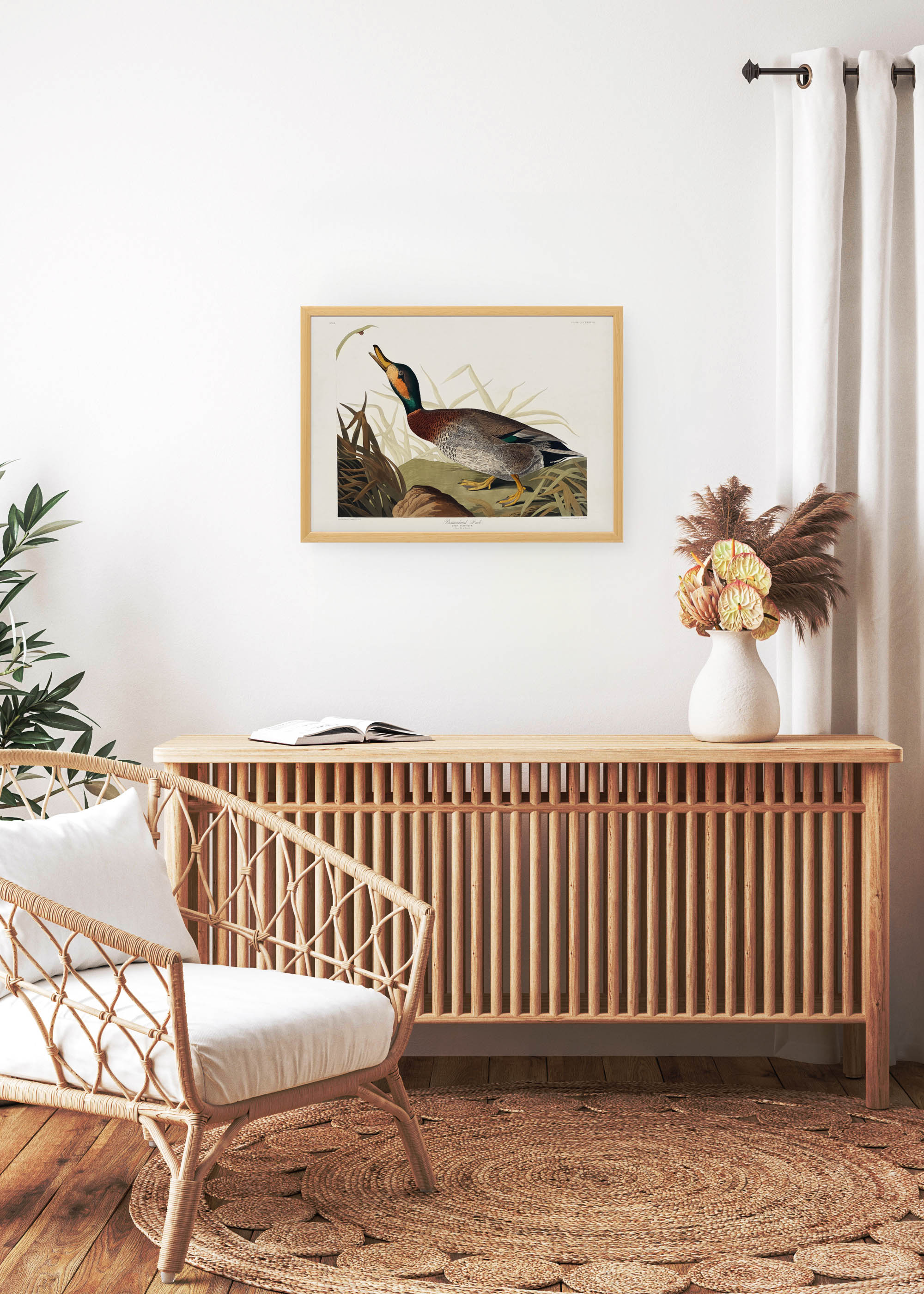 Kolorystyka tego wyjątkowego plakatu zachwyca subtelnością i naturalnością. Dominują ciepłe brązy zbliżone do umbry palonej oraz delikatne szarości z perłowym połyskiem. Szyja ptaka mieni się głęboką zielenią butelkową z akcentami pomarańczowej ochry i cytrynowej żółci. Tło utrzymane jest w kremowych, niemal piaskowych tonach, które doskonale komponują się z pastelowymi odcieniami traw nadbrzeżnych.