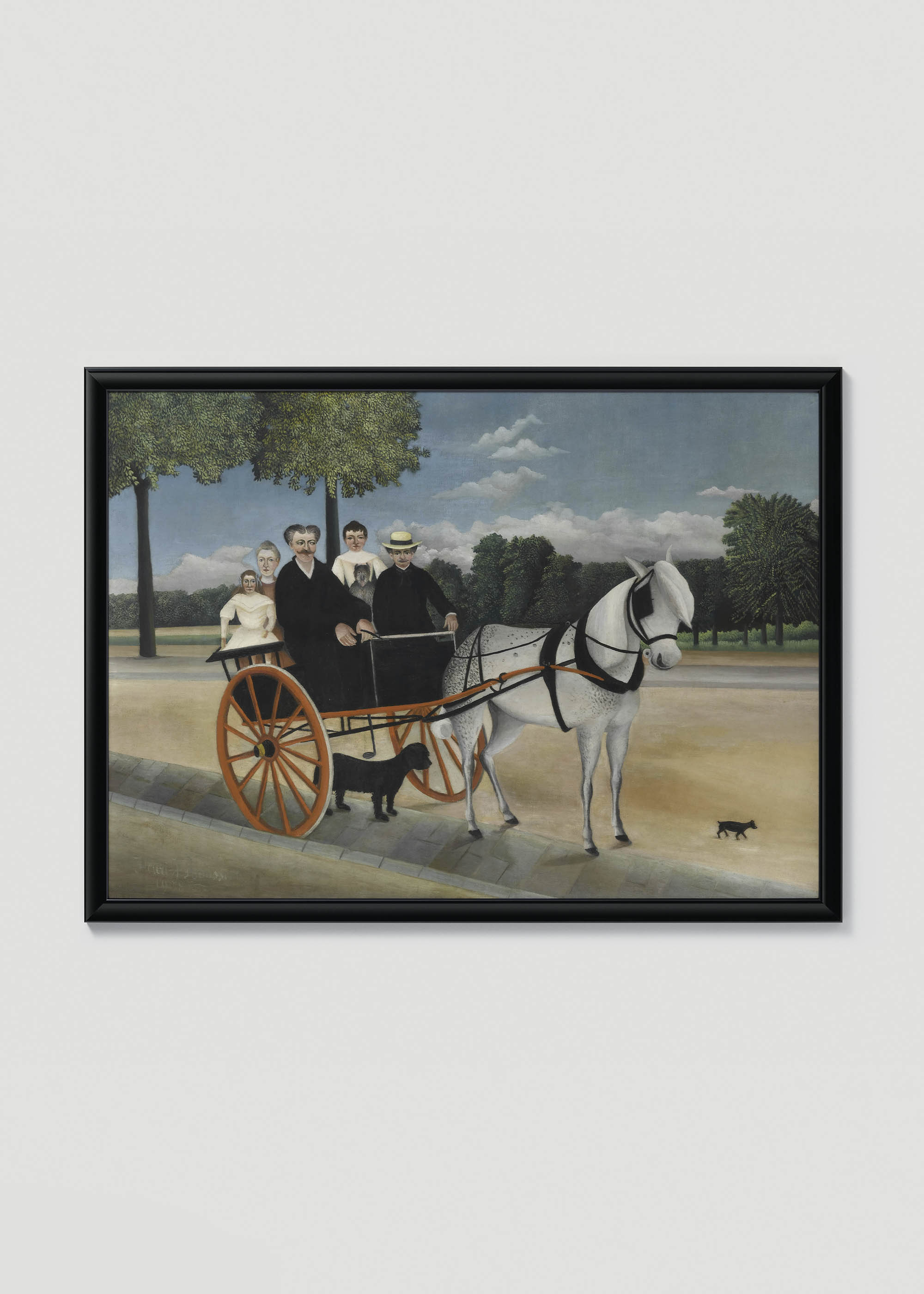 Plakat przedstawiający dzieło Henri Rousseau „La Carriole du Père Junier” to fascynująca reprodukcja jednego z najbardziej charakterystycznych obrazów naiwnego mistrza z przełomu XIX i XX wieku. Rousseau, znany jako „Celnik”, tworzył swoje dzieła w stylu prymitywnym, który dziś uznawany jest za prekursorski dla sztuki nowoczesnej. Ten szczególny obraz powstał około 1908 roku i prezentuje typową dla artysty precyzyjną technikę oraz niezwykłą zdolność do oddawania atmosfery miejskich spacerów tamtej epoki.