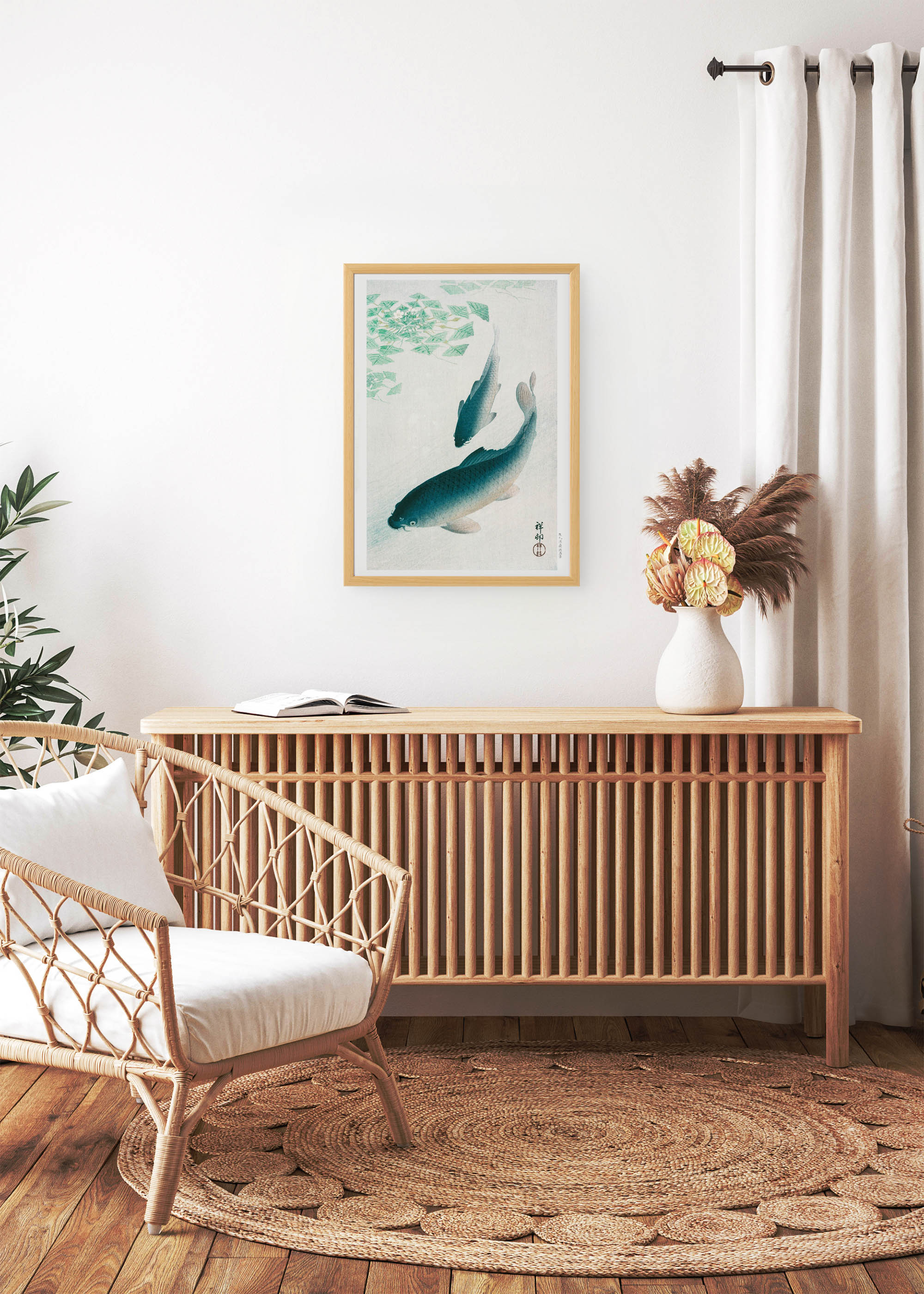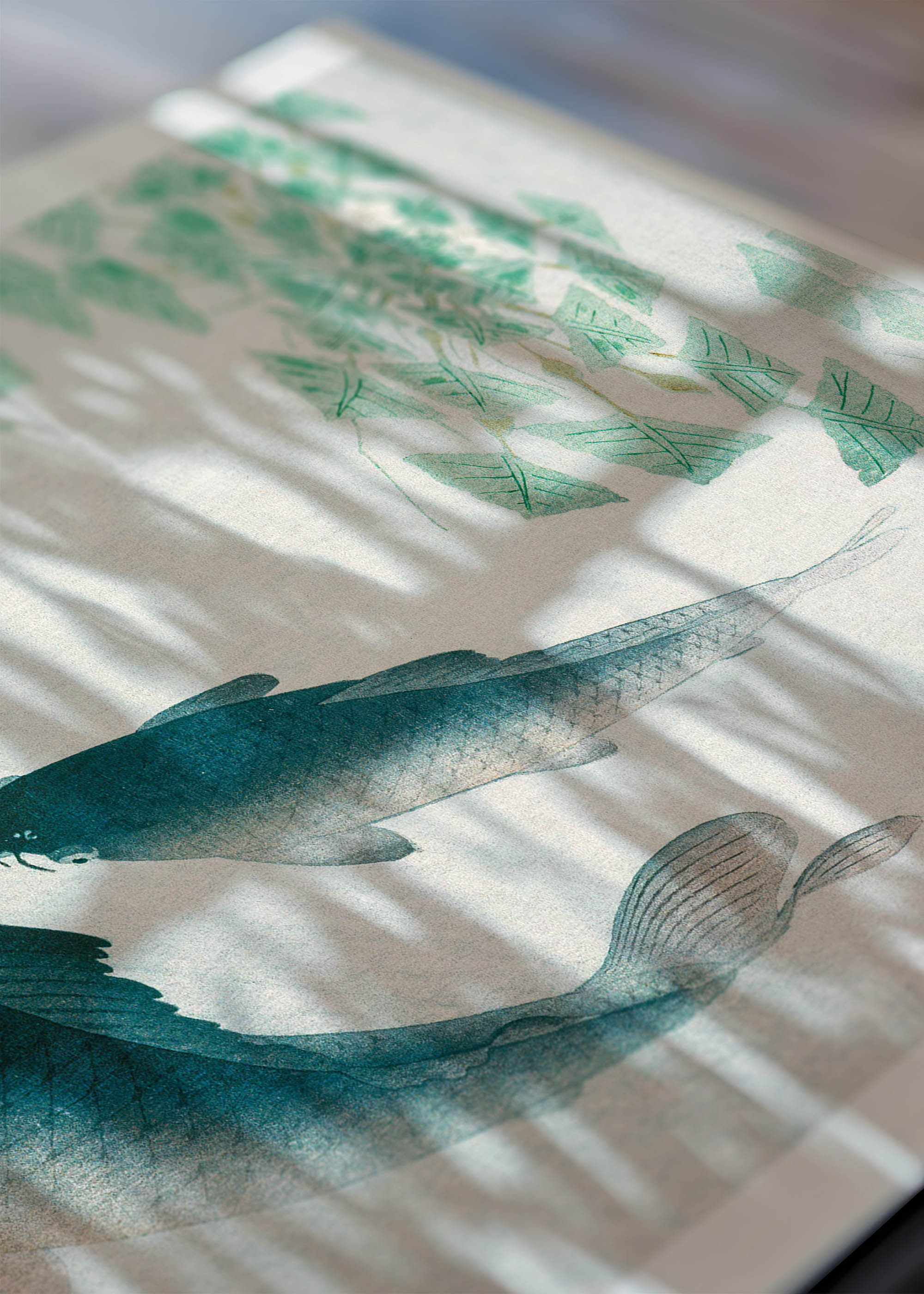 Kolorystyka tego plakatu to prawdziwa uczta dla miłośników stonowanych, orientalnych barw. Dominują tu chłodne tony turkusowe i morskie, przechodzące w głęboki kobalt, które nadają karpiom niemal mistyczny charakter. Delikatne, bladozielone liście wodnej roślini, namalowane z charakterystyczną dla Kosona precyzją, tworzą harmonijny kontrast z kremowym tłem. Ta paleta barw przywodzi na myśl poranne mgły unoszące się nad japońskimi stawami.