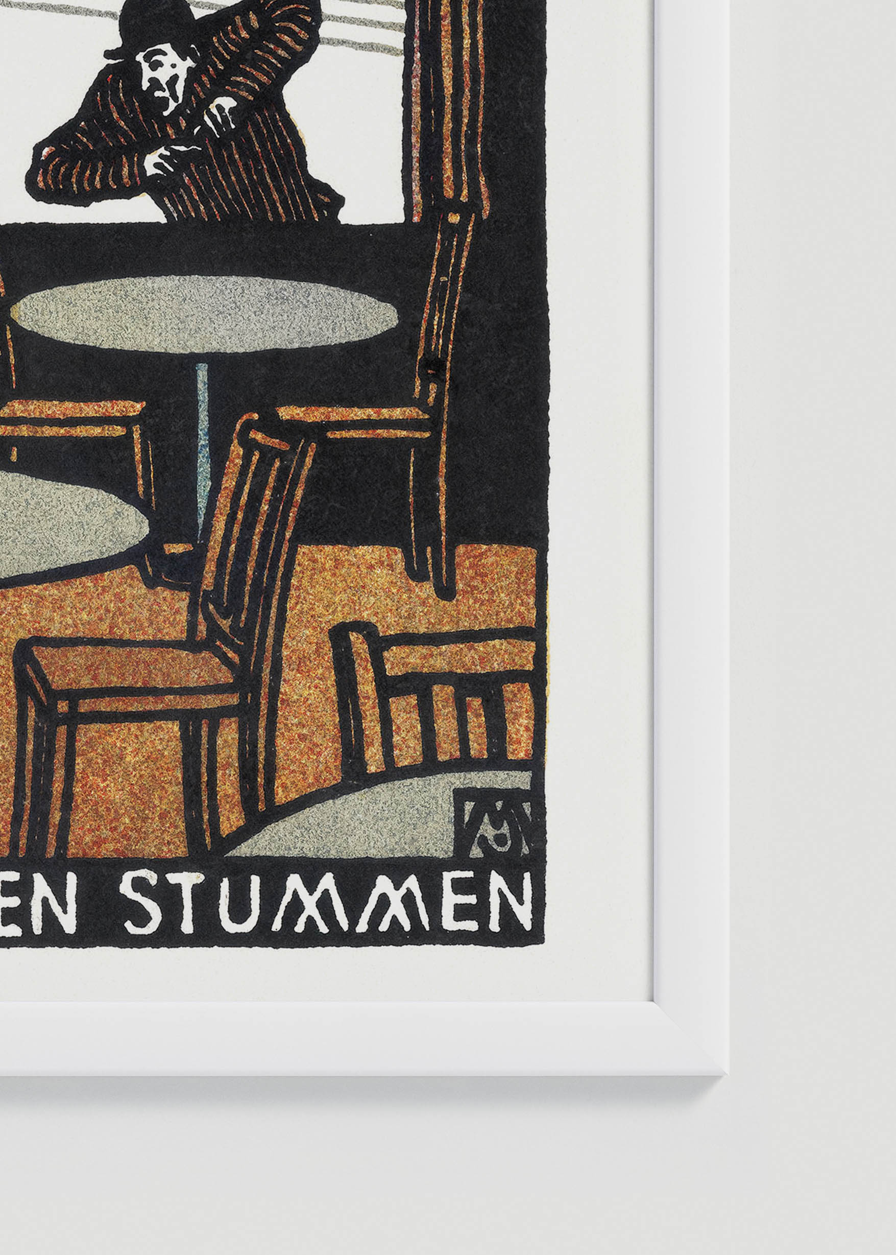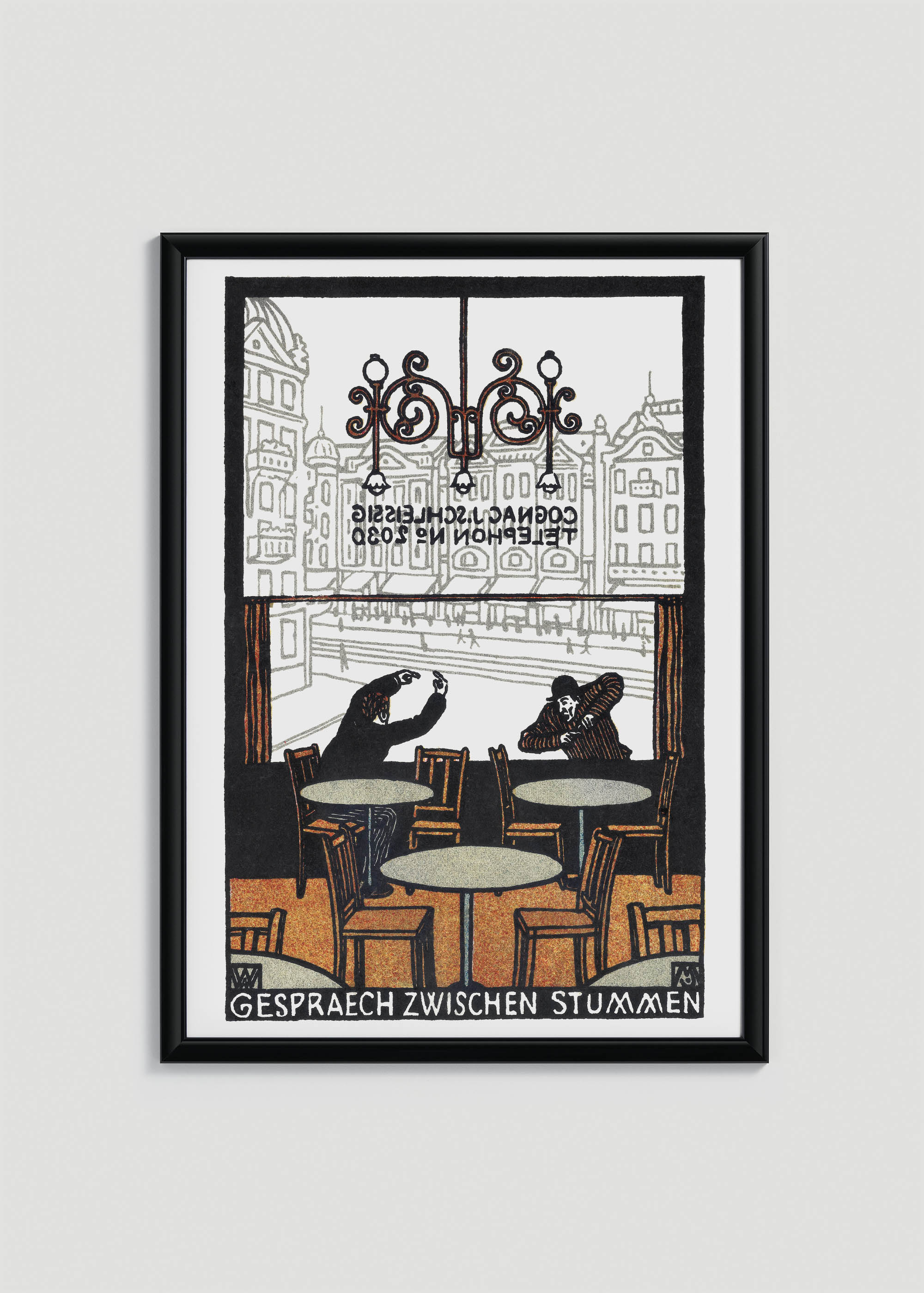 Ten intrygujący plakat będący reprintem wzoru Junga ukazuje scenę z wiedeńskiej kawiarni, gdzie dwoje gości prowadzi niemą konwersację. Kolorystyka utrzymana jest w ciepłych, przytulnych barwach – dominuje głęboka czerń kontrastująca z kremową bielą, wzbogacona o akcenty w odcieniach zbliżonych do sieny palonej i ochry. Charakterystyczne dla secesji dekoracyjne elementy – finezyjnie wywinięte metalowe ornamenty lamp – nadają kompozycji wyszukanej elegancji.