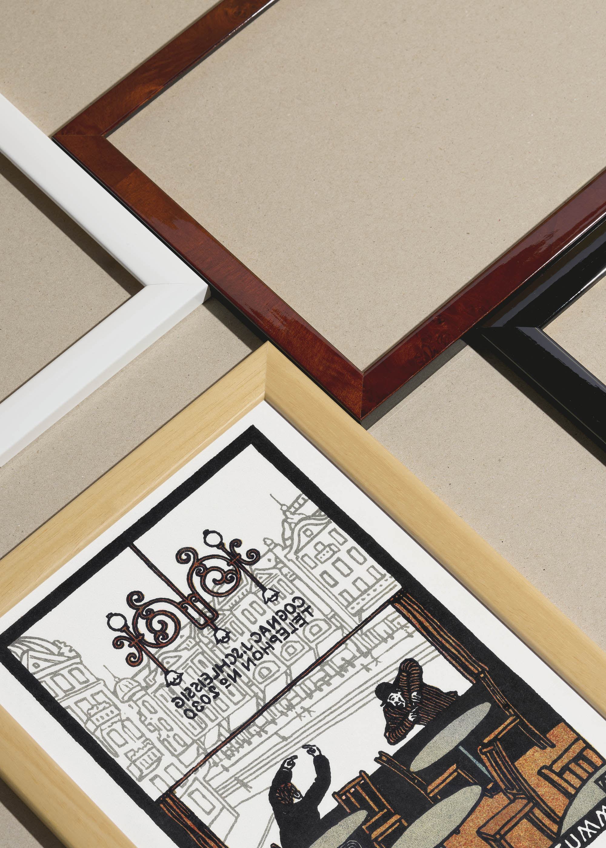 Packshot ramek Plakatello® wykonanych z włoskich i polskich listew ramiarskich. Ramy tworzone ręcznie w pracowni w Lublinie z wykorzystaniem tradycyjnych manualnych narzędzi. Każda rama jest indywidualnie wykańczana i kontrolowana przed wysyłką. Szeroka paleta kolorów pozwala dobrać idealną oprawę do plakatów i obrazów.