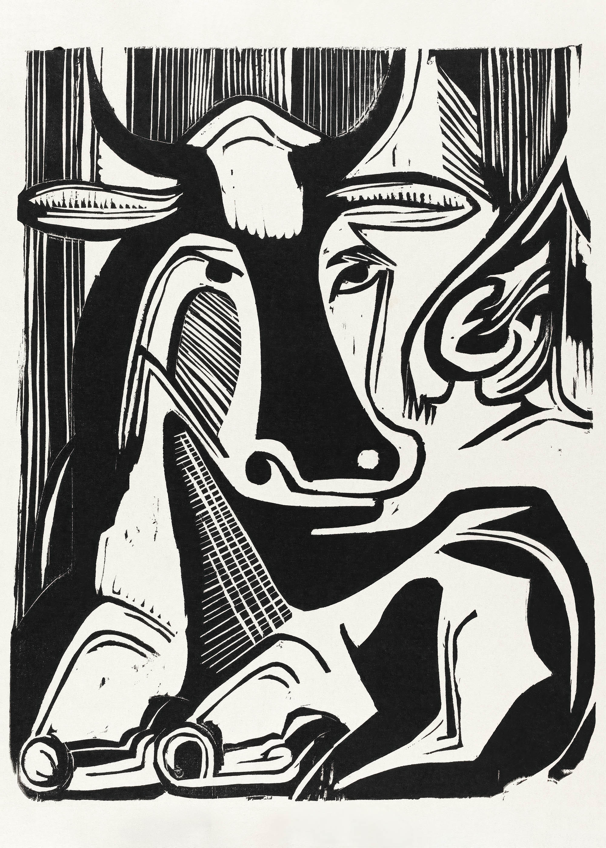 Kompozycja zachwyca swoją surową energią – postać krowy dominuje kadrem z pierwotną mocą, która charakteryzowała całą twórczość tego wybitnego artysty. Kirchner mistrzosko operuje kontrastem czerni i bieli, tworząc dramaturgię światłocienia typową dla techniki drzeworytu. Monochromatyczna paleta w odcieniach grafitu i kości słoniowej podkreśla teatralność przedstawienia, gdzie każda linia wydaje się wyrzeźbiona z niecierpliwością prawdziwego wizjonera.
