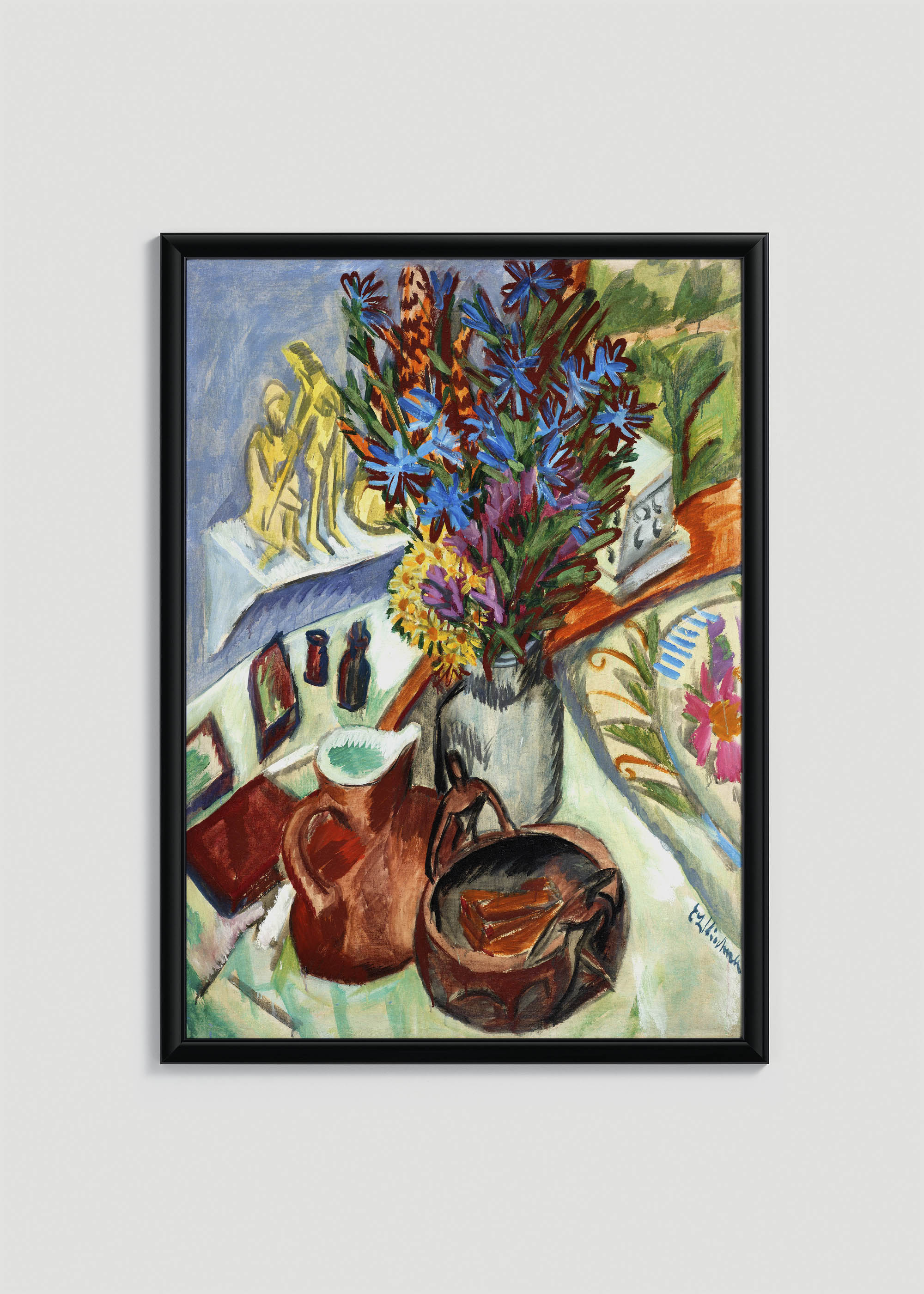 Ten fascynujący plakat przedstawia obraz Martwa natura z dzbanem i afrykańską misą Ernsta Ludwiga Kirchnera, jednego z najważniejszych przedstawicieli niemieckiego ekspresjonizmu. Kirchner, założyciel słynnej grupy artystycznej „Die Brücke” (Most), tworzył na początku XX wieku, rewolucjonizując sposób postrzegania sztuki. Jego intensywna kolorystyka i śmiałe pociągnięcia pędzla odzwierciedlały duszę współczesnego mu świata.