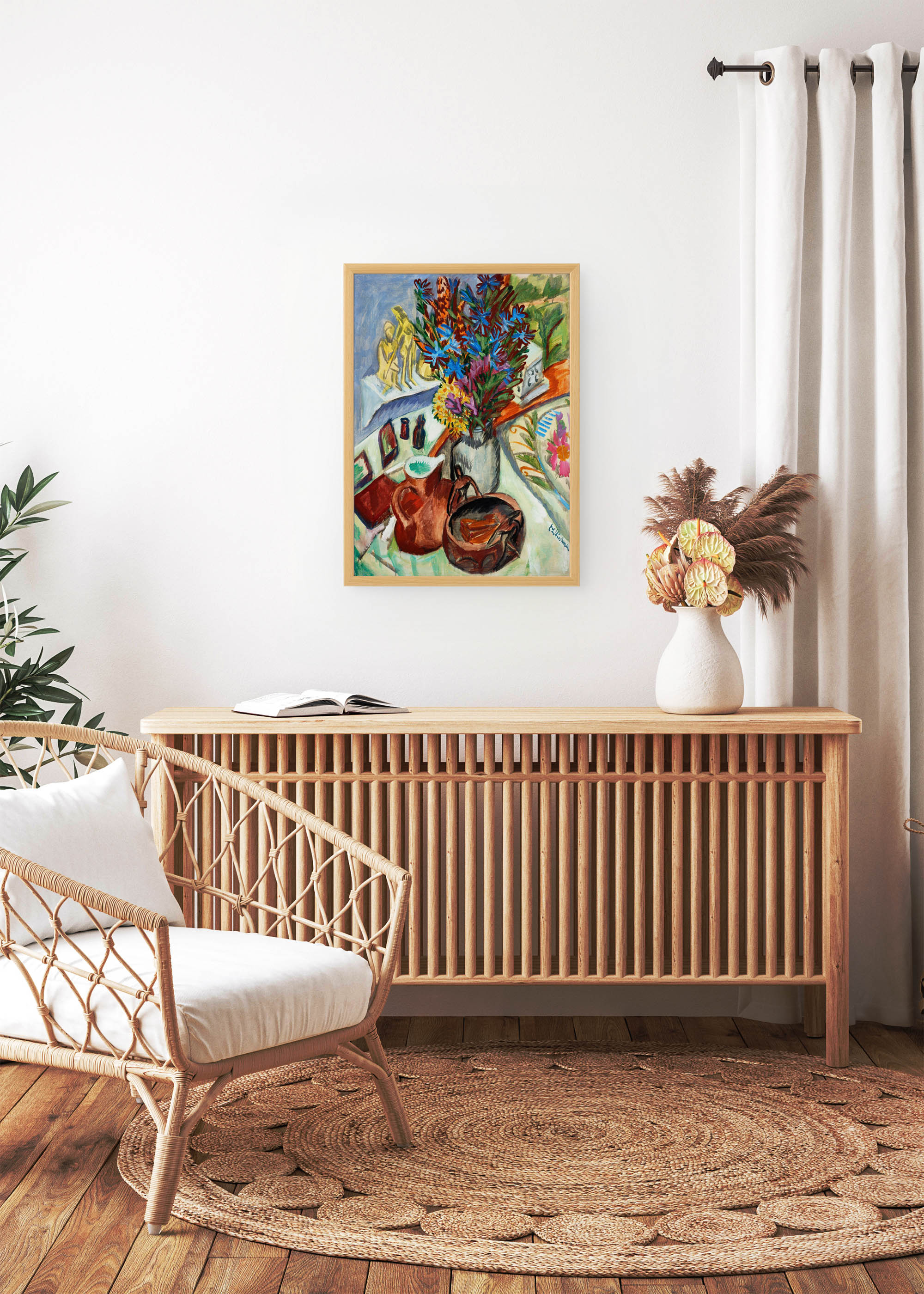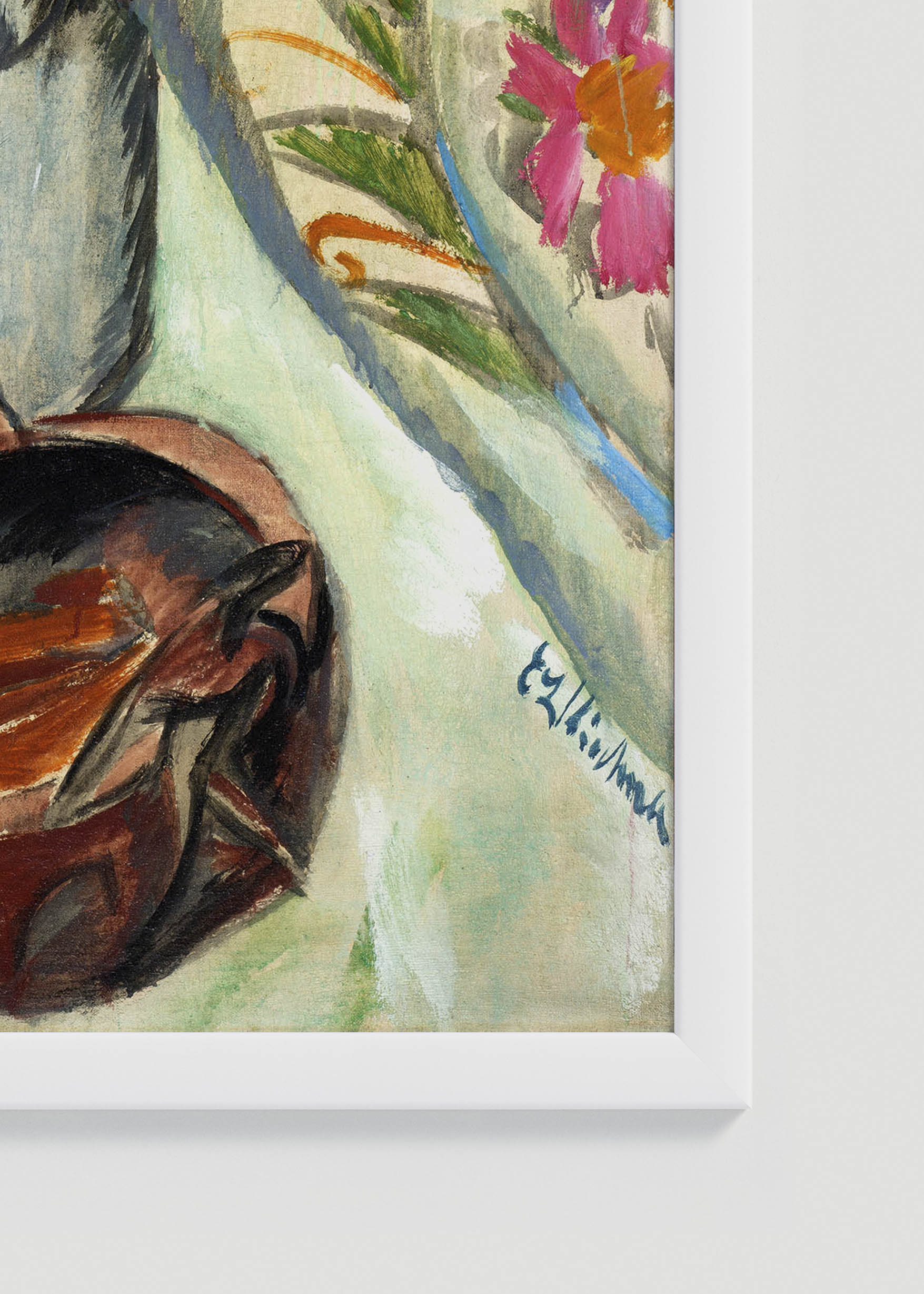Centralnym motywem kompozycji jest bujny bukiet polnych kwiatów – chryzantemy, chabry i ostróżka w błękitnych i amarantowych tonach, które wyrastają z eleganckiego metalowego dzbana. Kolorystyka dzieła opiera się na żywych kontrastach: kobaltowa błękitność nieba zestawiona z cynobrowymi akcentami, podczas gdy ziemiste umbry przeplatają się z kadmowym żółciem. Tło wypełniają dekoracyjne tkaniny o ornamentalnych wzorach, które nadają całości orientalny charakter.