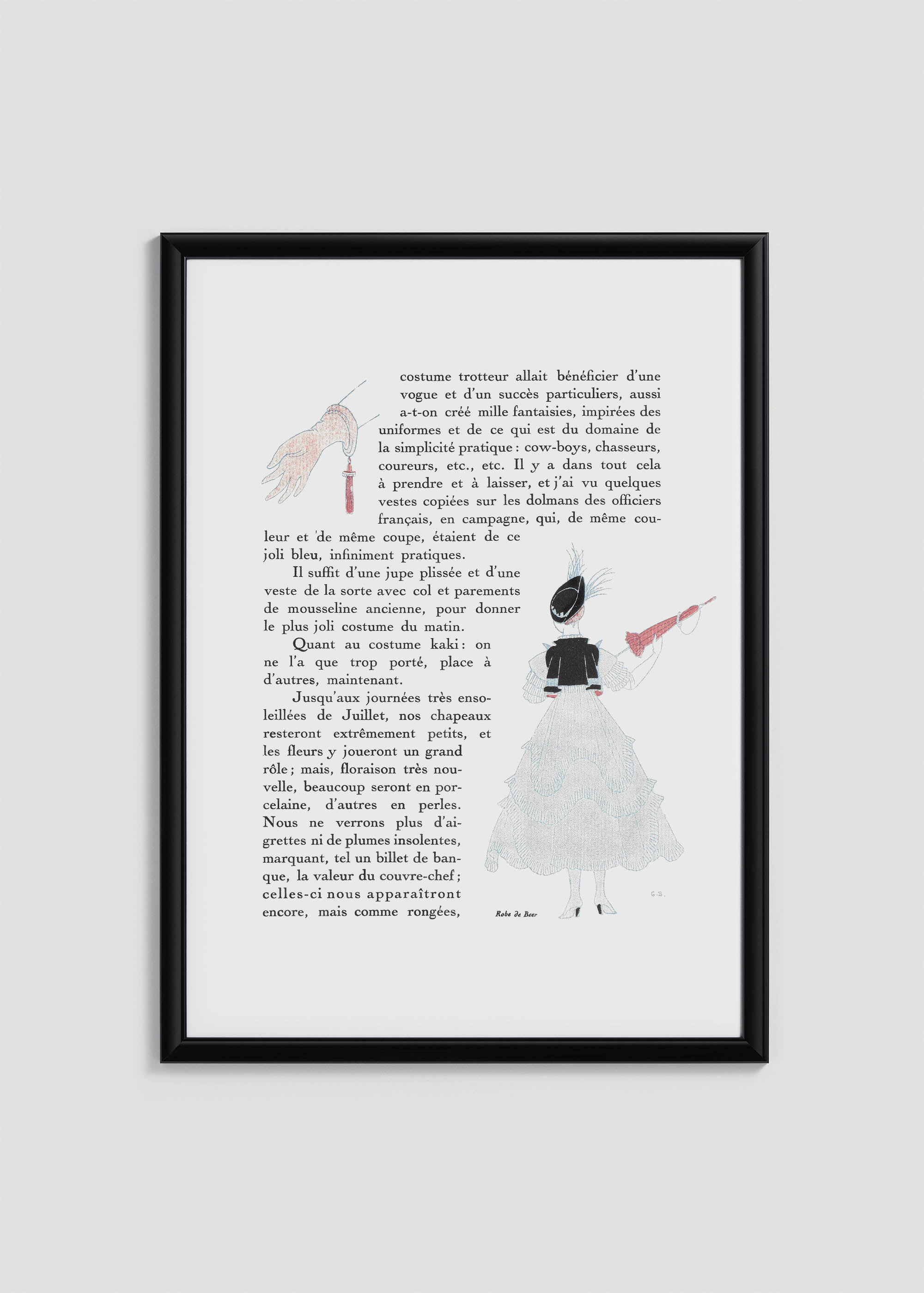 Ten niezwykły plakat przedstawiający kobietę z różową parasolką jest ilustracją mody z początku XX wieku, autorstwa George’a Barbiera – jednego z najwybitniejszych francuskich ilustratorów okresu Art Deco. Barbier, urodzony w 1882 roku w Nantes, zasłynął jako mistrz ilustracji modowych, współpracując z najznakomitszymi domami mody i czasopismami takimi jak „Gazette du Bon Ton” czy „Journal des Dames et des Modes”. Jego prace charakteryzowały się niezwykłą finezją, delikatnością kreski i doskonałym wyczuciem proporcji.