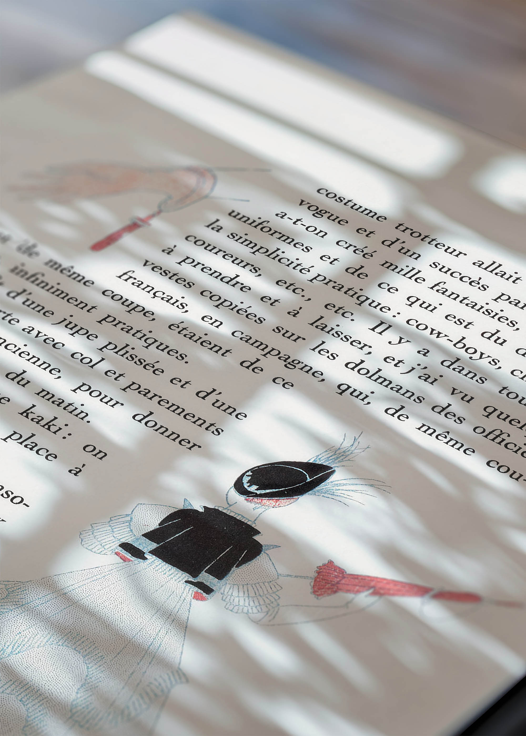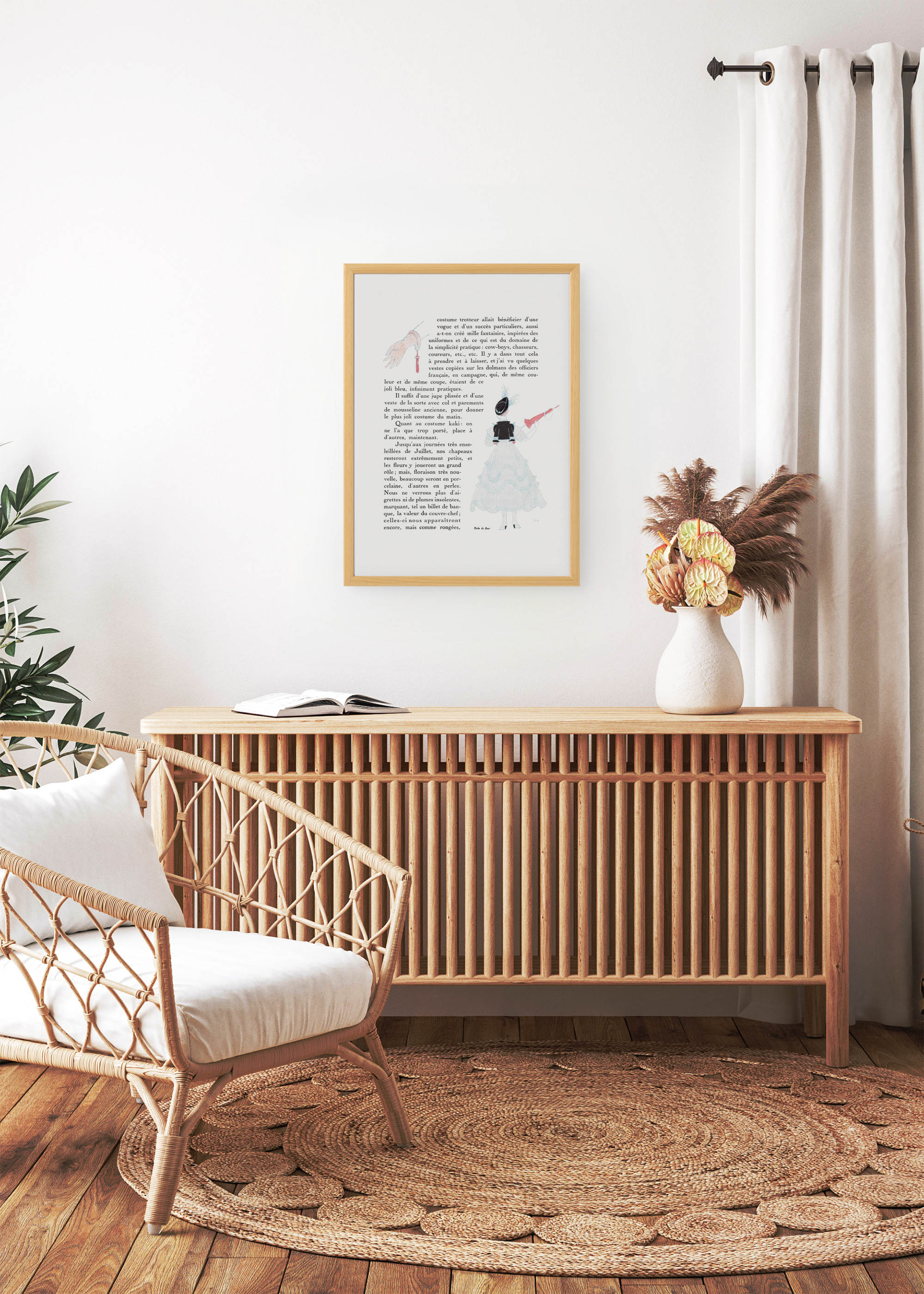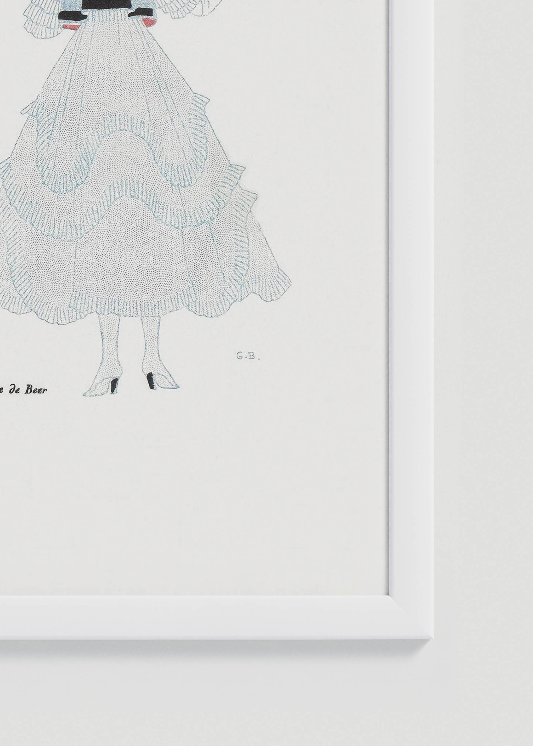 Na plakacie widzimy wyrafinowaną damę w wykwintnej kreacji – czarny gorset kontrastuje z rozłożystą, białą spódnicą ozdobioną subtelnym wzorem. Całość dopełnia ekstrawagancki kapelusz z piórami oraz różowy akcent w postaci parasolki. Kolorystyka jest niezwykle wysublimowana – dominuje klasyczna elegancja bieli i czerni, przełamana akcentami szkarłatnej czerwieni i delikatnych tonów błękitu. W tle dostrzegamy subtelne motywy roślinne w pastelowych odcieniach.