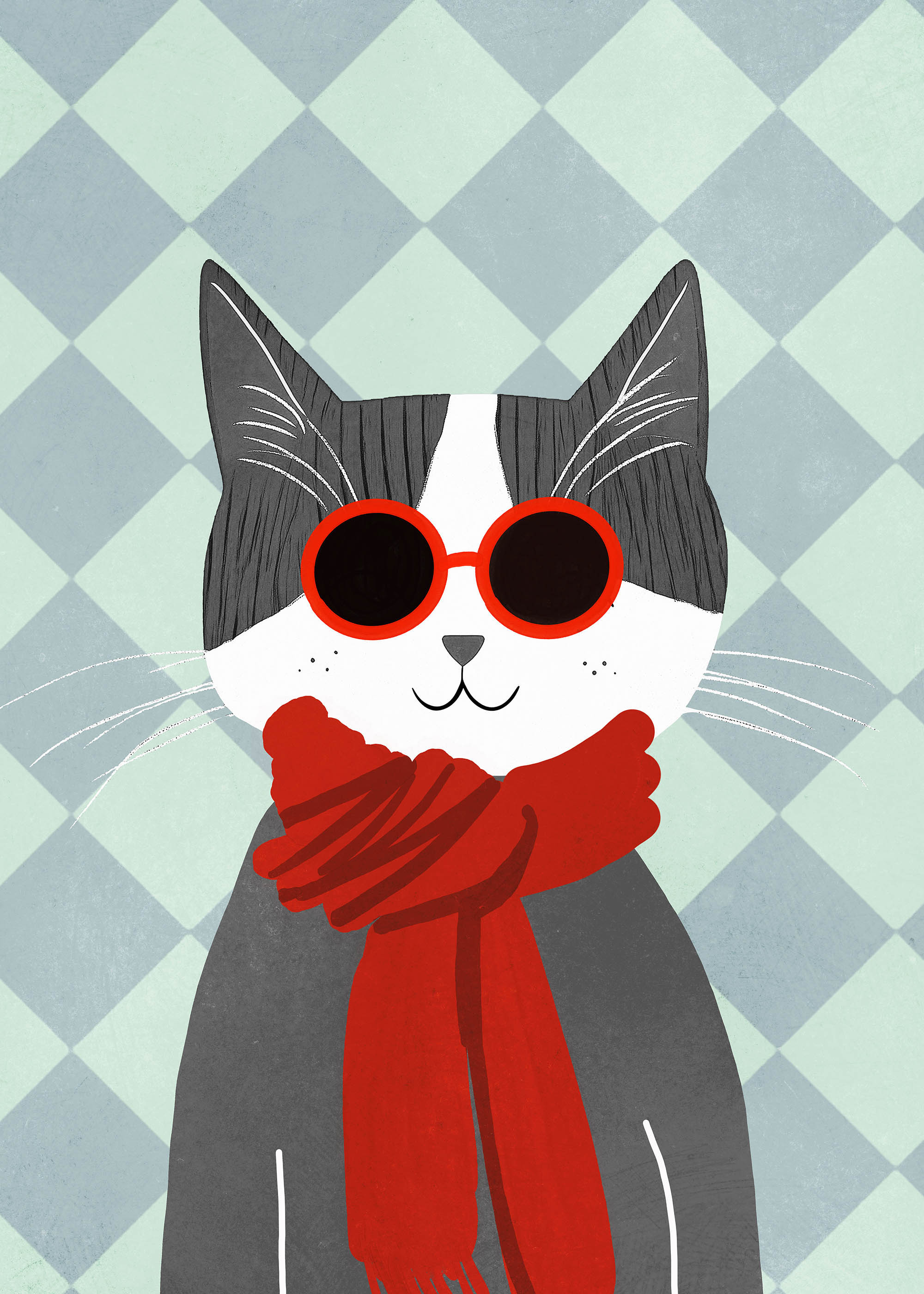 Kolorystyka tej ilustracji to mistrzowskie połączenie stonowanych i żywych barw. Dominują tu delikatne szarości przypominające perłową mgiełkę, kontrastujące z intensywną kadmową czerwienią szalika i okularów. Tło w kratkę utrzymane w pastelowych odcieniach mięty i błękitu nadaje całości subtelnego, skandynawskiego charakteru. Biała mordka kota z czarnym noskiem i uśmiechem dodaje kompozycji świeżości.