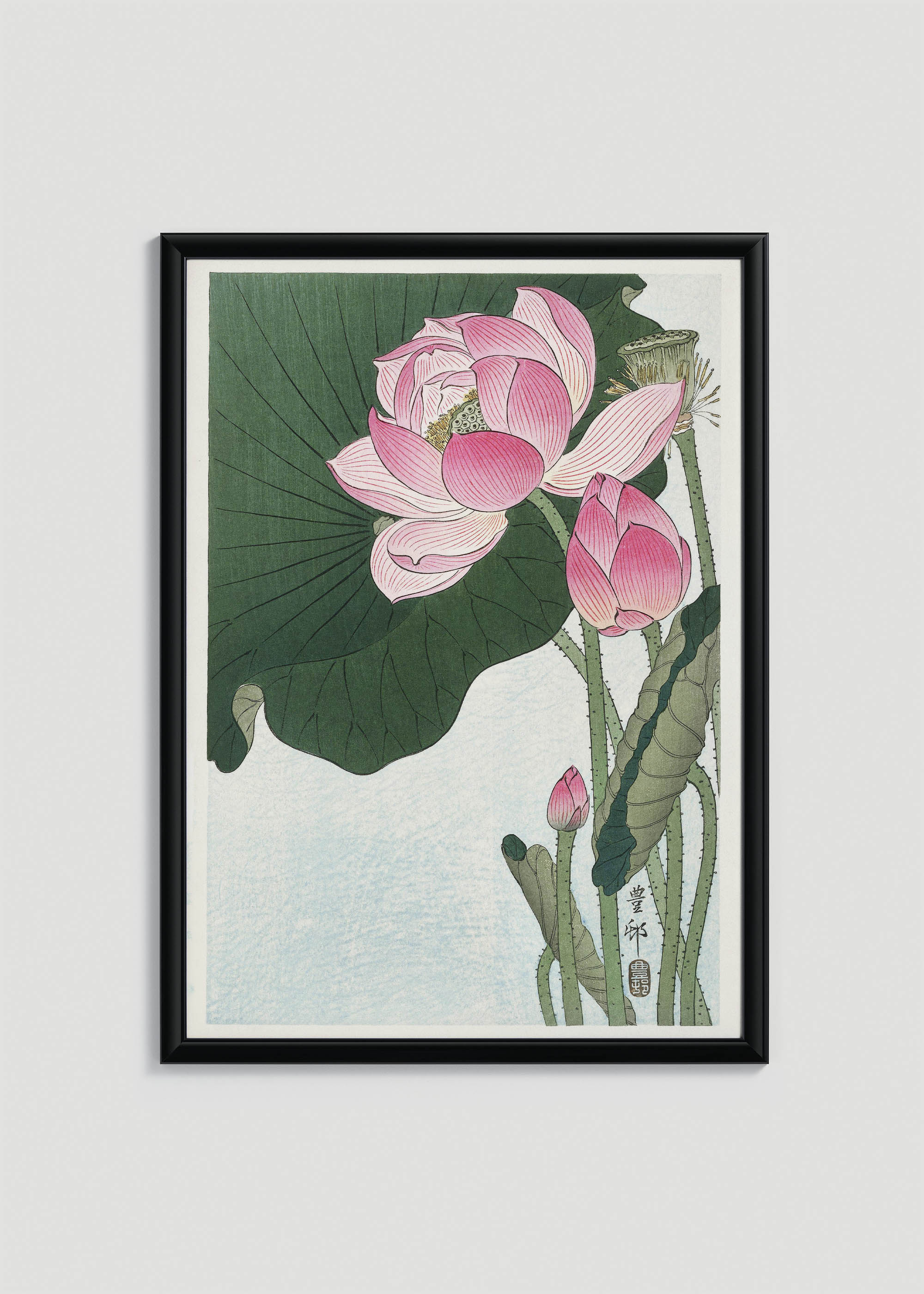 Plakat przedstawiający dzieło „Kwitnący lotos” autorstwa Ohary Kosona (1877-1945), jednego z najwybitniejszych mistrzów japońskiego drzeworytu shin-hanga. Ten wspaniały reprint pochodzi z okresu największego rozkwitu twórczości artysty, przypadającego na lata 20. i 30. XX wieku. Koson, znany również jako Shōson, zasłynął jako niezrównany obserwator przyrody, a jego prace cechuje niezwykła dbałość o szczegóły botaniczne oraz mistrzowskie operowanie światłocieniem.