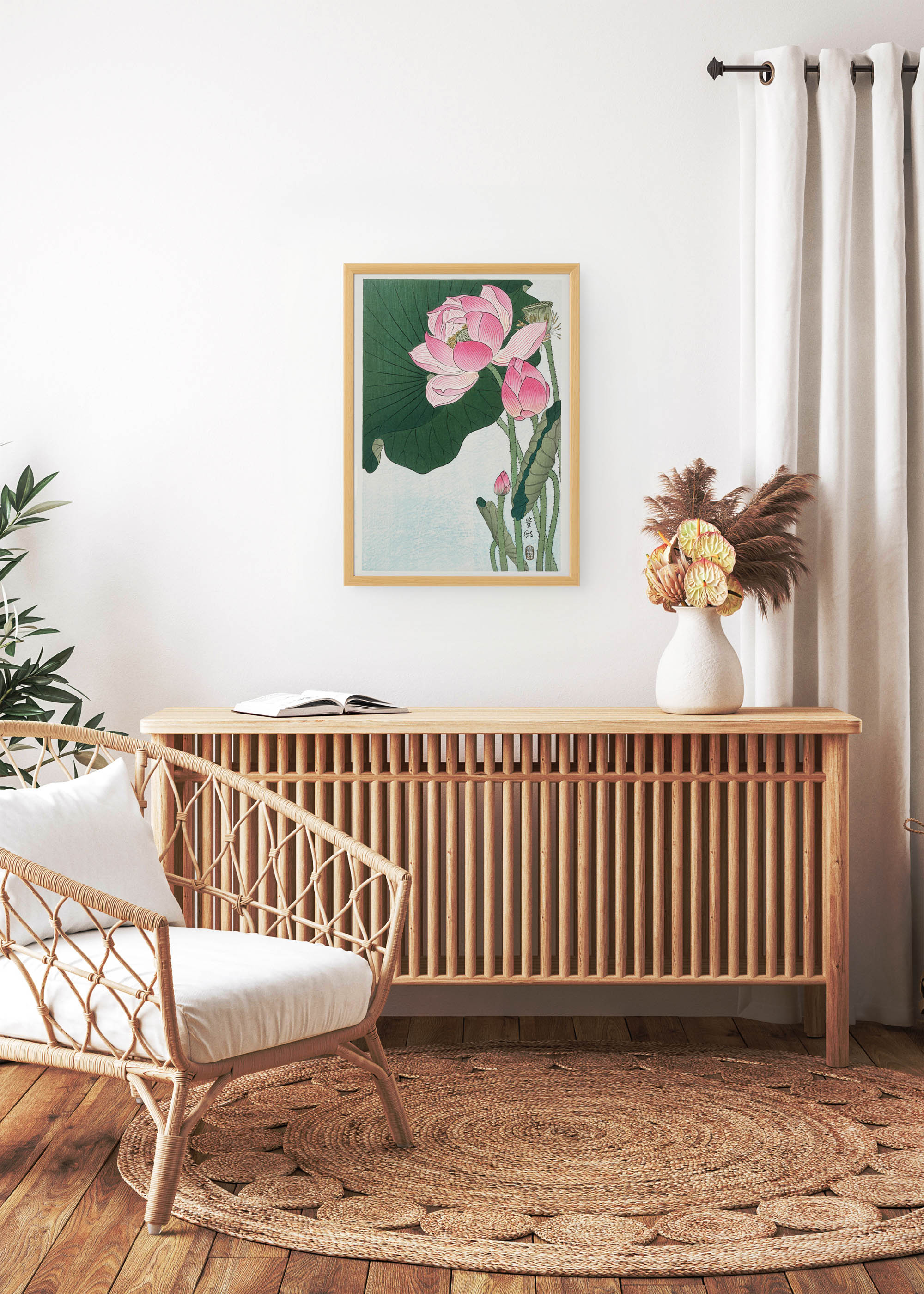 Ten plakat będzie doskonałym uzupełnieniem wnętrz w stylu japandi czy minimalistycznym, gdzie ceni się harmonię i spokój. Idealnie wpasuje się w aranżacje z naturalnymi materiałami – drewnem, lnem czy rattanem. Plakatello poleca ten wzór szczególnie do sypialni lub przestrzeni medytacyjnych, gdzie subtelna elegancja lotosu wprowadzi atmosferę zen i wyciszenia. Pięknie komponuje się z dodatkami w odcieniach terakoty, szarości czy kremowej bieli.