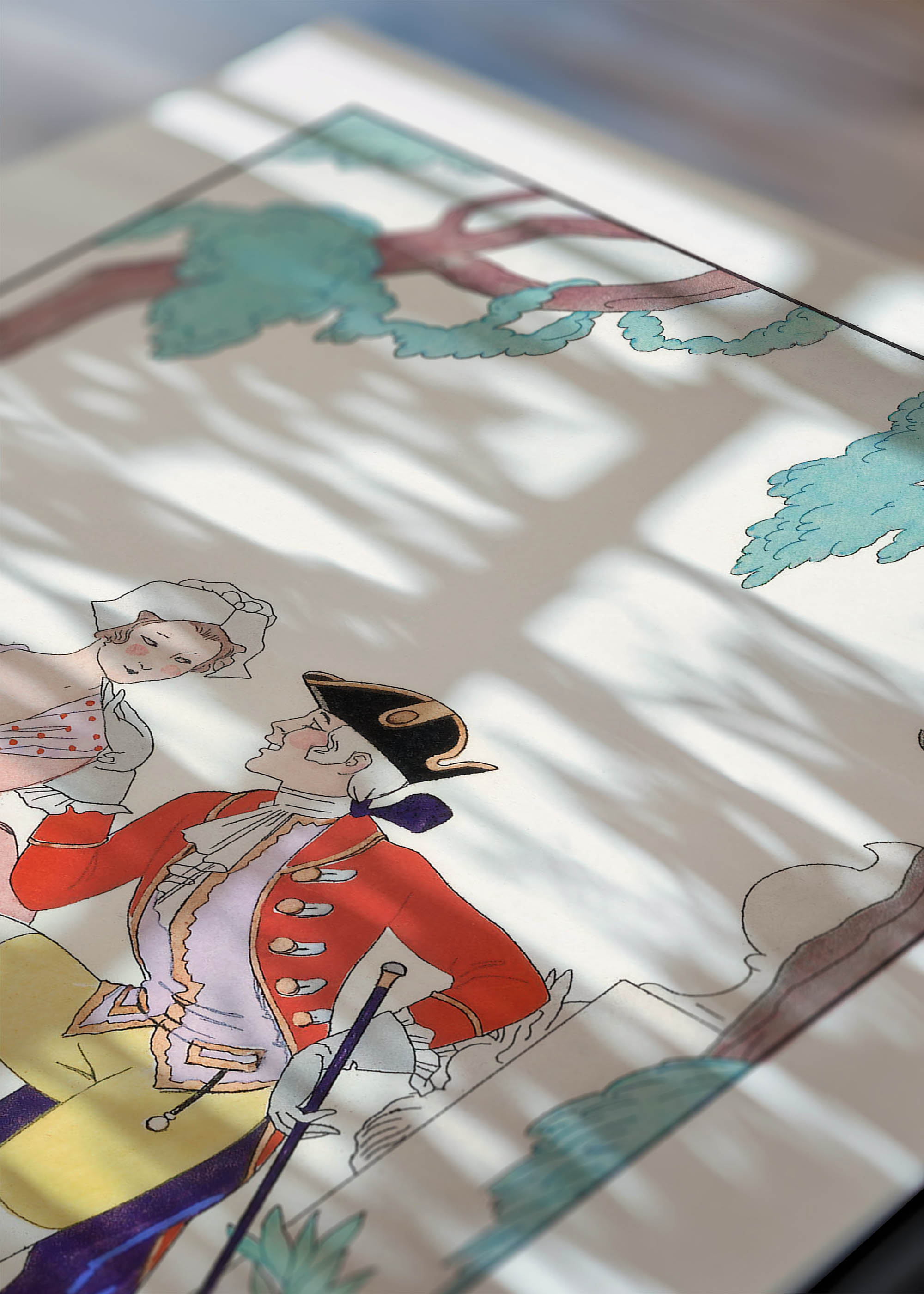Kompozycja przedstawia romantyczną scenę spotkania eleganckiej damy z kawalerzysta w ogrodowym zakątku. Delikatna kolorystyka opiera się na pastelowych tonach różu, zbliżonych do barwy różowego kwarcu, które harmonijnie współgrają z lawendowymi i fiołkowymi akcentami spódnicy damy. Mundur kawalera mieni się szkarłatną czerwienią z odcieniami karmazynowymi, kontrastując ze słoneczną żółcią jego bryczesów. Turkusowe listowie w tle nadaje całości świeżości, przypominając barwy morskiej bryzy.