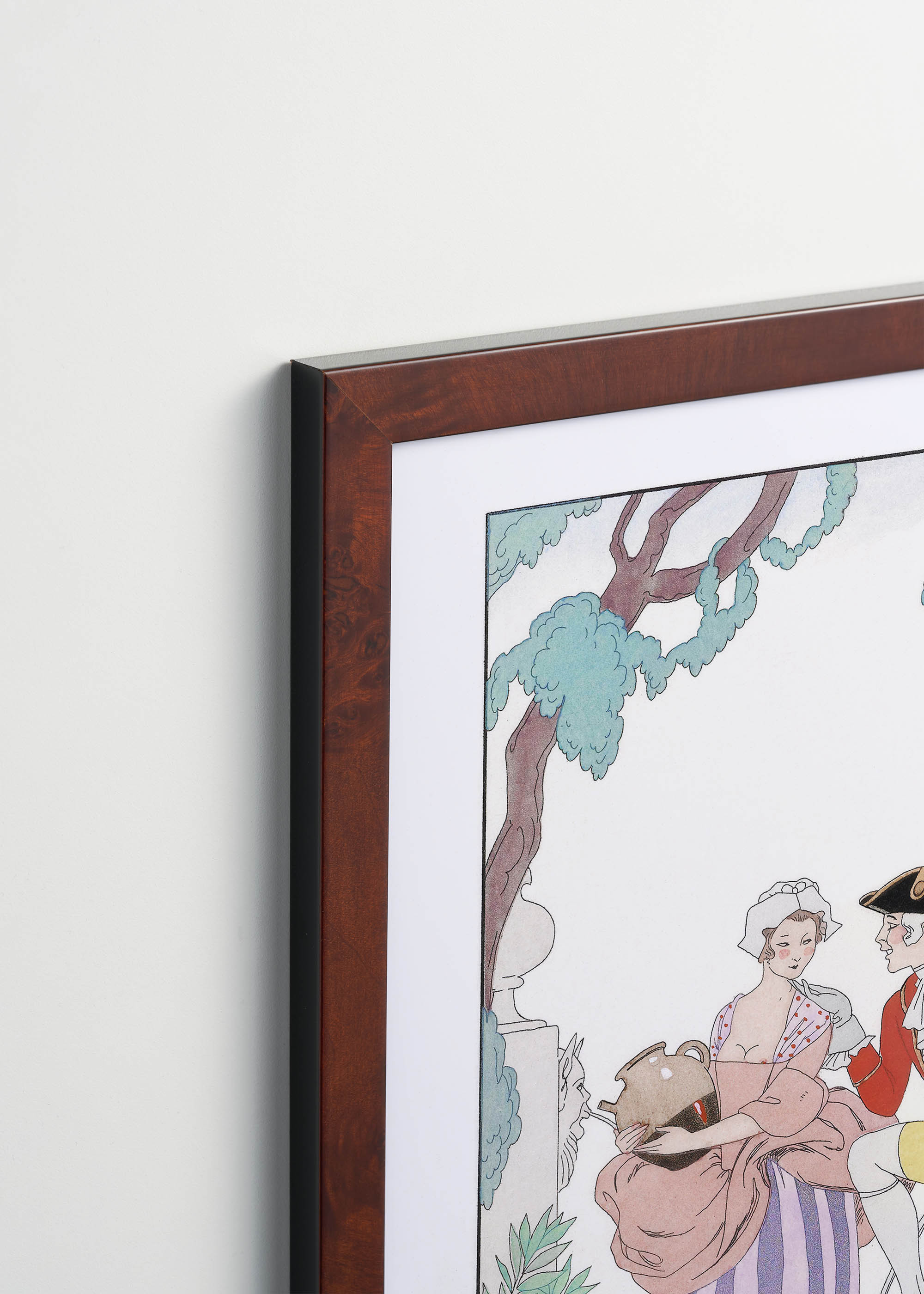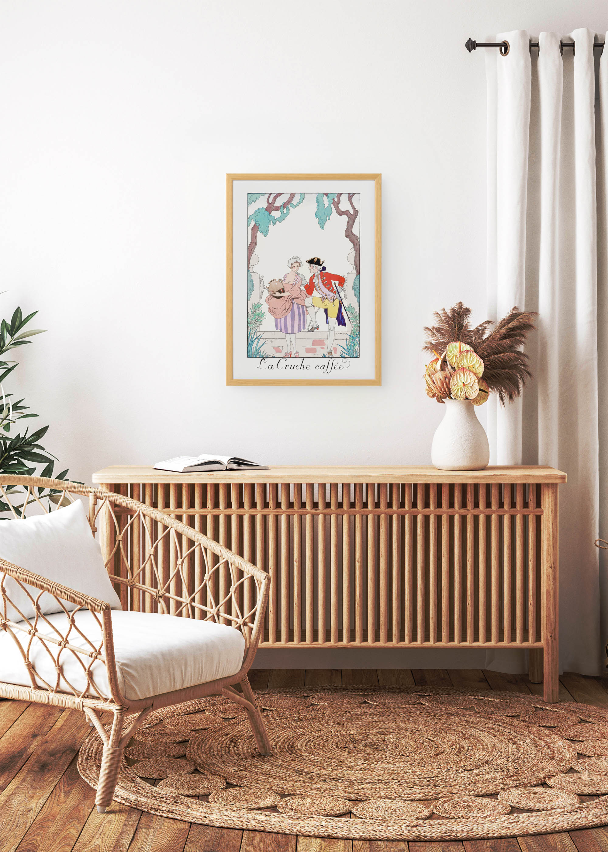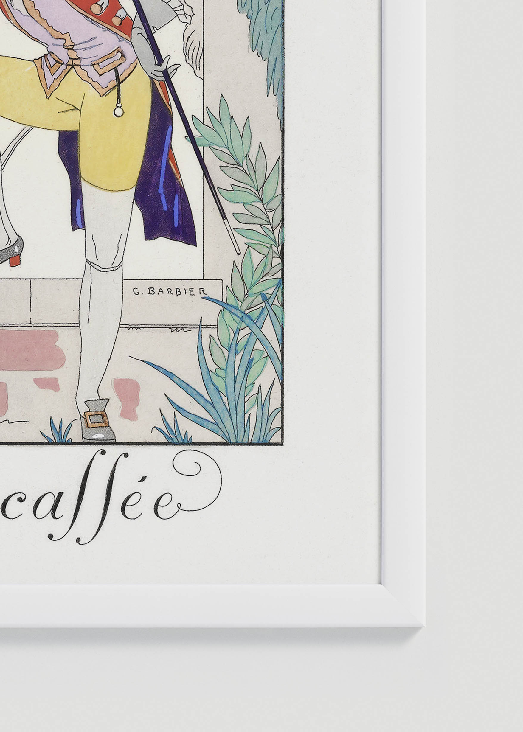 Plakat „La Cruche cassée” autorstwa George’a Barbiera to prawdziwa perła francuskiego art déco, stworzona około 1920 roku przez jednego z najwybitniejszych ilustratorów mody swojej epoki. Barbier, urodzony w Nantes w 1882 roku, zasłynął jako mistrz eleganckich ilustracji, współpracując z prestiżowymi magazynami takimi jak „Gazette du Bon Ton” czy „Journal des Dames et des Modes”. Jego prace charakteryzowały się niezwykłą finezją i wyrafinowaniem, a „La Cruche cassée” (Rozbity dzban) doskonale oddaje ducha galanterii XVIII-wiecznej Francji.