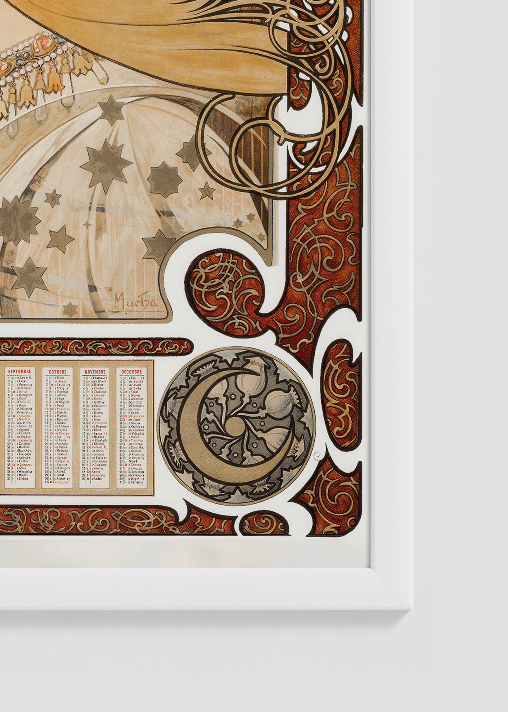 Plakat przedstawiający to kultowe dzieło emanuje ciepłą, miodową kolorystyką z dominującymi tonami ochry, bursztynu i karmelu. Delikatne akcenty szałwiowej zieleni w tle tworzą subtelny kontrast, podczas gdy kremowe i piaskowe odcienie nadają całości szlachetnej miękkości. Charakterystyczny dla Muchy bizantyjski nimb otacza głowę modelki, wypełniony motywami zodiakalnych symboli w barwach zbliżonych do starego złota.