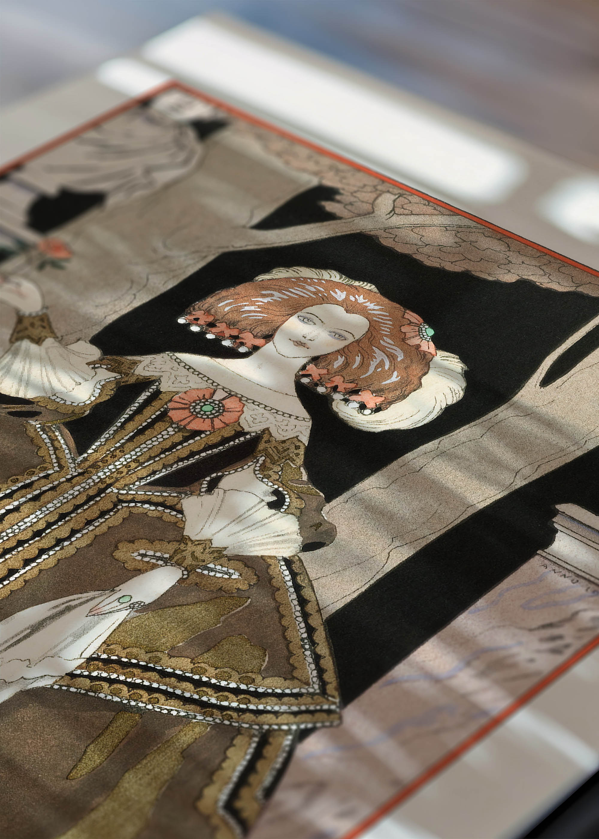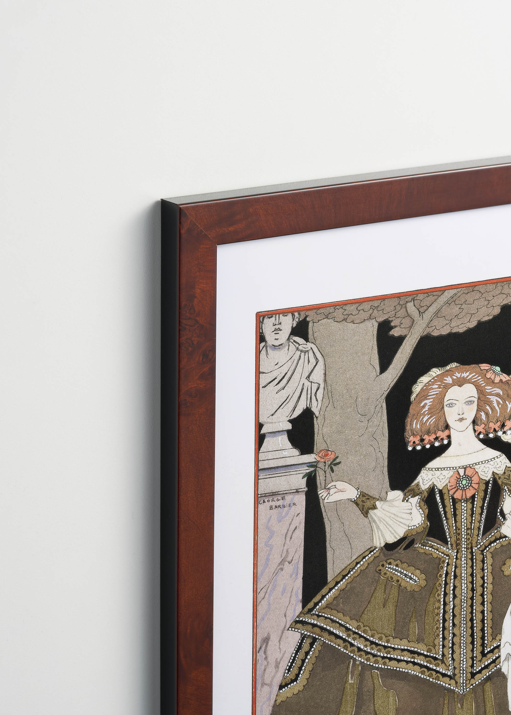 Kompozycja przedstawia wykwintną damę w monumentalnej sukni balowej, której sylwetka przywodzi na myśl hiszpańskie infantki z obrazów Velázqueza. Kolorystyka plakatu to prawdziwa uczta dla oczu – dominują ciepłe, miodowe tony brązu przełamane perłowymi akcentami i delikatnymi, pudrowymi różami. Czarne tło kontrastuje z jasnością postaci, nadając całości teatralnego charakteru. Barbier mistrzowsko operuje paletą barw zbliżonych do sepii i umbry, wzbogacając je o subtelne akcenty koralowej czerwieni widocznej w kwiatowej broszce.