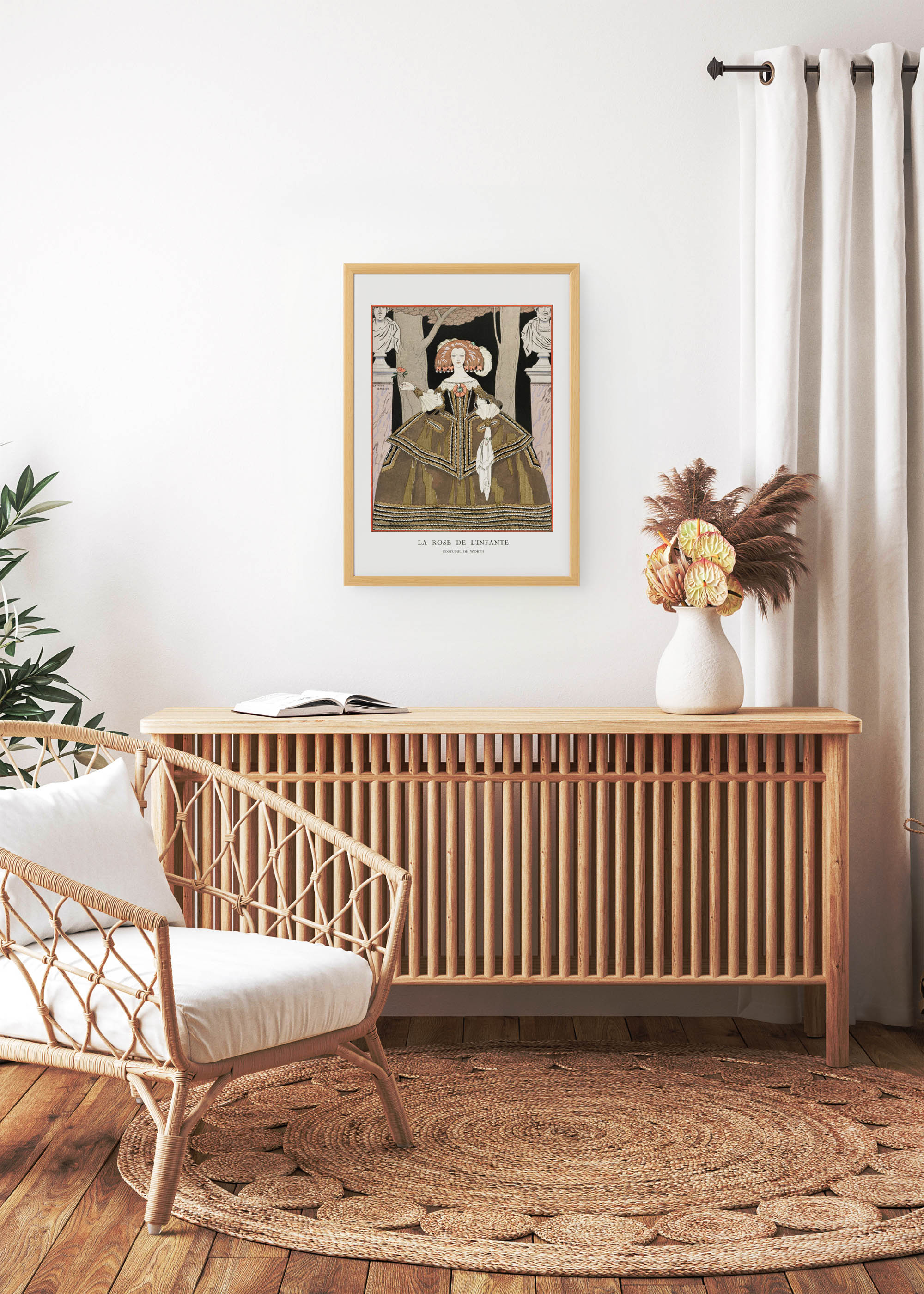 „La Rose de l’Infante” – mistrzowskie dzieło George’a Barbiera, jednego z najwybitniejszych ilustratorów mody epoki Art Deco. Ten niezwykły plakat powstał w 1924 roku jako część serii ilustracji modowych dla prestiżowego domu mody Worth. Barbier, urodzony w Nantes w 1882 roku, zasłynął jako kronikarz paryskiej elegancji, a jego prace regularnie zdobiły łamy najbardziej ekskluzywnych magazynów tamtych czasów, takich jak „Gazette du Bon Ton” czy „Journal des Dames et des Modes”.
