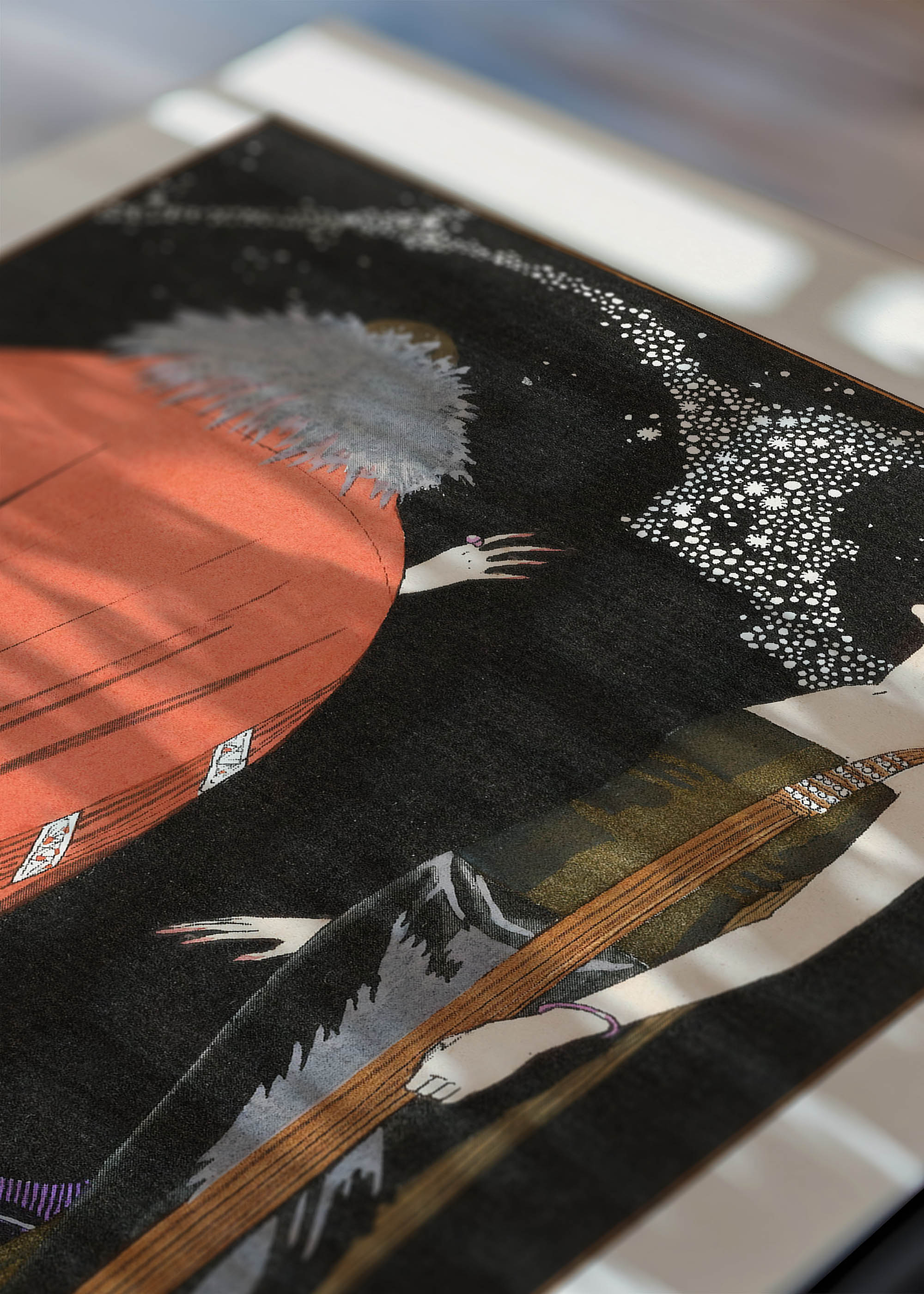 Kompozycja zachwyca dramatycznym kontrastem między ciemnością nocnego nieba a delikatnością postaci. Kobieca sylwetka w eleganckiej sukni o barwach zbliżonych do ciepłego khaki z miedziowymi refleksami, ozdobiona długimi frędzlami, emanuje wyrafinowaniem epoki jazz. Jej towarzyszka w płaszczu o intensywnej ceglastej czerwieni z szarym futrzanym kołnierzem dodaje scenie teatralności. Tło wypełniają migoczące konstelacje gwiazd, tworzące mistyczną aurę.