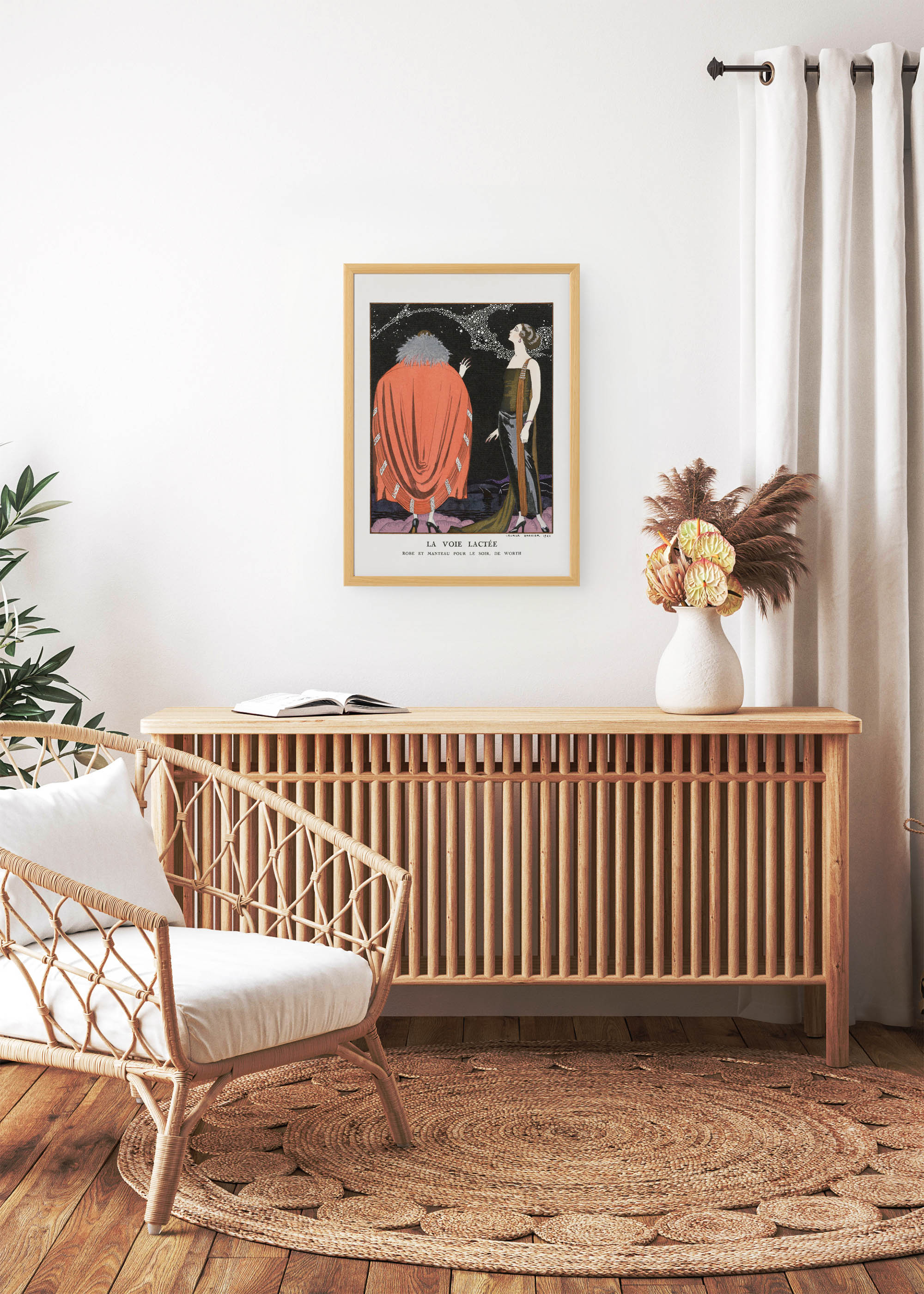 George Barbier, mistrz Art Deco i jeden z najwybitniejszych ilustratorów mody lat 20. XX wieku, stworzył w 1921 roku niezwykłą pracę zatytułowaną „La Voie Lactée” (Droga Mleczna). Ta wyjątkowa ilustracja, pierwotnie opublikowana w ekskluzywnym magazynie „Gazette du Bon Ton”, przedstawia wieczorową kreację domu mody Worth – jednego z pionierów haute couture.