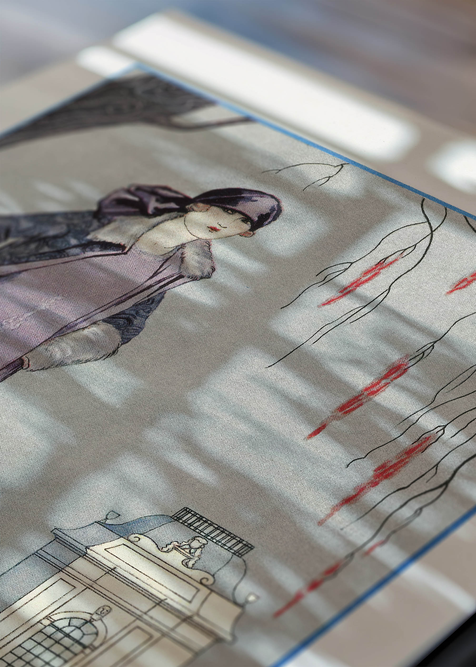 Plakat przedstawia dystyngowaną damę w fioletowo-szarej kreacji, stojącą na tle stylizowanego pawilonu ogrodowego. Kolorystyka utrzymana jest w subtelnych, przygaszonych tonach – dominują barwy zbliżone do lawendowego fioletu, perłowej szarości i delikatnego różu. Akcenty stanowią czerwone pąki zwisające z gałęzi weeping willow, które wprowadzają życie do stonowanej kompozycji. Całość utrzymana jest w charakterystycznej dla Barbiera palecie pastelowej z wyraźnymi konturami.