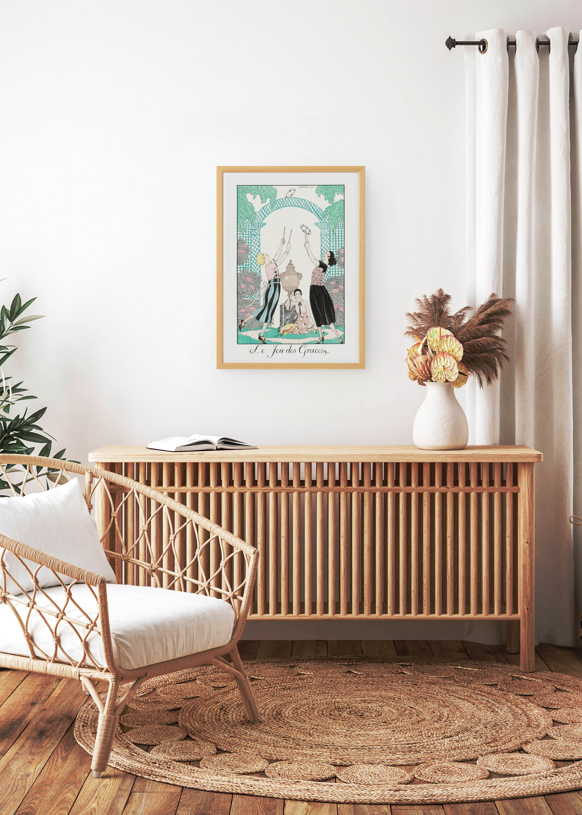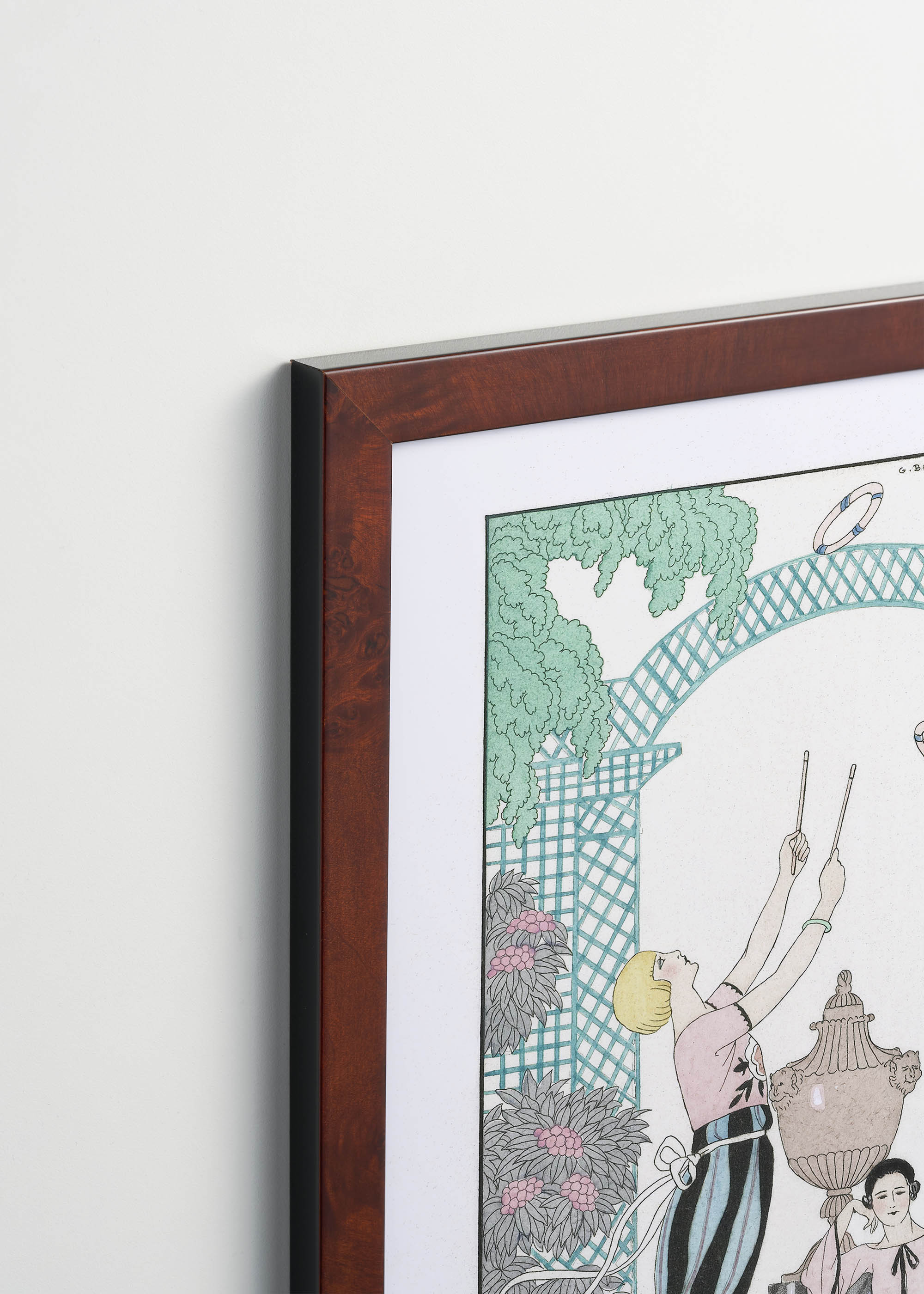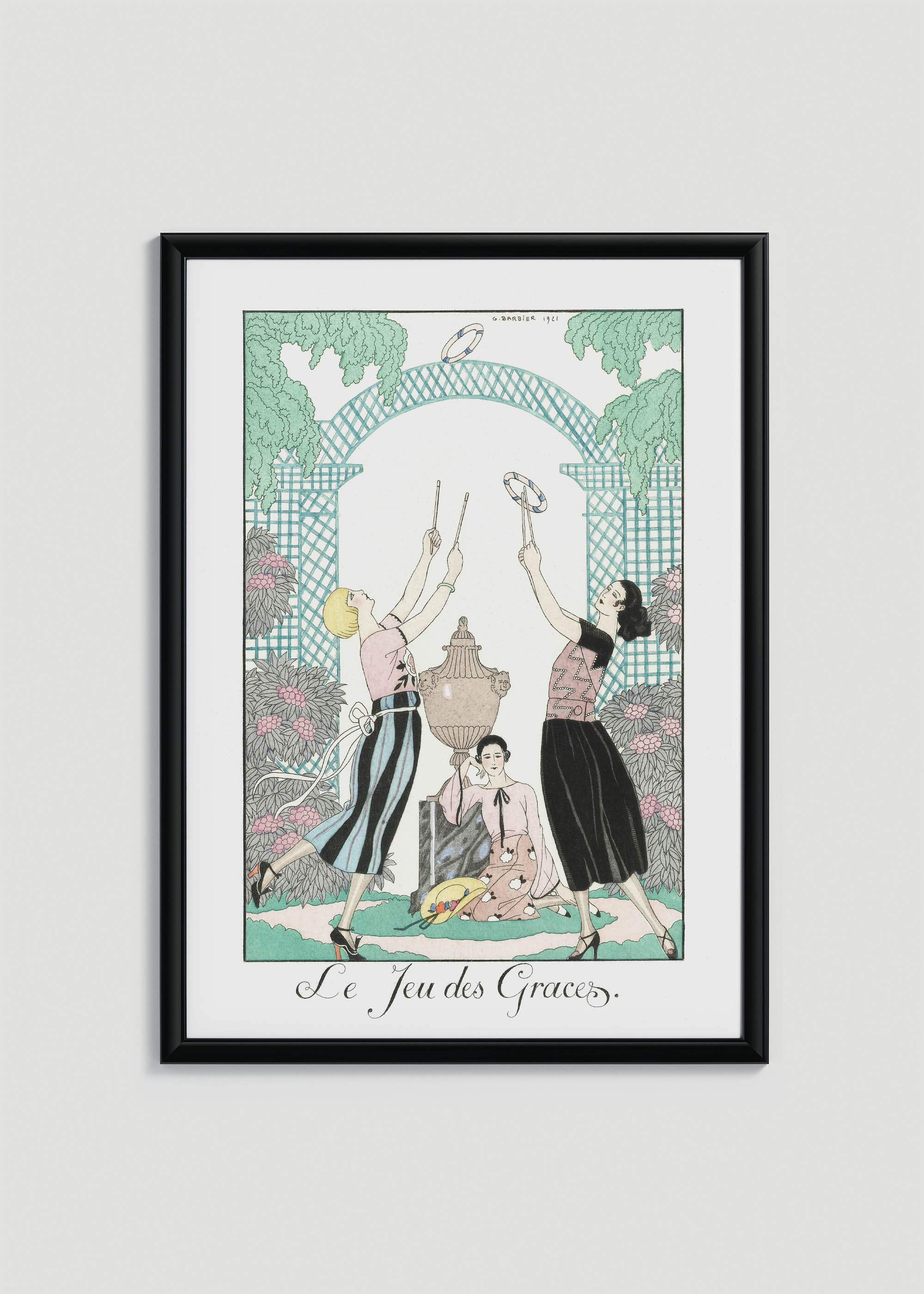 Na plakacie widzimy trzy wysublimowane postacie oddające się grze w gracje – popularnej rozrywce towarzyskiej epoki. Dwie kobiety w strojach typowych dla lat 20. trzymają drewniane pałeczki, którymi przerzucają ozdobne obręcze. Centralna postać siedzi przy klasycystycznej urnie, tworząc harmonijną kompozycję. Kolorystyka jest niezwykle wyrafinowana – dominują pastelowe tony różu lososiowego i bladego błękitu, przełamane głęboką czernią spódnic. Tło wypełnia kratka w odcieniu morskiej zieleni, a bujne liście w barwach zbliżonych do szmaragdowej zieleni tworzą romantyczną oprawę.