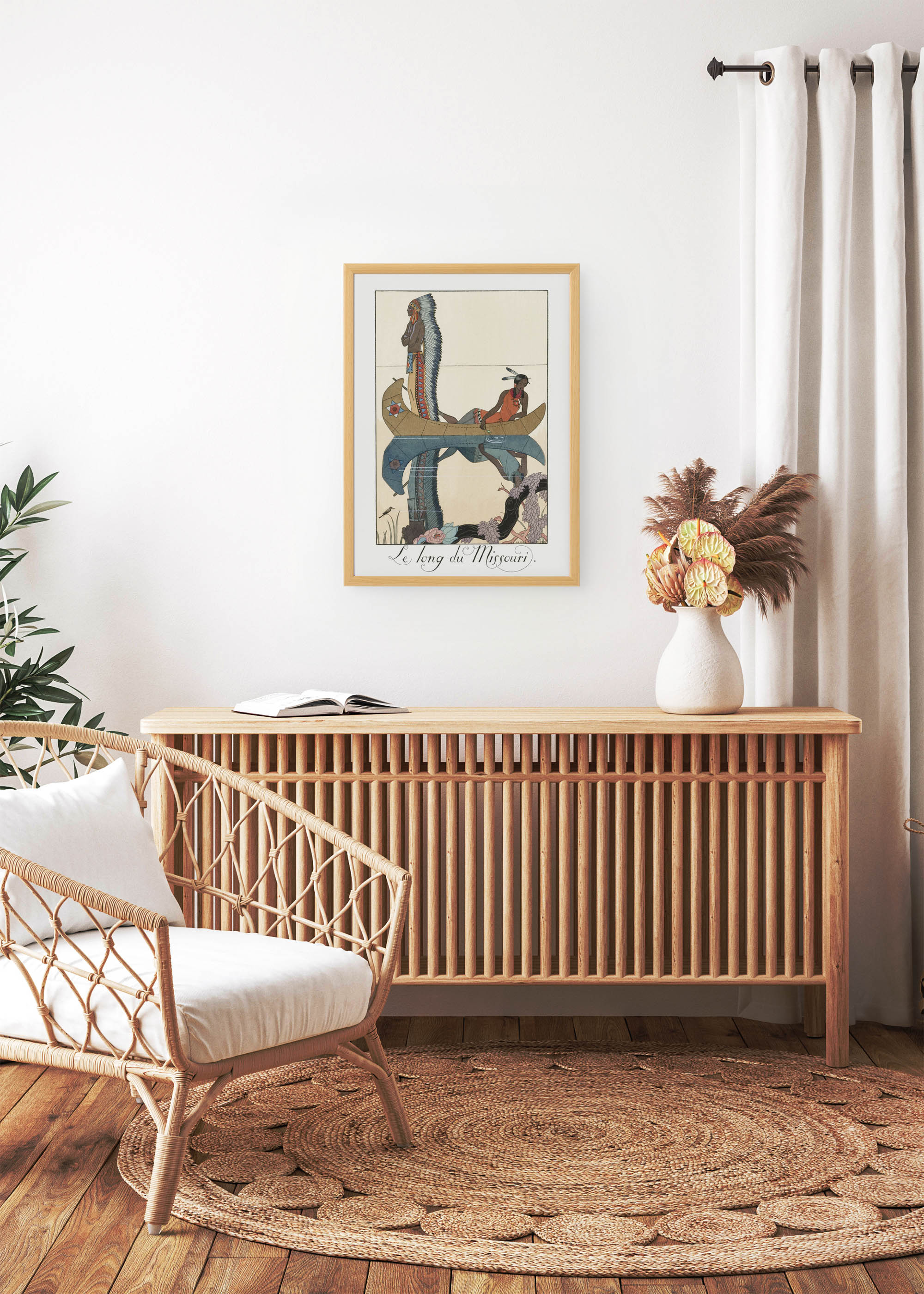 „Le long du Missouri” („Wzdłuż Missouri”) – plakat z wzorem George’a Barbiera to prawdziwa perełka francuskiego art déco, która przenosi nas w egzotyczną podróż wzdłuż amerykańskiej rzeki. Ten wybitny ilustrator mody i grafik, tworzący w złotej erze paryskiego stylu lat 20. XX wieku, stworzył to dzieło w 1922 roku dla prestiżowego magazynu „Gazette du Bon Ton”. Barbier, nazywany „poetą elegancji”, czerpał inspirację z orientalnych motywów oraz fascynacji kulturą rdzennych Amerykanów, co doskonale widać w tej niezwykłej kompozycji.