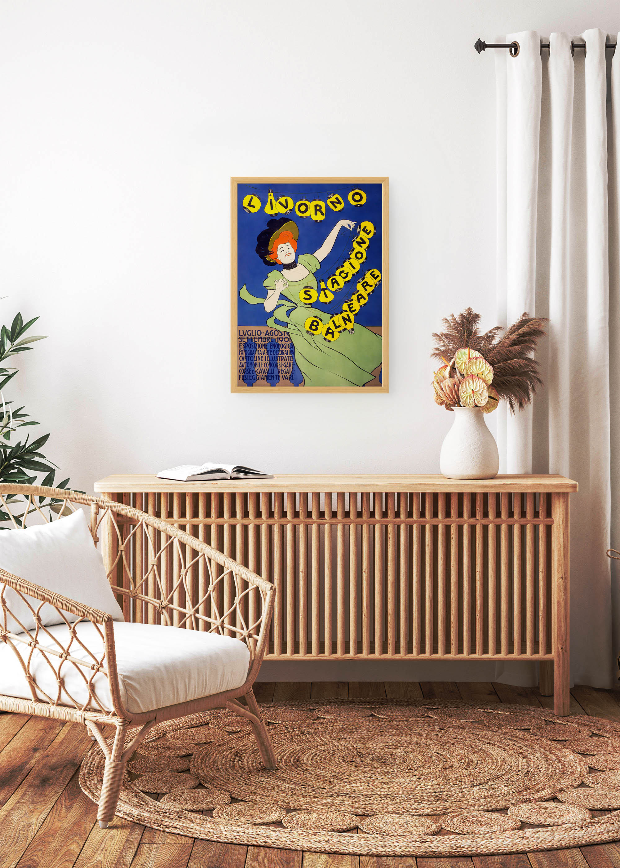 Niezwykły plakat autorstwa Leonetta Cappiello z 1901 roku prezentuje reklamę włoskiego festiwalu w Livorno, który odbywał się od lipca do września. Ten genialny artysta, uznawany za ojca nowoczesnego plakatu reklamowego, stworzył to dzieło w okresie swojej fascynacji dynamiczną kompozycją i śmiałym użyciem koloru. Cappiello, urodzony w Livorno, często tworzył plakaty dla wydarzeń w swoim rodzinnym mieście, łącząc lokalny patriotyzm z rewolucyjnym podejściem do sztuki użytkowej.
