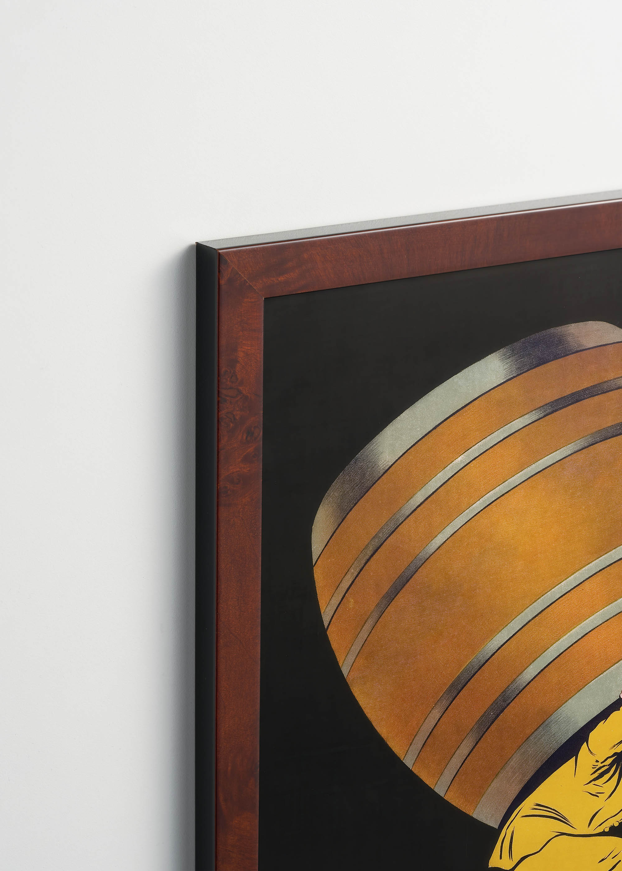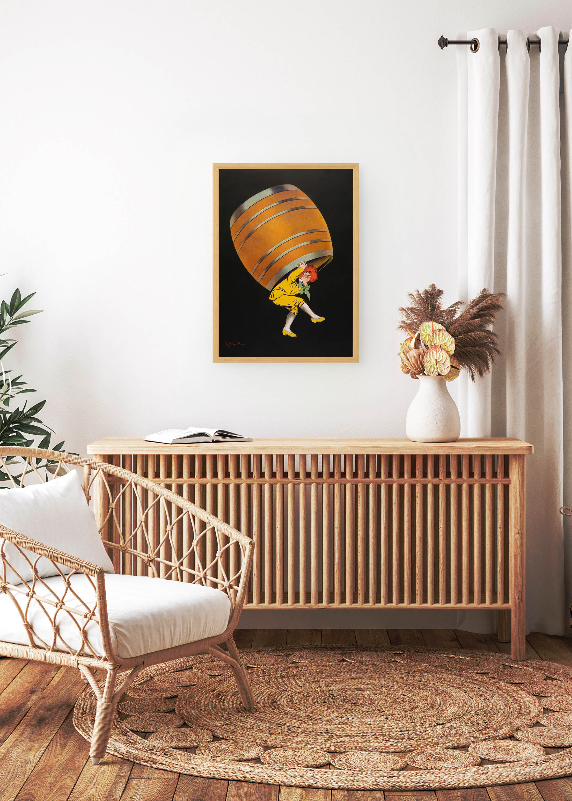 Ten charakterystyczny plakat reklamowy autorstwa Leonetta Cappiella to prawdziwa perła wśród kolekcjonerów sztuki użytkowej początku XX wieku. Przedstawiamy jego wierny reprint. Włoski artysta, uznawany za ojca nowoczesnego plakatu reklamowego, stworzył to dzieło około 1903 roku dla francuskiej marki produkującej beczki i naczynia drewniane. Cappiello, który przybył do Paryża w 1898 roku, zrewolucjonizował świat reklamy, odchodząc od secesyjnych ozdobników na rzecz dynamicznych, pełnych humoru kompozycji.