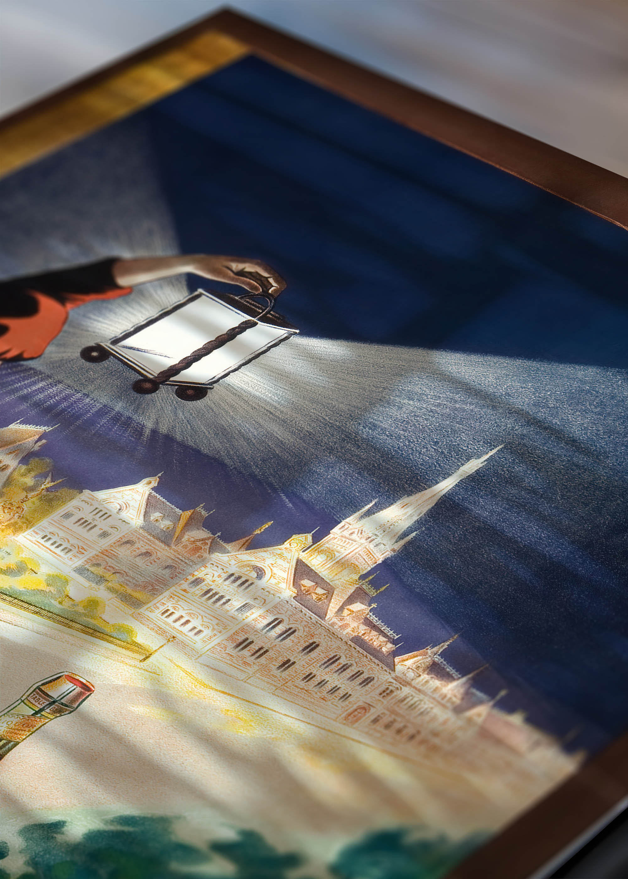 Kompozycja urzeka elegancką sylwetką kobiety w powłóczystej szacie o intensywnej ceglastej czerwieni, która kontrastuje z głębokim szafirem nocnego nieba. Artystka trzyma latarnię, z której bije promienisty snop światła, oświetlający monumentalną architekturę w tle – najpewniej budapesztański parlament lub inny reprezentacyjny gmach europejski. Paleta barw oscyluje wokół ciepłych pomarańczy i chłodnych kobaltów, tworząc harmonijną grę kontrastów.