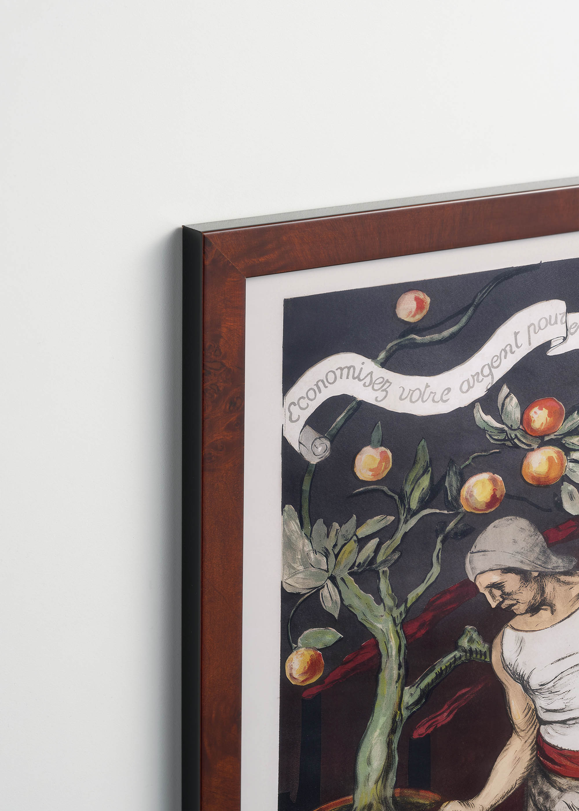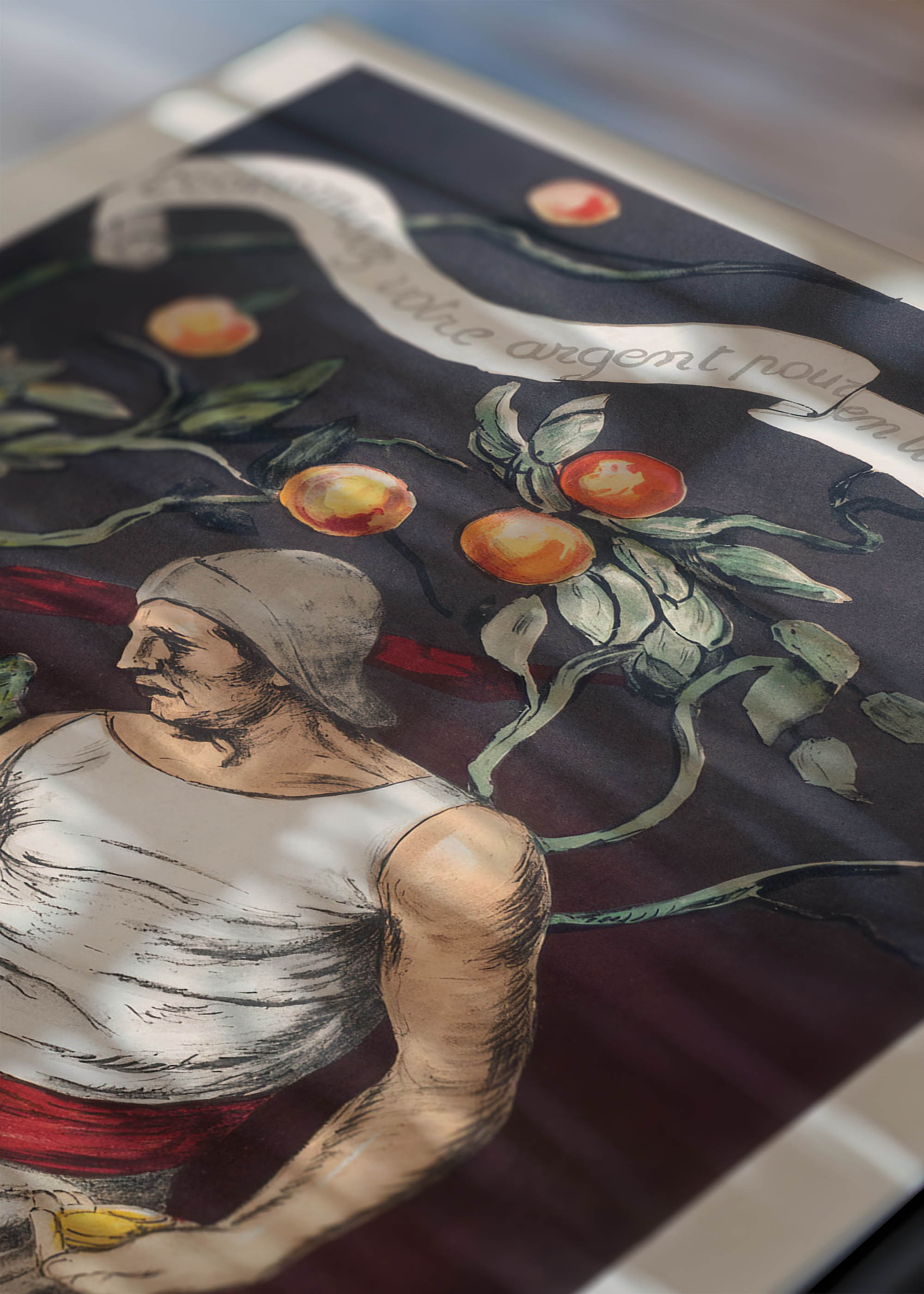 Na plakacie widzimy mężczyznę w tradycyjnym stroju, pochylonego nad doniczką z kwitnącym drzewkiem pomarańczowym. Kompozycja utrzymana jest w stonowanej palecie barw – dominują ciepłe odcienie terakoty i umbry, przełamane bielą stroju kobiety oraz soczyście pomarańczowymi owocami. Tło w grafitowej tonacji podkreśla dramaturgię sceny, podczas gdy czerwień pasa stanowi mocny akcent kolorystyczny. Wstęga z francuskim tekstem unosi się niczym dym, nadając całości poetycki charakter.