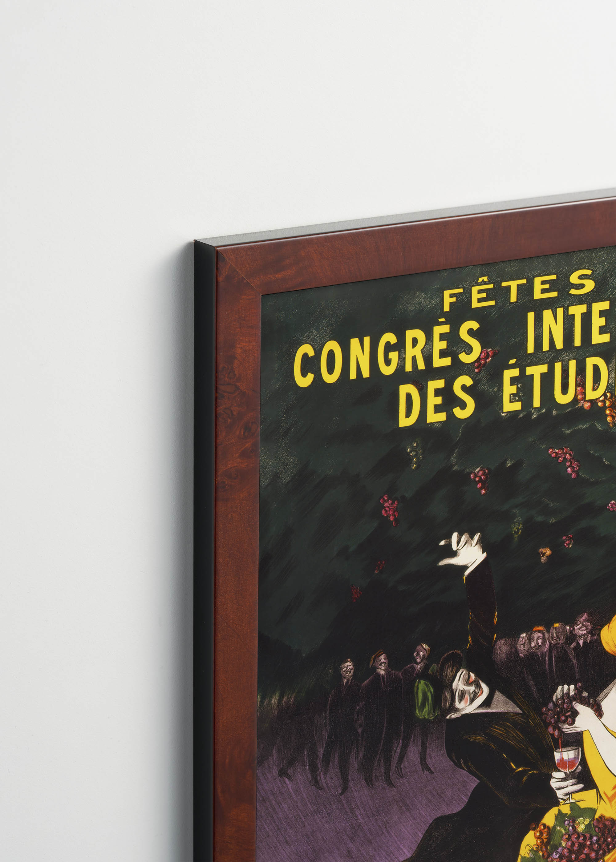 Dominującą postacią jest tańcząca para – elegancki mężczyzna w czarnym fraku i kobieta w żółtej sukni o barwie dojrzałego słonecznika. Jej strój kontrastuje z głęboką czernią partnera, tworząc niezwykle efektowną kompozycję. W tle widać sylwetki innych uczestników balu, a nad nimi unoszą się kiście winogron – oczywiste nawiązanie do winiarskich tradycji Bordeaux. Kolorystyka opiera się na kontrastach: intensywna żółć cytrynowa przechodzi w pomarańczowe tony, fioletowe podłoże przypomina barwę dojrzałych winogron, a całość dopełnia butelkowa zieleń tła.