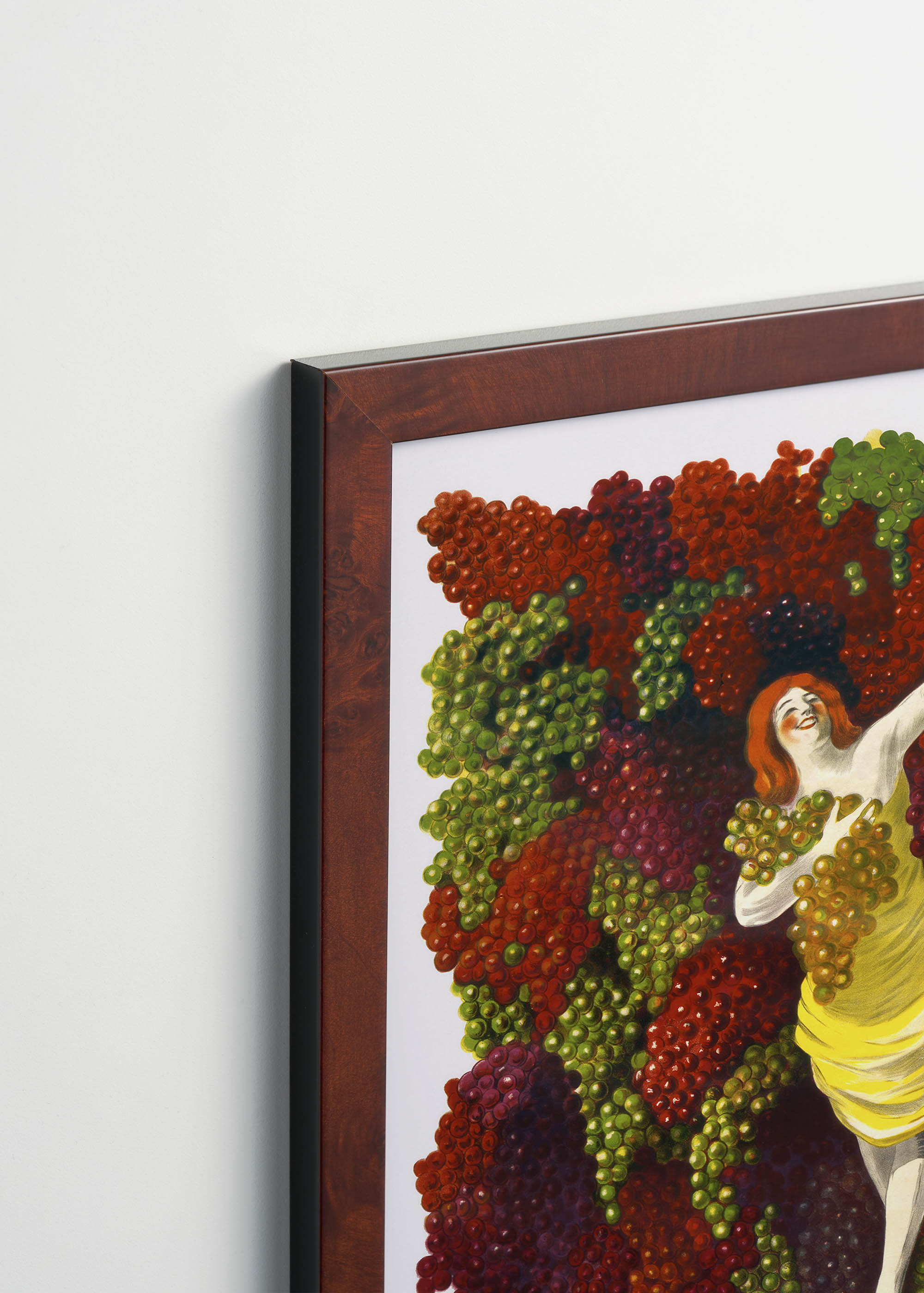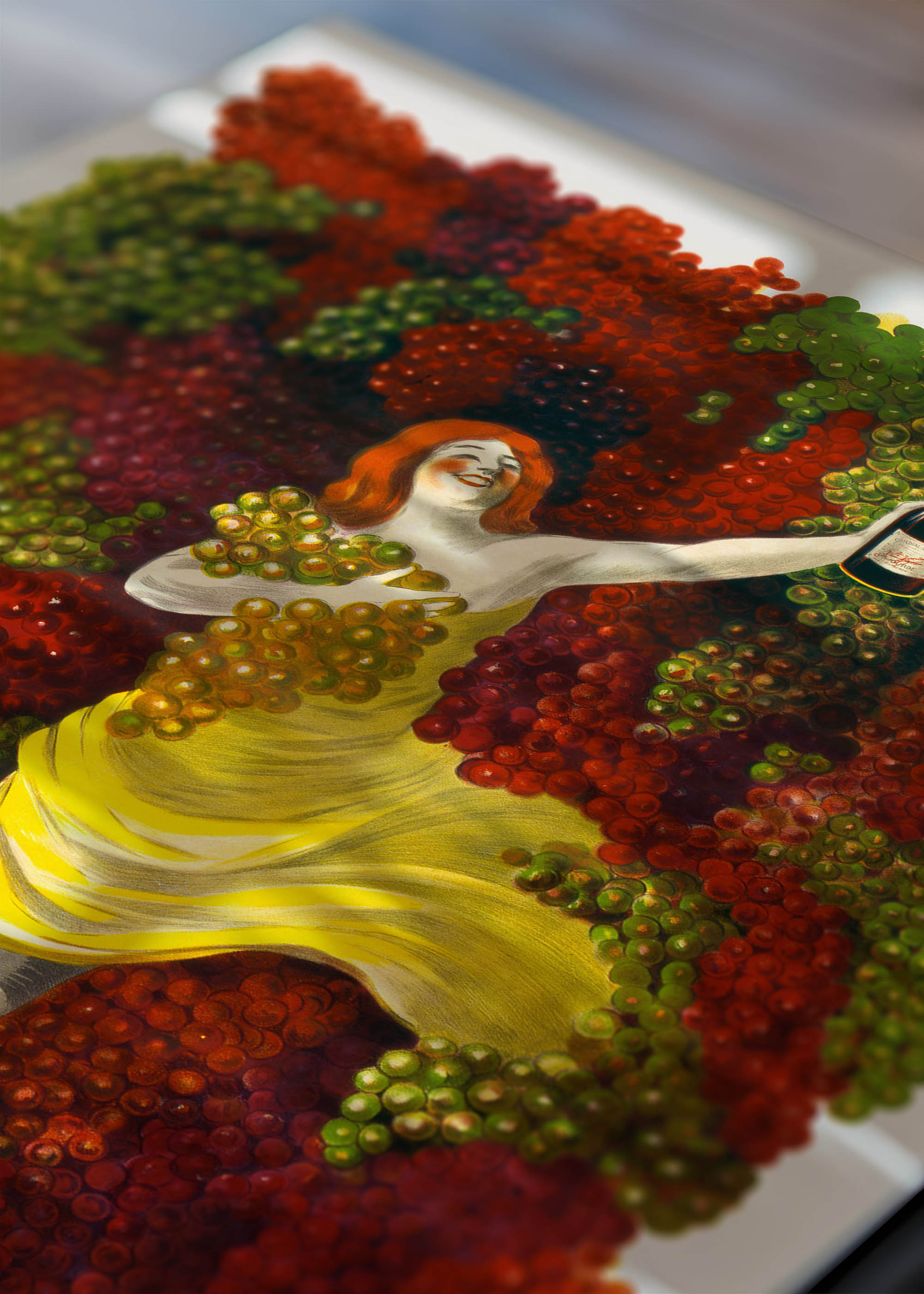 Kolorystyka dzieła to prawdziwa uczta dla oczu – soczyste tony szmaragdowej zieleni mieszają się z głęboką karminową czerwienią i ciepłymi odcieniami zbliżonymi do sieny palonej. Żółty cytrynowy sukni tancerki tworzy świetlisty akcent, kontrastując z rubinowymi i burgundowymi gronami. Ta paleta barw oddaje bogactwo francuskich winnic i słodycz likierów z regionu Médoc.