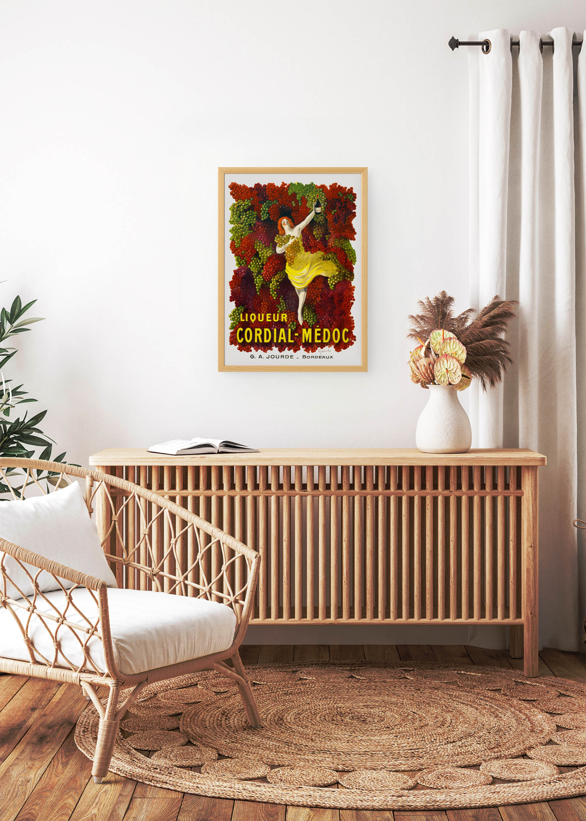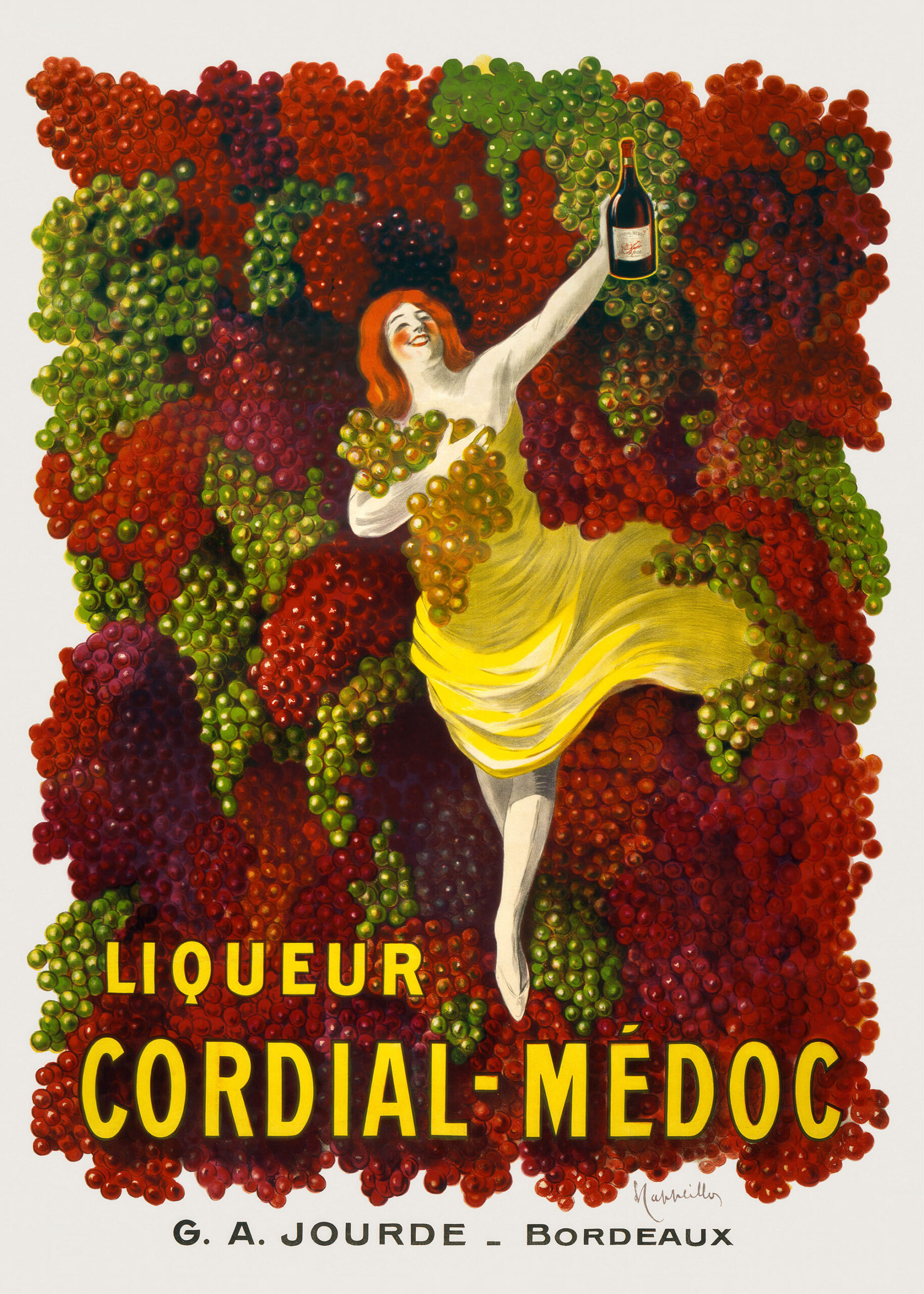 Plakat „Liqueur Cordial-Médoc” autorstwa Leonetto Cappiello to prawdziwe arcydzieło francuskiej sztuki reklamowej z początku XX wieku. Stworzony około 1905 roku dla bordeaux’skiej firmy G.A. Jourde, ten niezwykły afisz przedstawia radosną postać kobiety unoszącej się wśród kaskady winogron. Cappiello, zwany „ojcem nowoczesnego plakatu reklamowego”, zrewolucjonizował świat reklamy, odchodząc od detalicznych ilustracji na rzecz dynamicznych, zapadających w pamięć kompozycji.