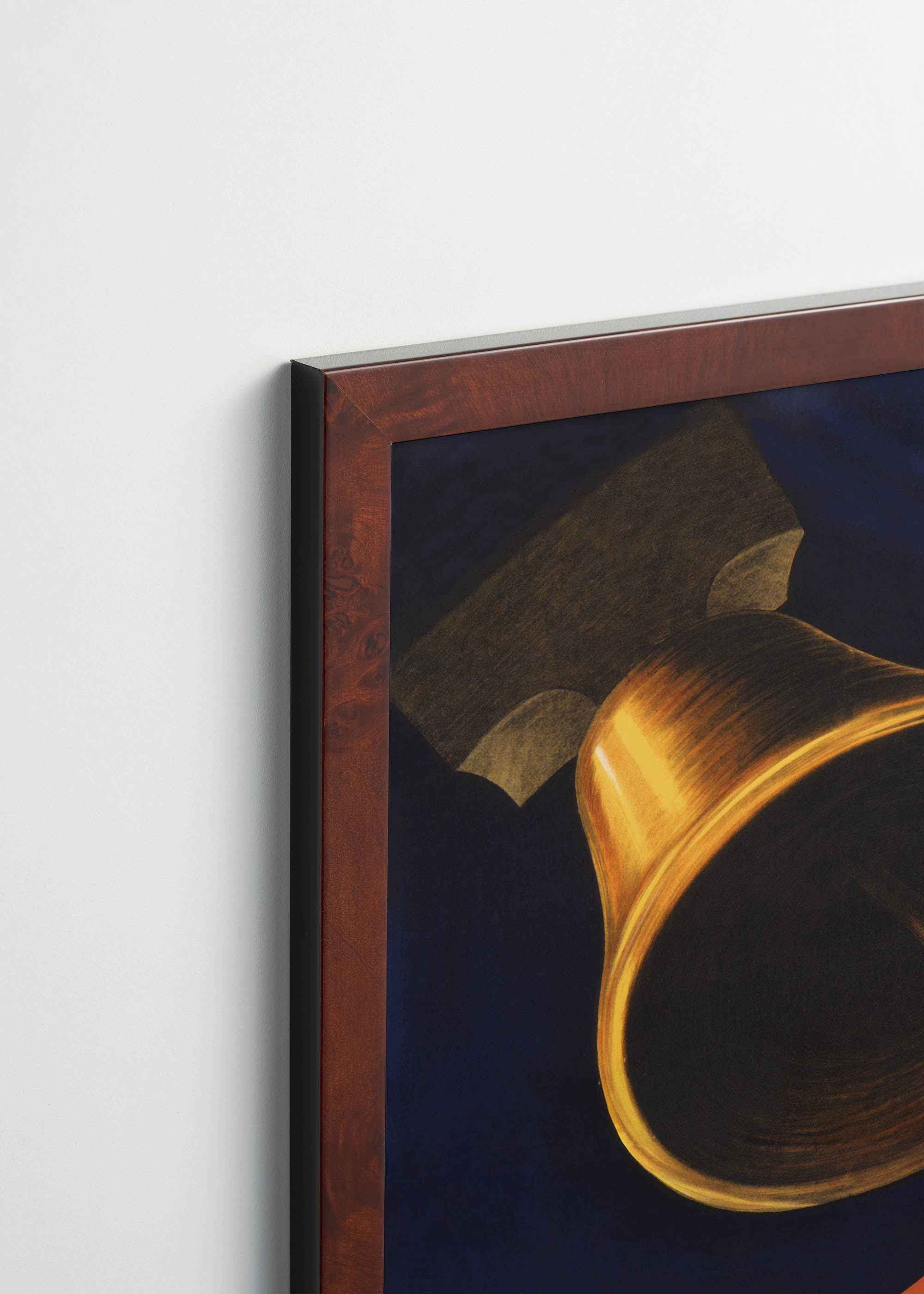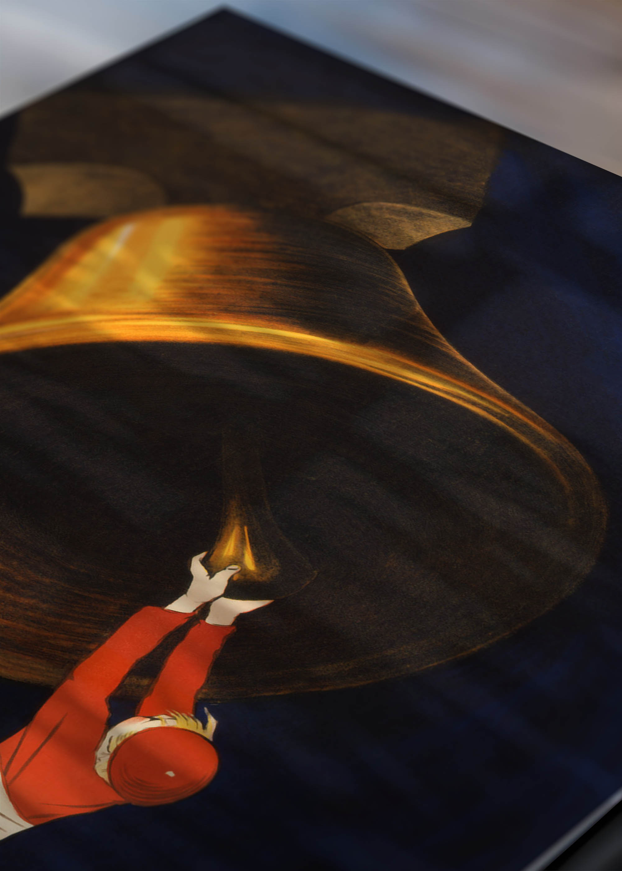 Kompozycja zachwyca swoją teatralnością – widzimy postać w szkarłatnej szacie, która z gracją unosi się ku ogromnej, złocistej czarze dzwonu. Barwy są niezwykle wyraziste: dominująca kobaltowa głębia tła kontrastuje z ciepłymi, miodowymi tonami dzwonu oraz intensywną czerwienią habitu zbliżoną do cynobru. Ten kontrast kolorystyczny był znakiem rozpoznawczym Cappiella, który jako pierwszy zrezygnował z realistycznego przedstawiania produktów na rzecz symbolicznych, zapadających w pamięć obrazów.