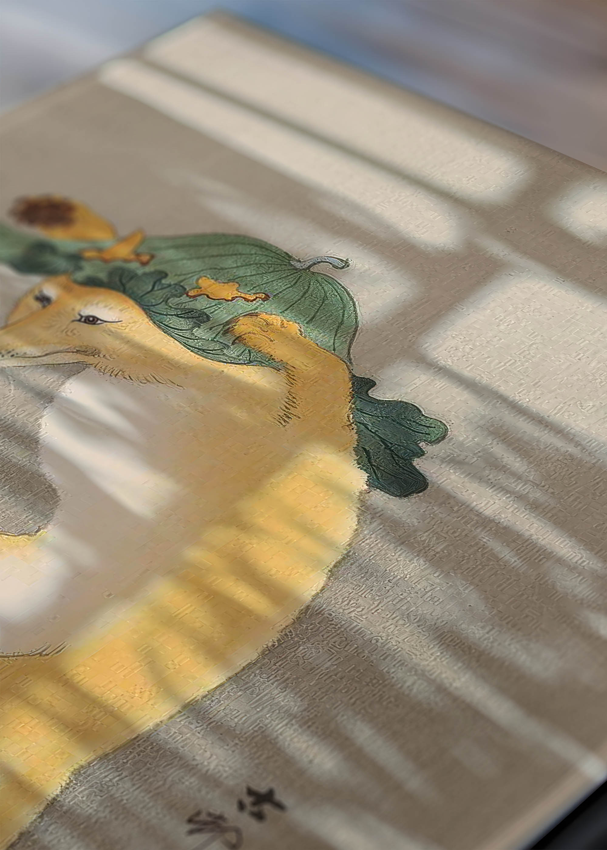 Na plakacie widzimy wyjątkowo czarującą scenę – złocistego lisa kroczącego na tylnych łapach, dzierżącego nad głową szmaragdowy kapelusz (pełniący funkcję parasolki), wykonany z wielkiego liścia. Kolorystyka dzieła opiera się na delikatnych, ciepłych tonach – dominuje tutaj bursztynowa żółć przechodząca w kremową biel na brzuchu zwierzęcia, kontrastująca z chłodną zielenią parasola w odcieniu zbliżonym do patynowanej miedzi. Tło utrzymane jest w stonowanych, piaskowych barwach, które nadają całości spokojnego, niemal medytacyjnego charakteru.