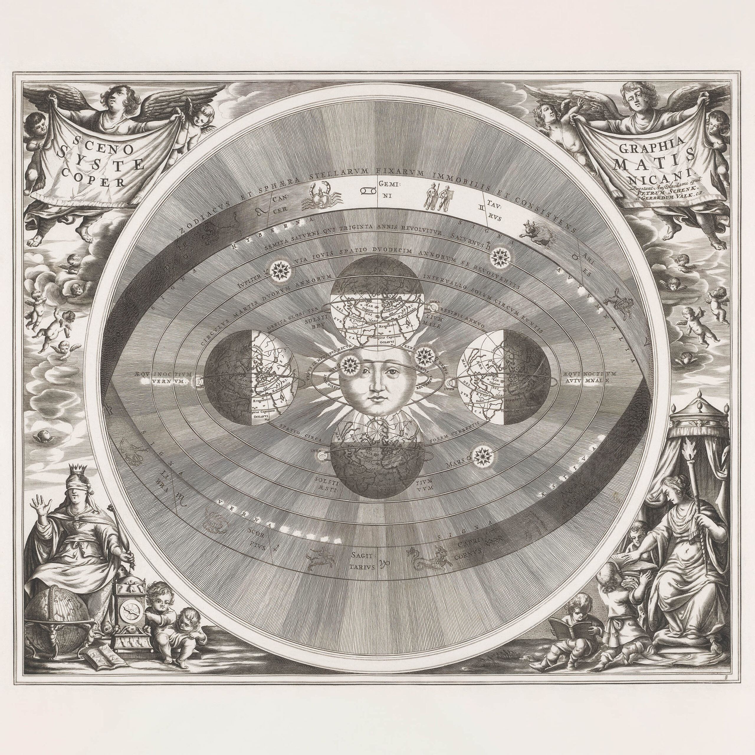 Ten niezwykły czarno-biały plakat to reprint XVII-wiecznej mapy nieba przedstawiającej heliocentryczny model Układu Słonecznego według teorii Mikołaja Kopernika. Dzieło powstało prawdopodobnie w latach 1660-1661 i stanowi wspaniały przykład barokowej kartografii astronomicznej, łączącej naukową precyzję z kunsztem artystycznym. W centrum kompozycji widnieje Słońce z charakterystycznym ludzkim obliczem, wokół którego krążą planety na kolejnych orbitach, co było rewolucyjnym przedstawieniem kosmosu w tamtych czasach.