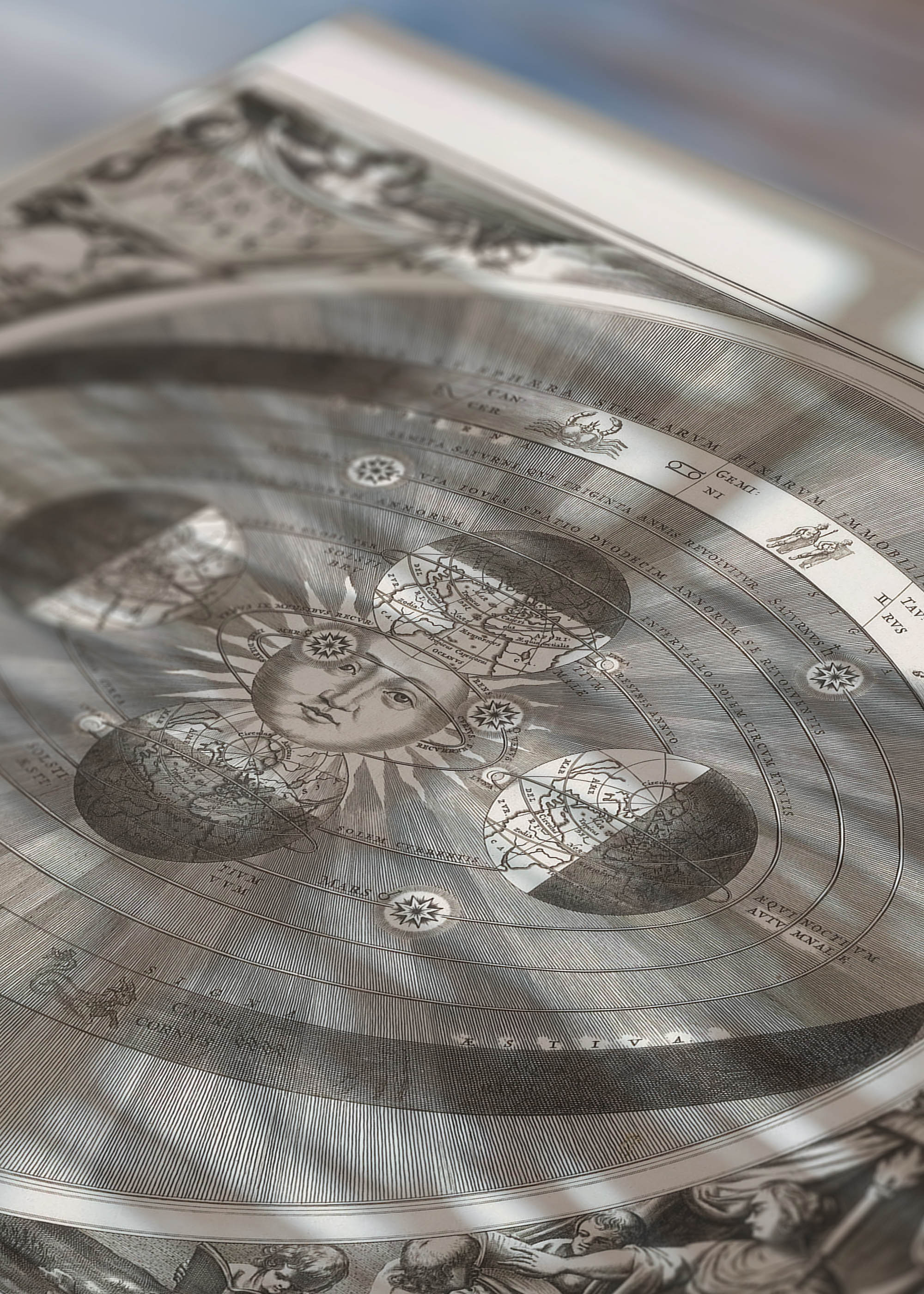 Plakat zachwyca wyrafinowaną paletą barw zbliżonych do sepii i kości słoniowej, z subtelnymi akcentami grafitowej szarości. Delikatne cieniowanie nadaje głębi koncentrycznym okręgom, podczas gdy mistrzowsko wyryte detale – od alegorycznych postaci w narożnikach po precyzyjne linie orbit – tworzą hipnotyzujący efekt wizualny. Całość utrzymana jest w tonacji monochromatycznej, typowej dla rycin miedziorytniczych epoki.